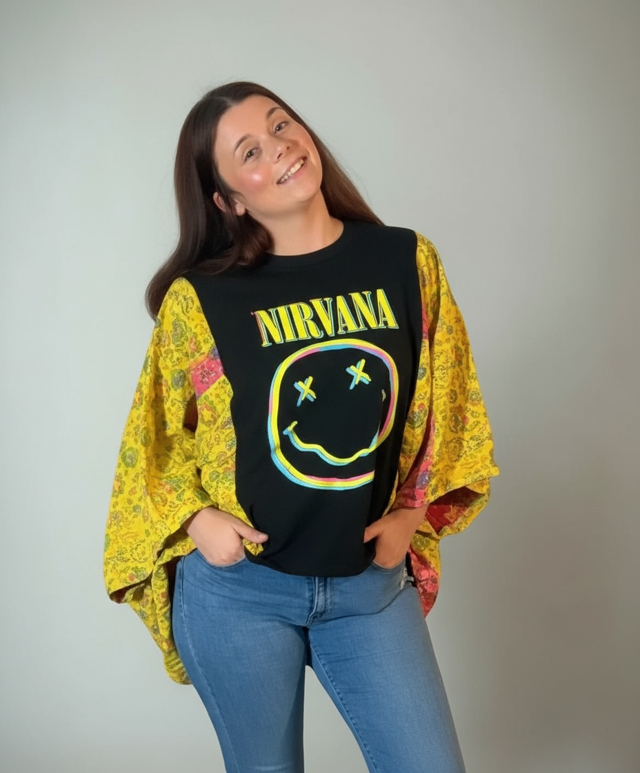 Aerosmith Upcycled Vintage Kantha Poncho Tee Fits A Small to XXL Comfortably