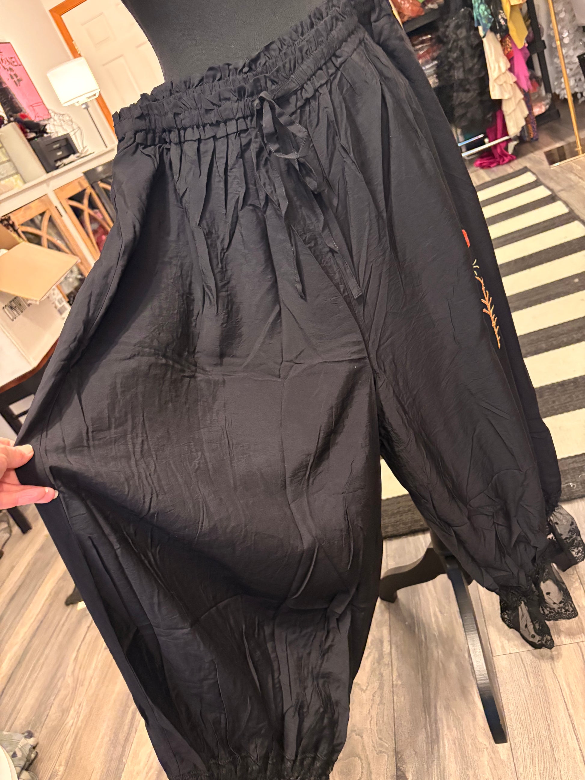 Beautiful lace trimmed bloomers!! The most comfortable pants EVER! Super lightweight and flowy!! Red Rose soft vinyl graphic. Have a drawstring at elastic waist.