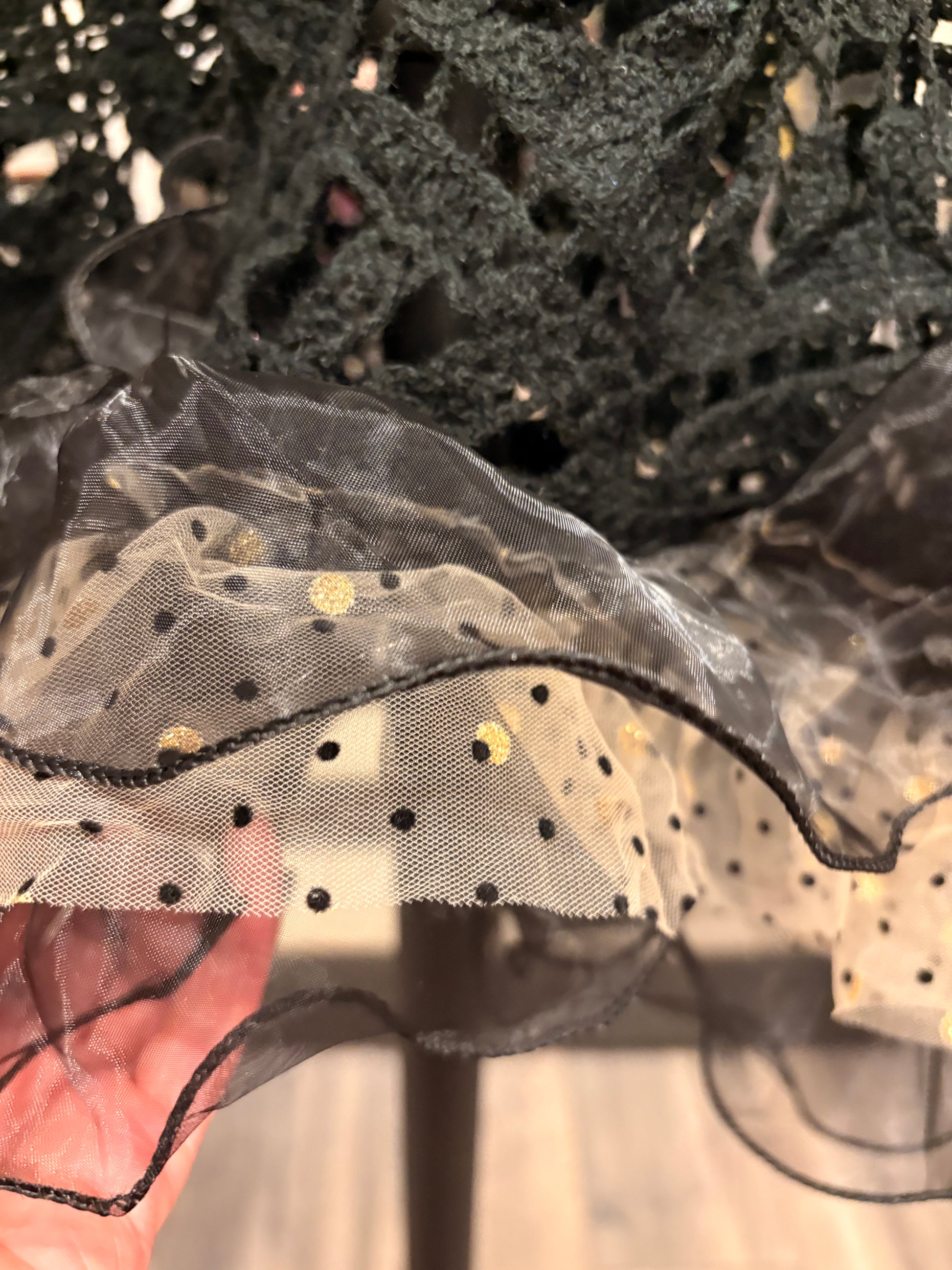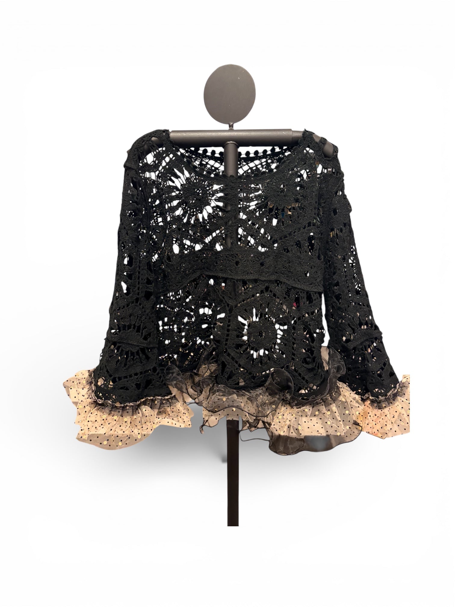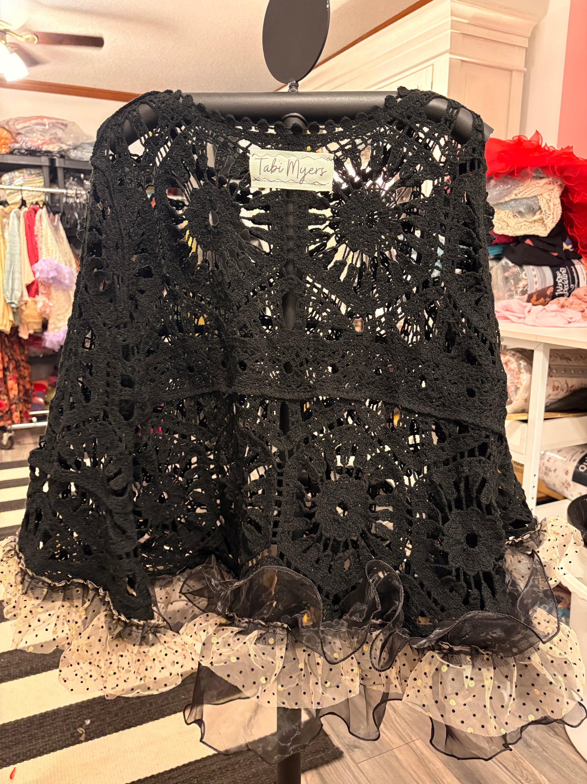 Upcycled crochet sweater and black tulle ruffle and gold and black ruffle used to make this absolutely breathtaking sweater!!!