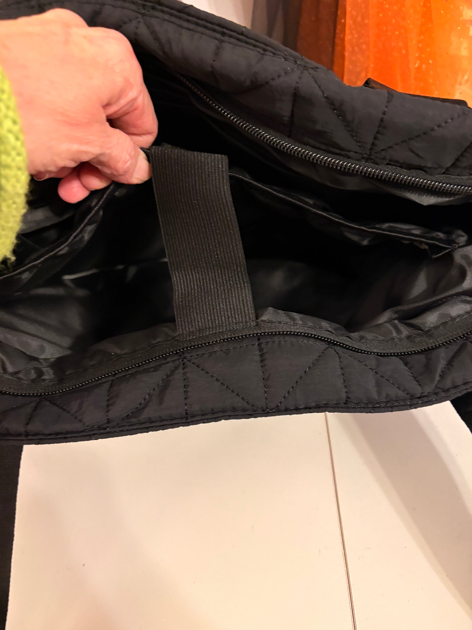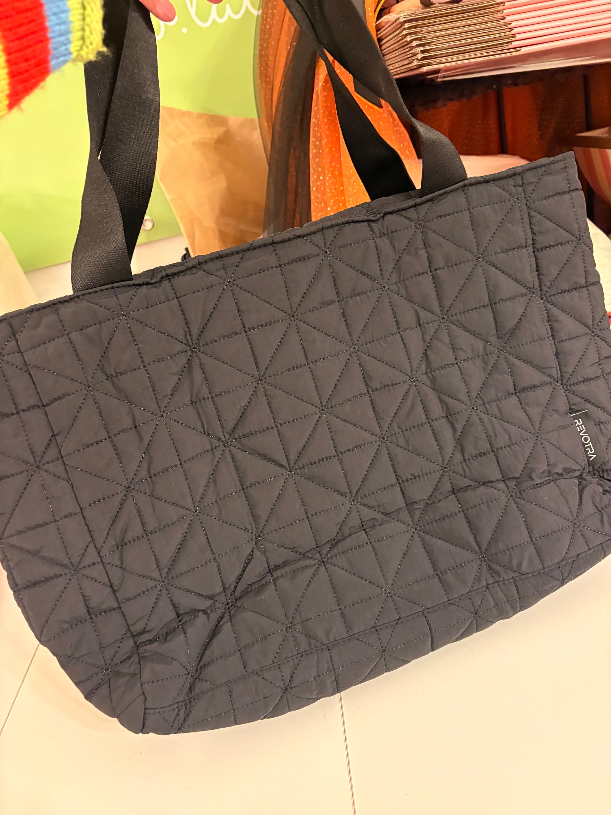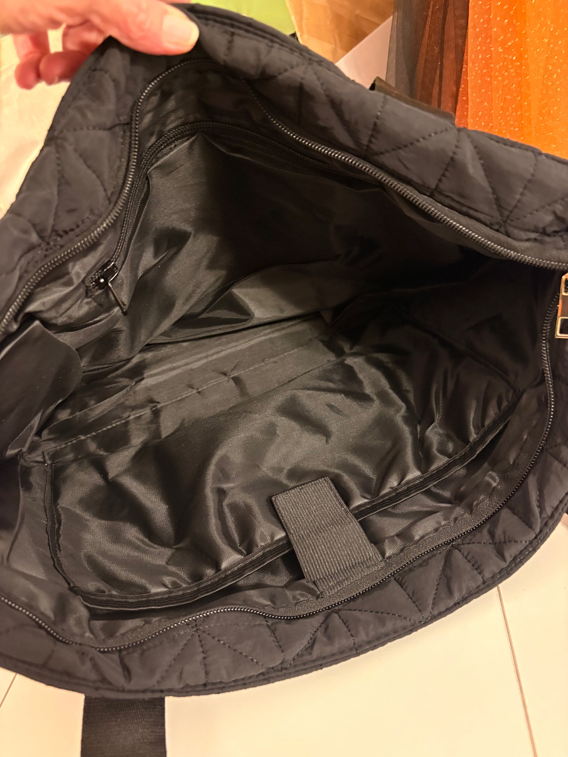 The perfect tote for EVERYTHING!! Makes a terrific Bible tote, can hold a tablet, and just about anything else you need. Quilted black waterproof fabric.  Nice women straps, zipper closure.