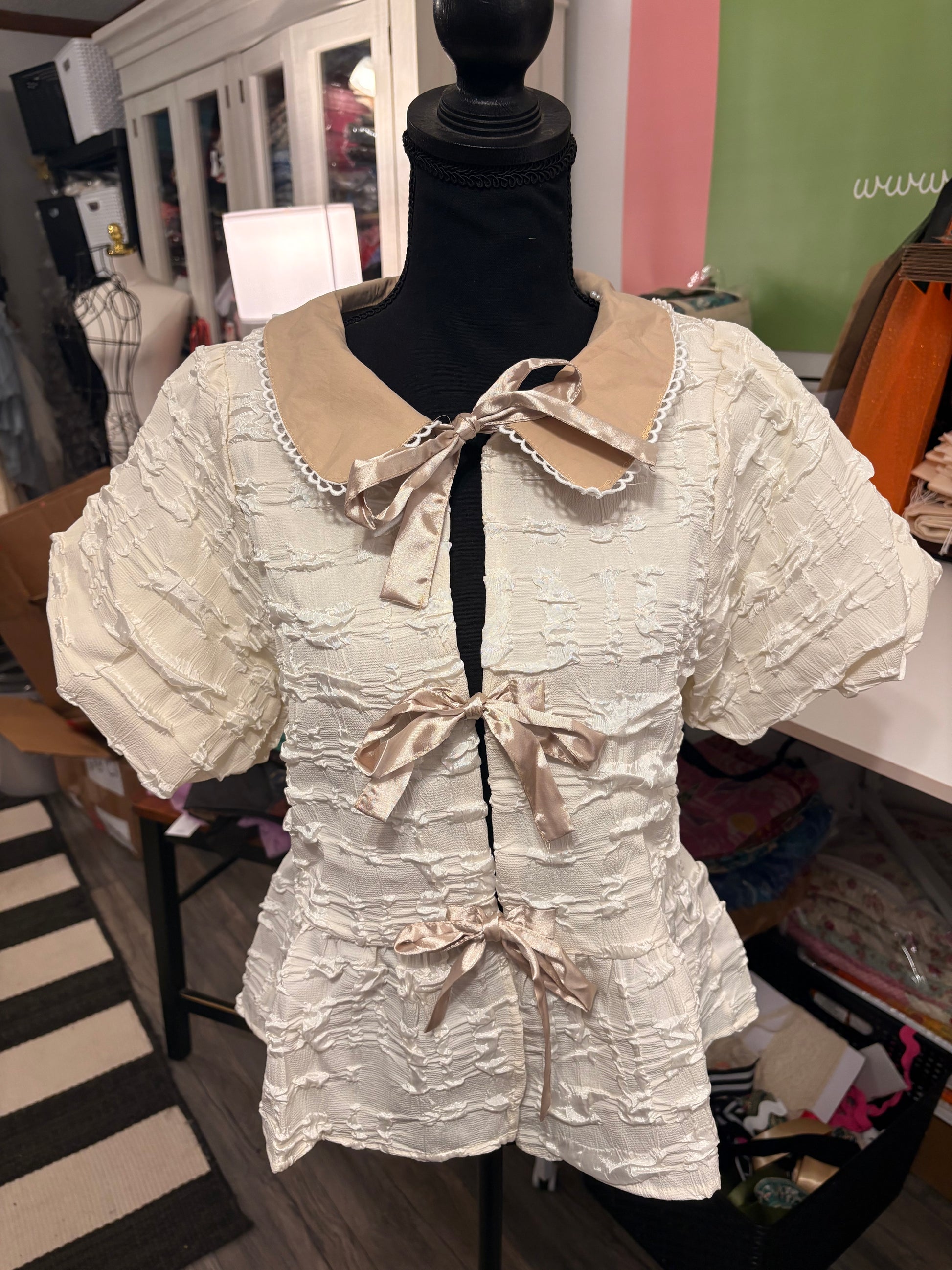 This one WOWED us!! Gorgeous crinkle textured cream fabric, satin ribbon from ties, Peter Pan collar that can be removed and ruffled waist. ABSOLUTELY BEAUTIFUL!! Lined… Brand is Umgee.