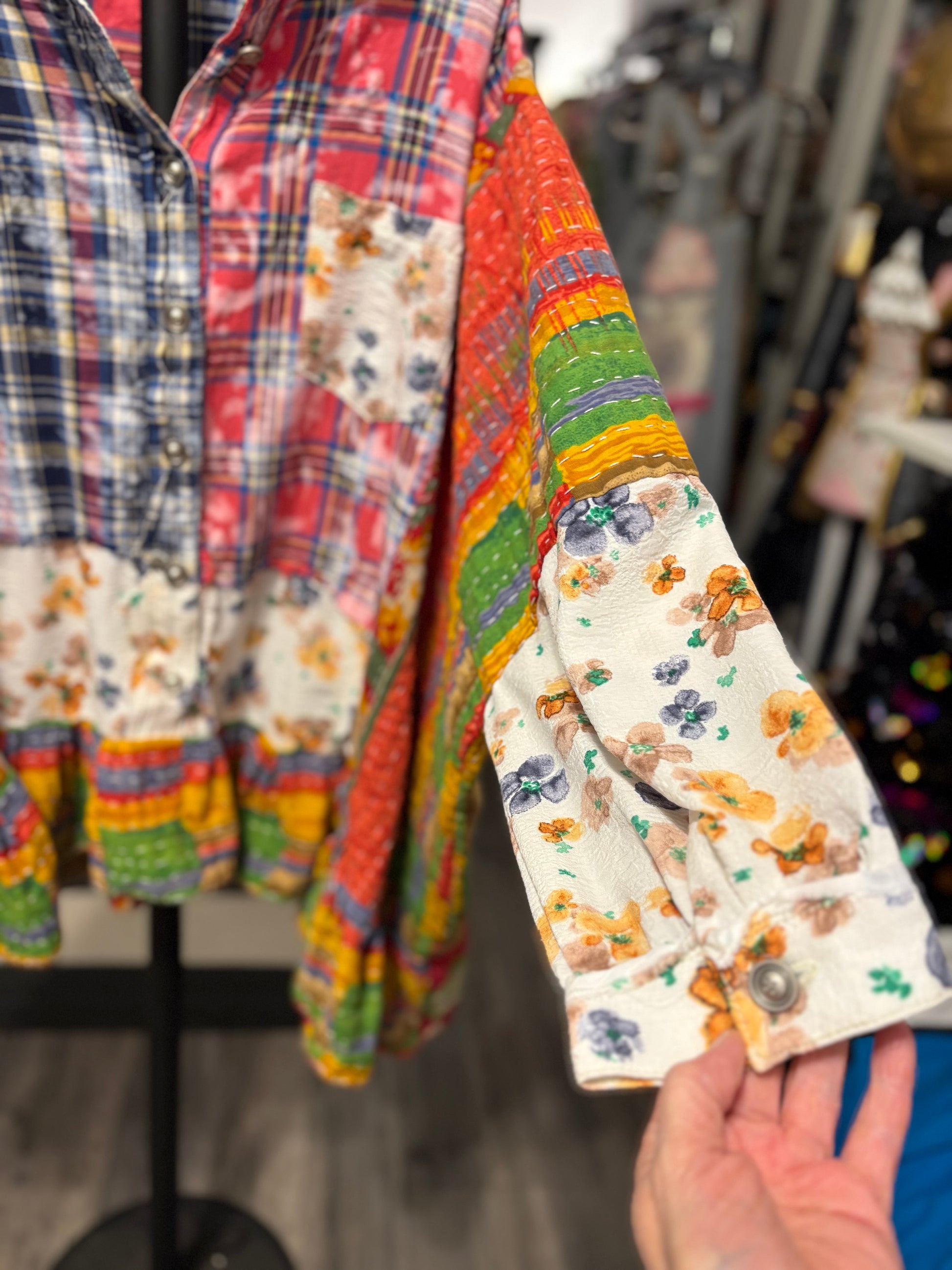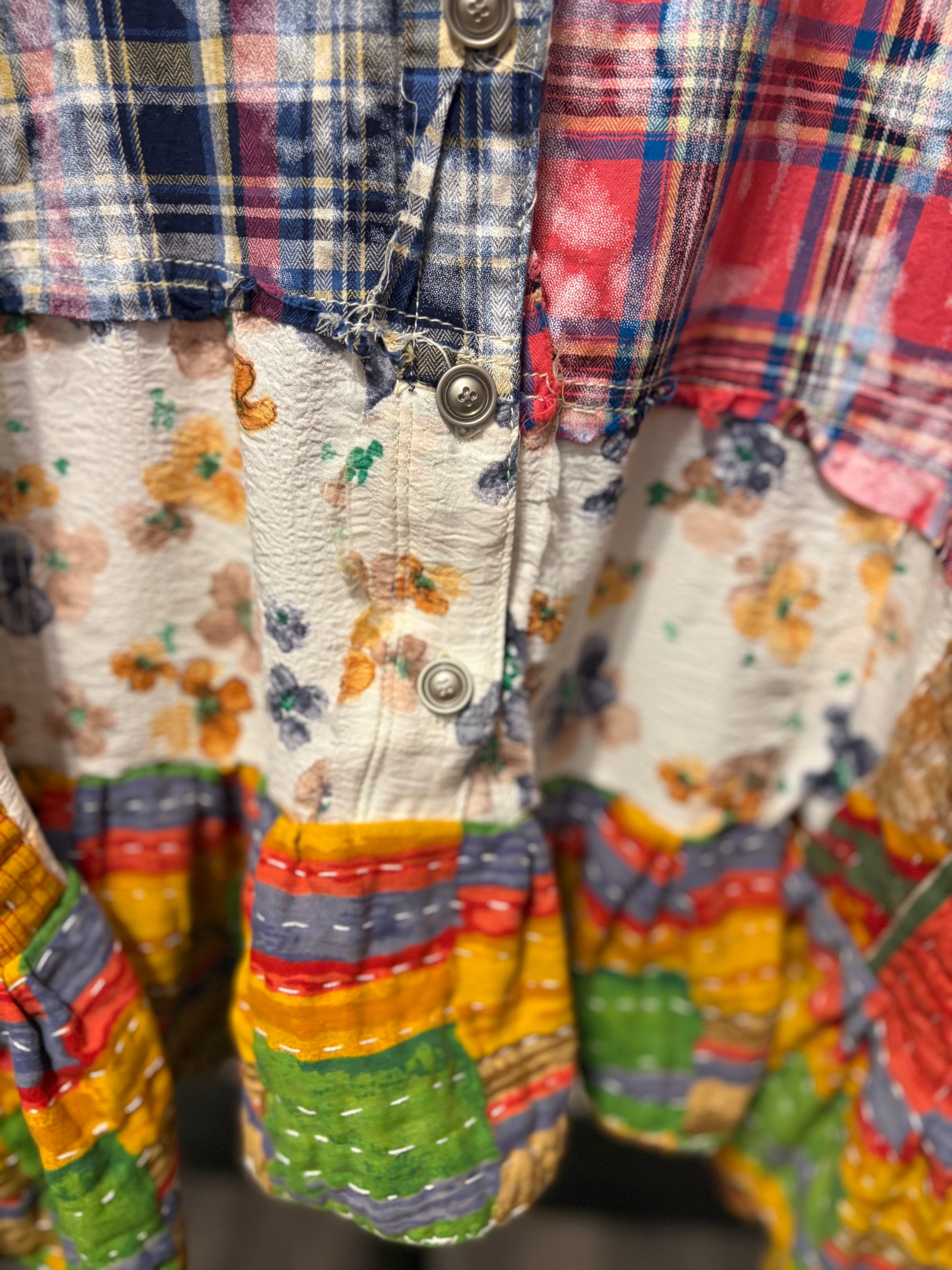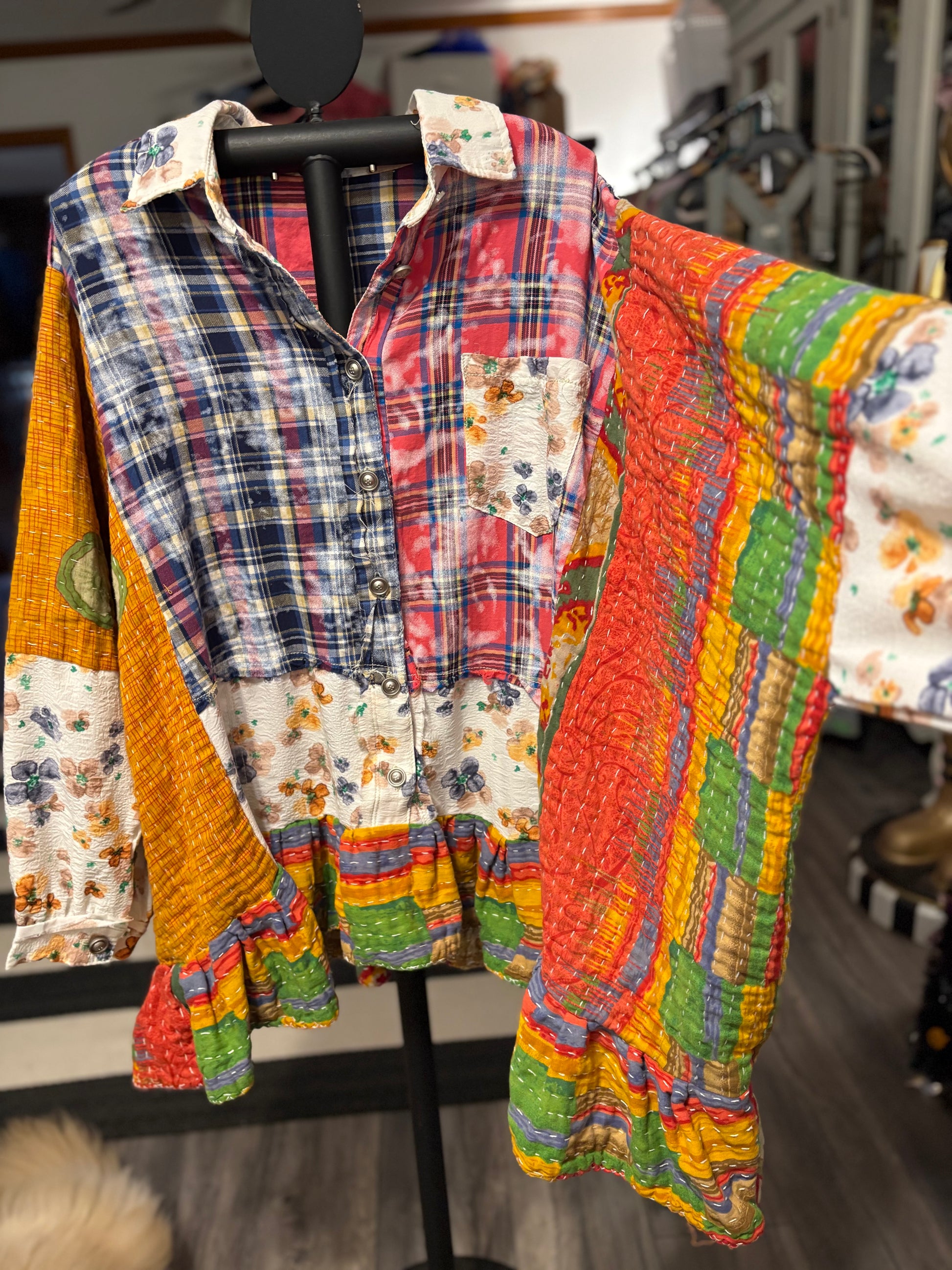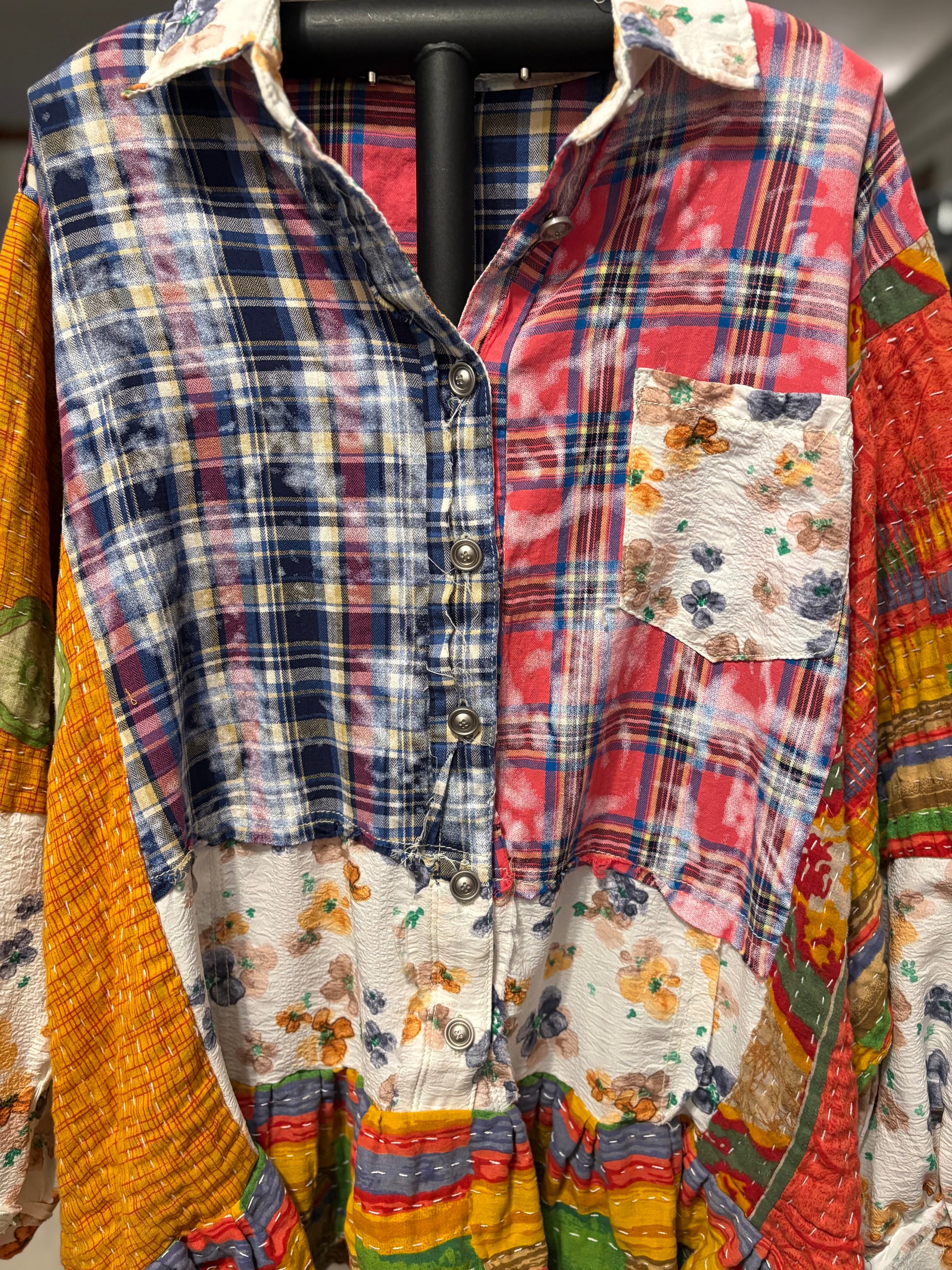Upcycled patchwork button down, and vintage Kantha quilt used to create this gorgeous top! This top is part of the Love, Tabi Collection.. it is handmade, one of a kind and original design! It will be more oversized the smaller you are. Please check measurements before purchasing!!!!***** ONE SIZE FITS MOST Very OVERSIZED!!! Asymmetrical ruffle flowy and flirty hem!!!