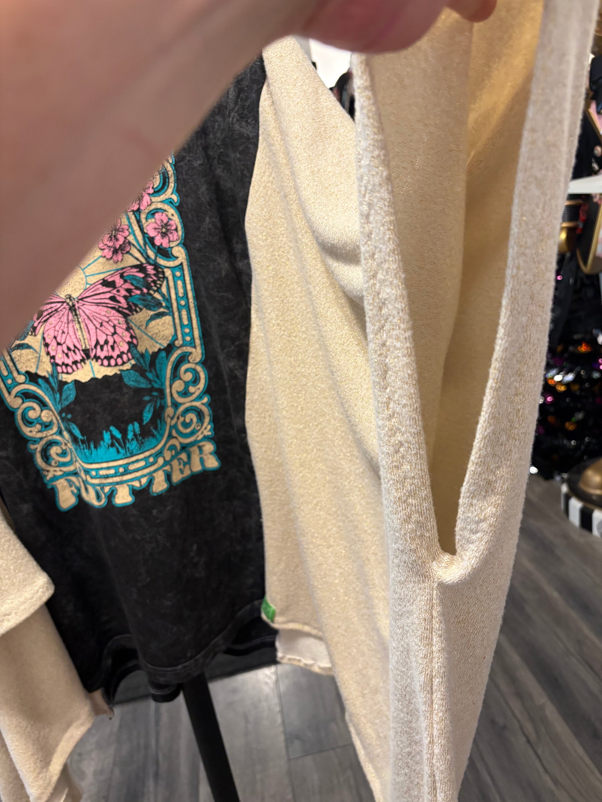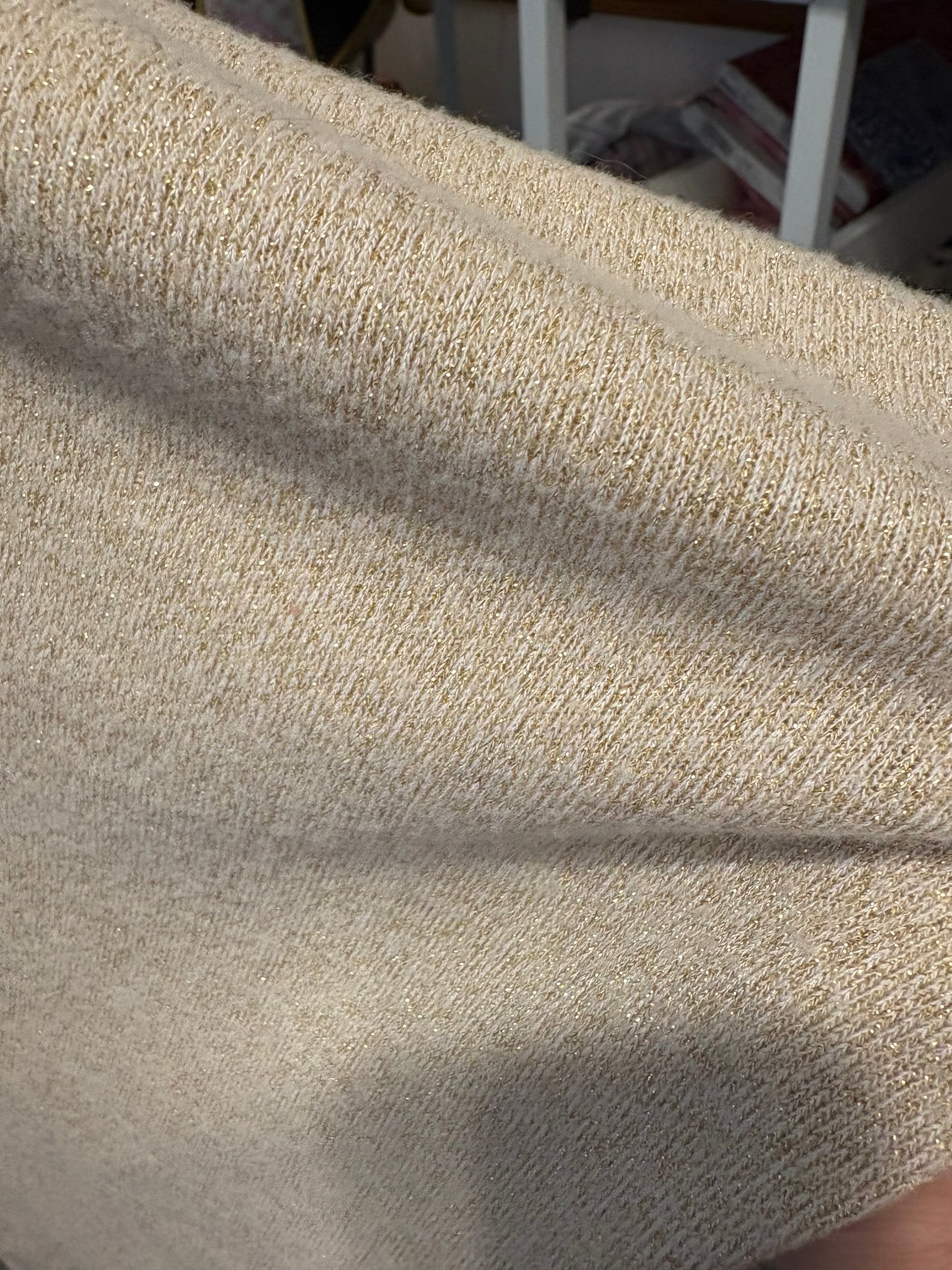 Sleeves are made from a gold threaded cream sweater knit fabric…