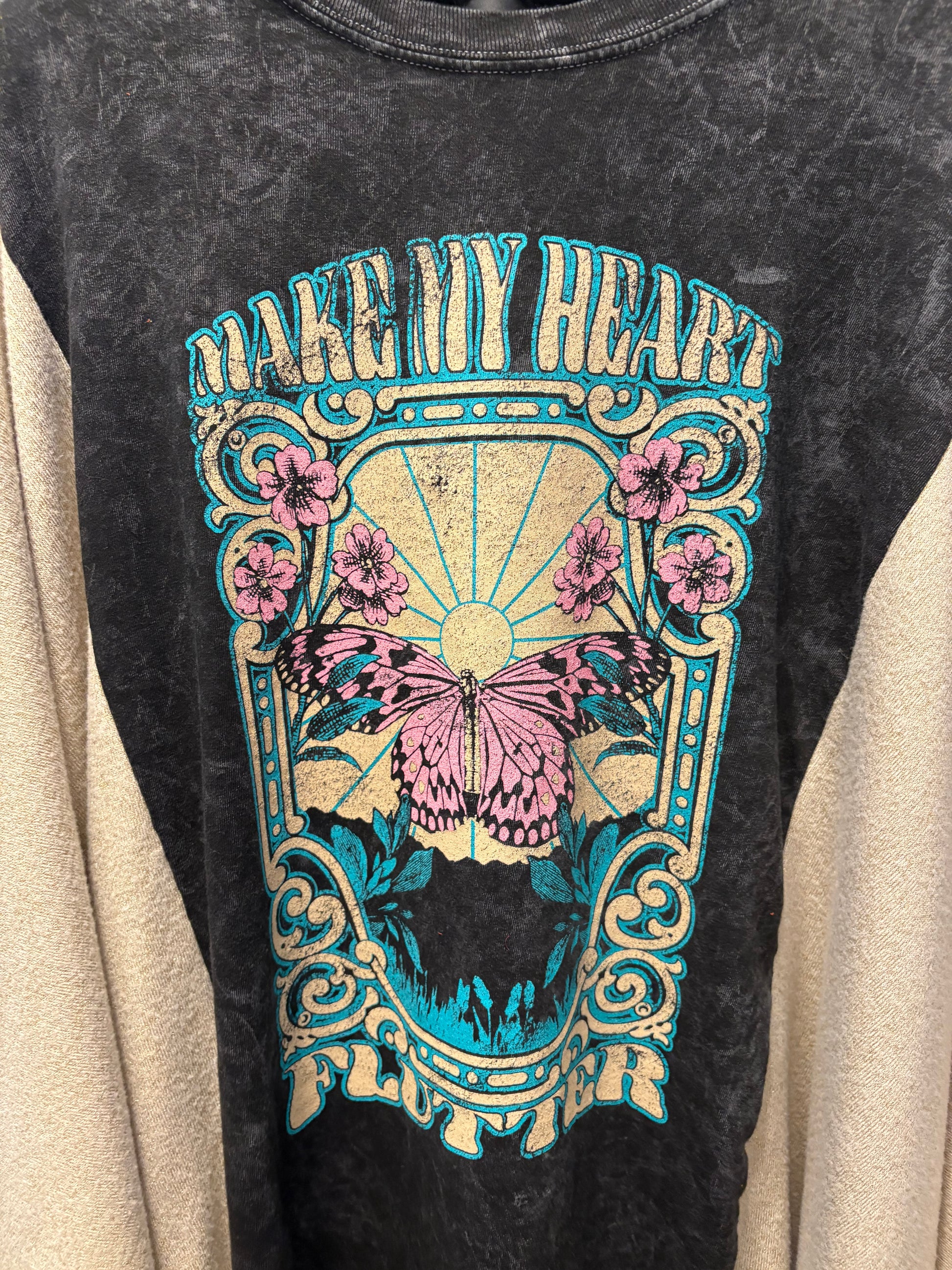 This unique drop sleeve top combines a vintage or upcycled fabric with a graphic tee design to create a sustainable, one-of-a-kind piece. With a relaxed oversized silhouette and long drop sleeves, it’s a comfortable and stylish layering option for casual outfits, streetwear, or cozy lounge looks.