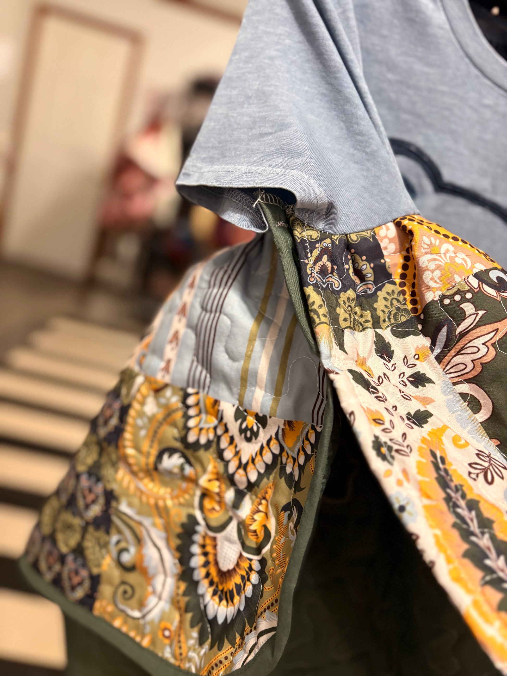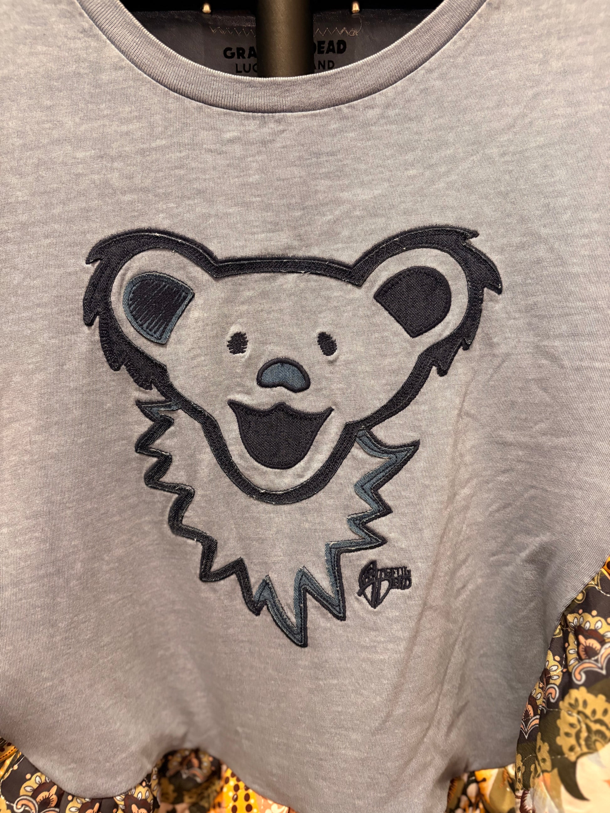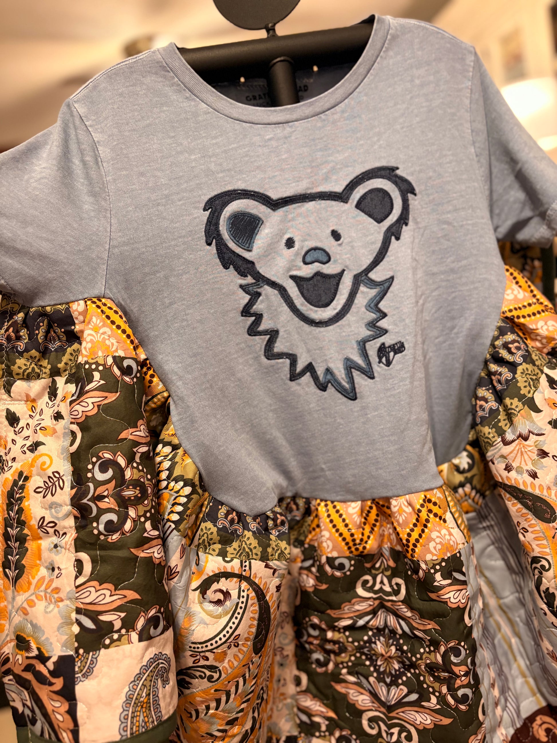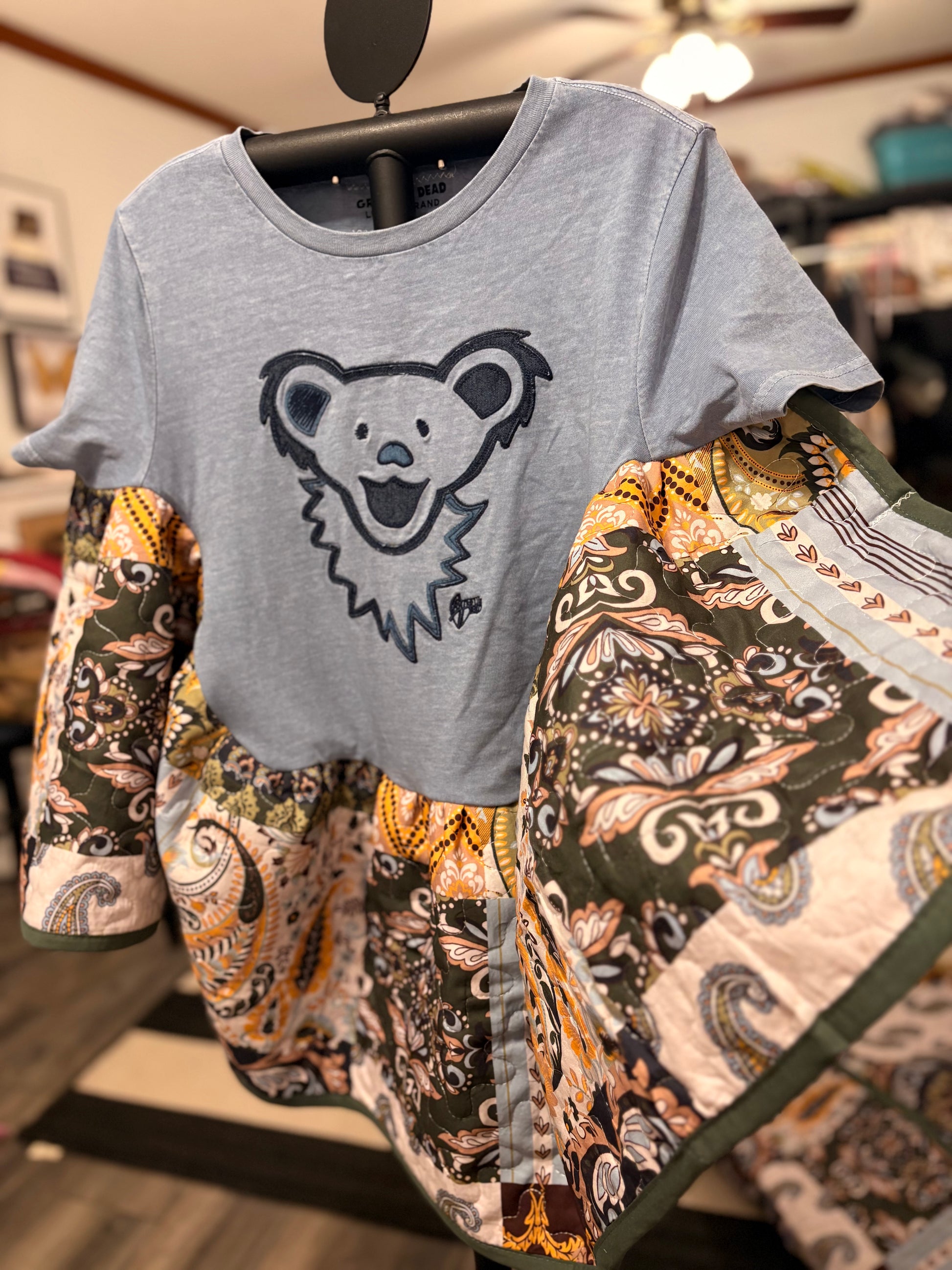 Original Tabi designed graphic tee and quilted fabric used to make this beautiful circle shaped ruffled poncho. Oversized and GORGEOUS poncho! Super cute and cozy!! Perfect for Winter, Spring and Fall. Tee used is an XS. ****Sides are open with small stitches on each to side for arms to go through…*****