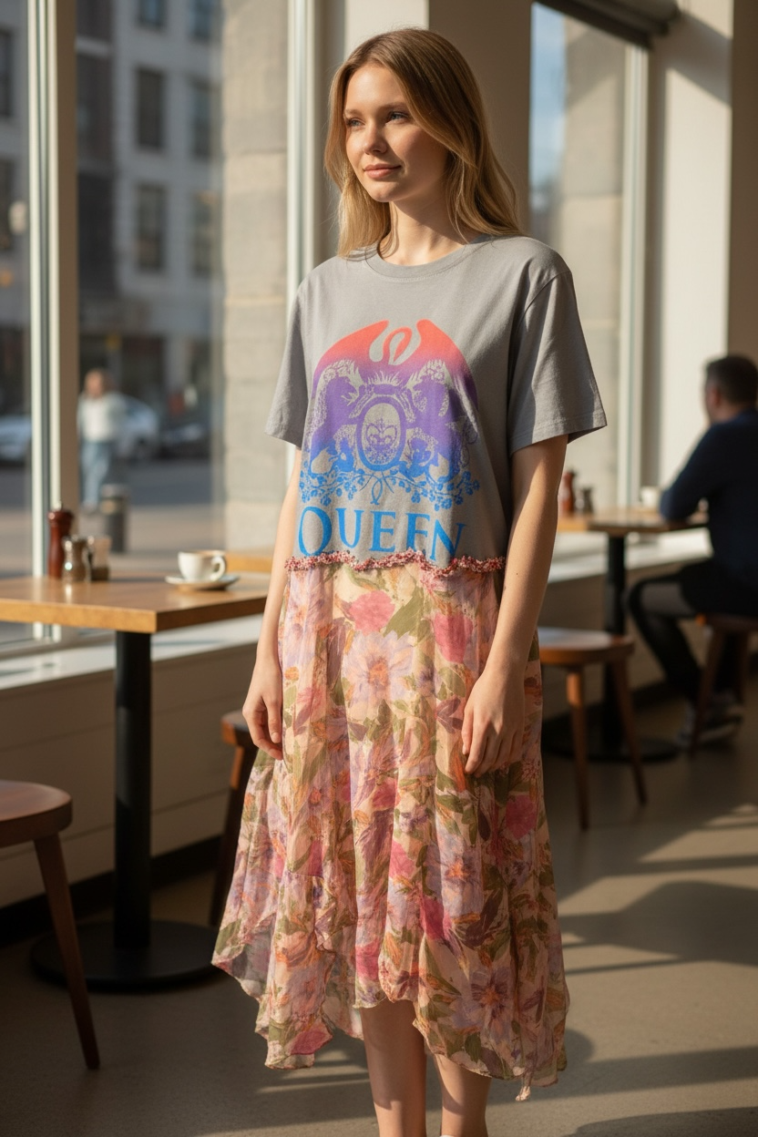 Upcycled graphic tee and layered ballerina floral skirt with embroidered trim waist used to make this FABULOUS ROCKSTAR and Fairytales Dress. Looks great with absolutely everything! You will ROCK this!!!❤️