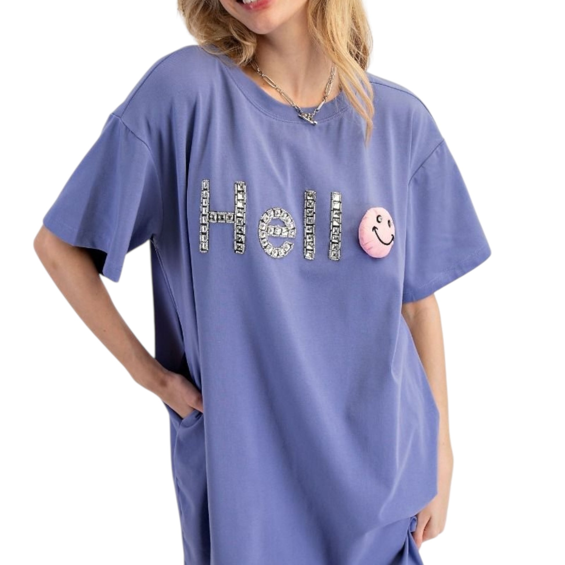 - BEDAZZLED "HELLO" FRONT DESIGN WITH ATTACHED SMILEY