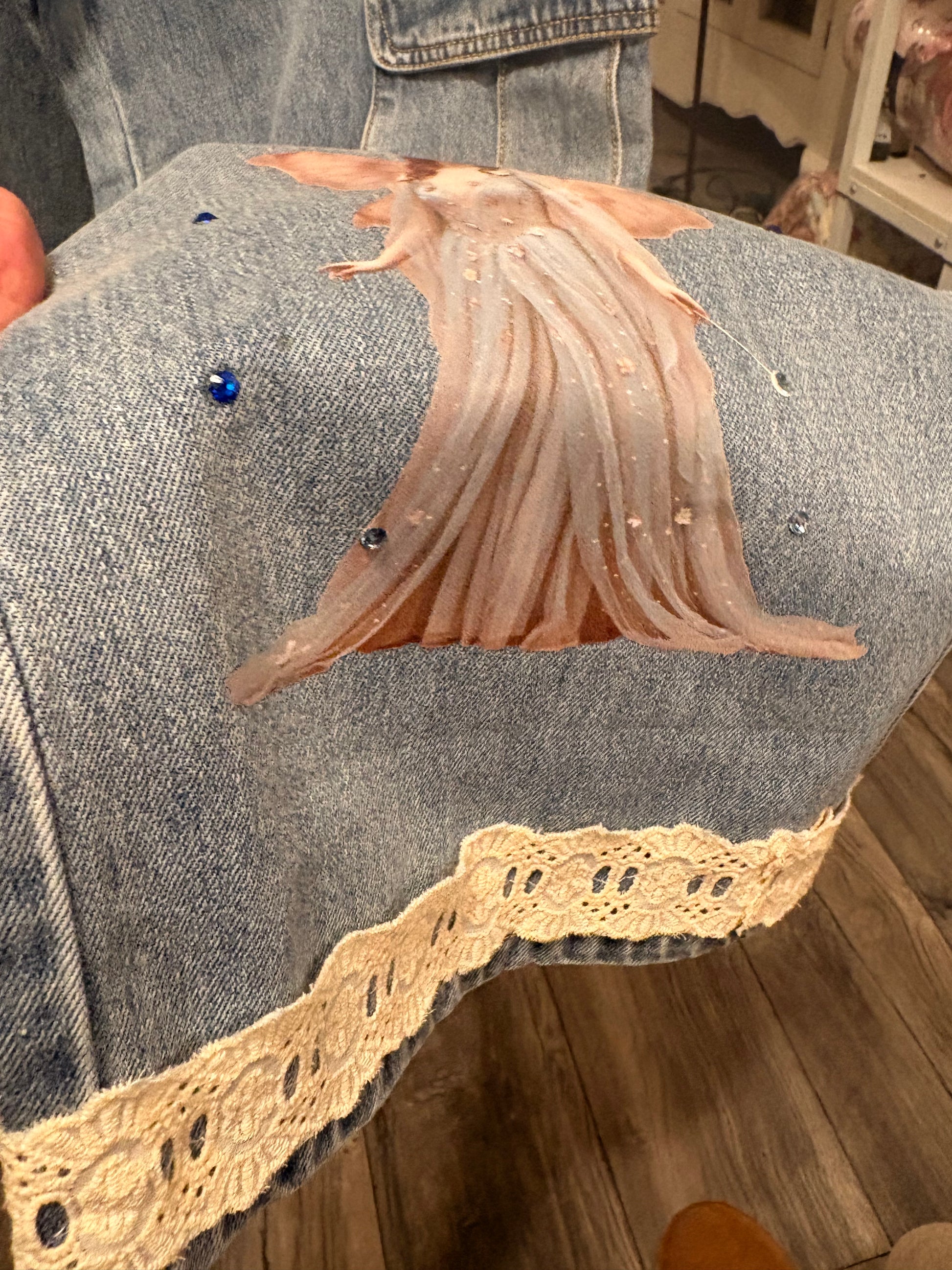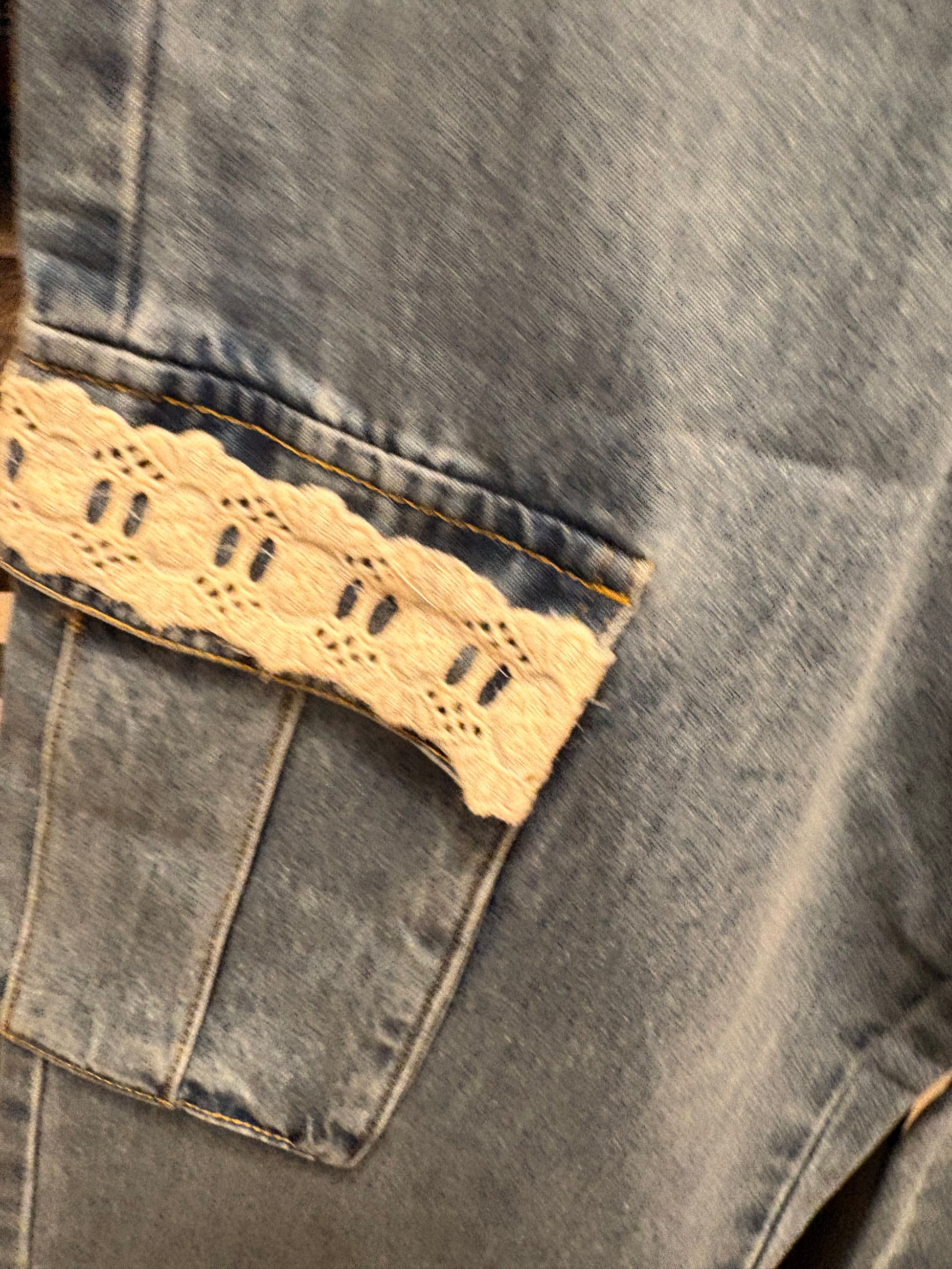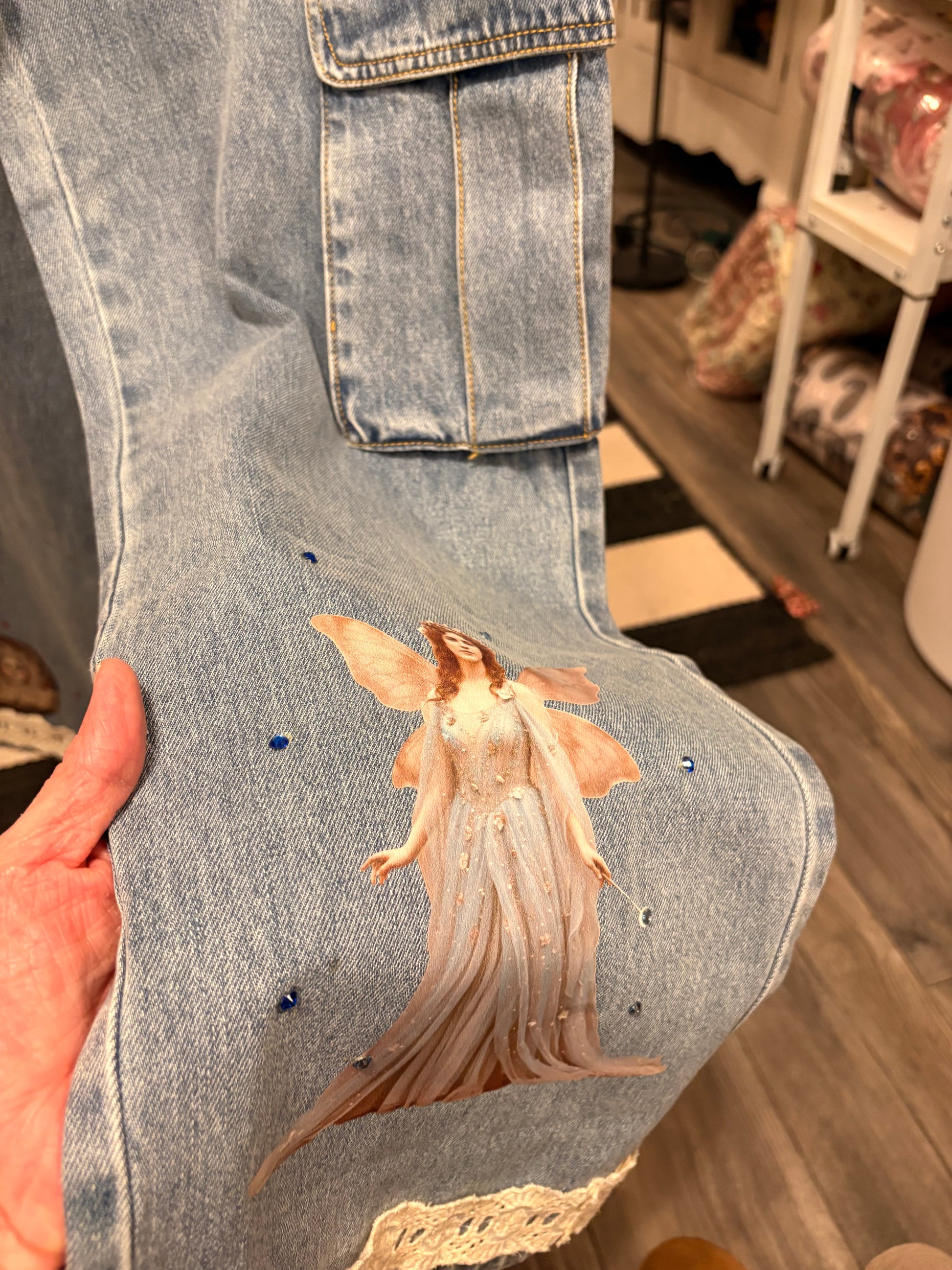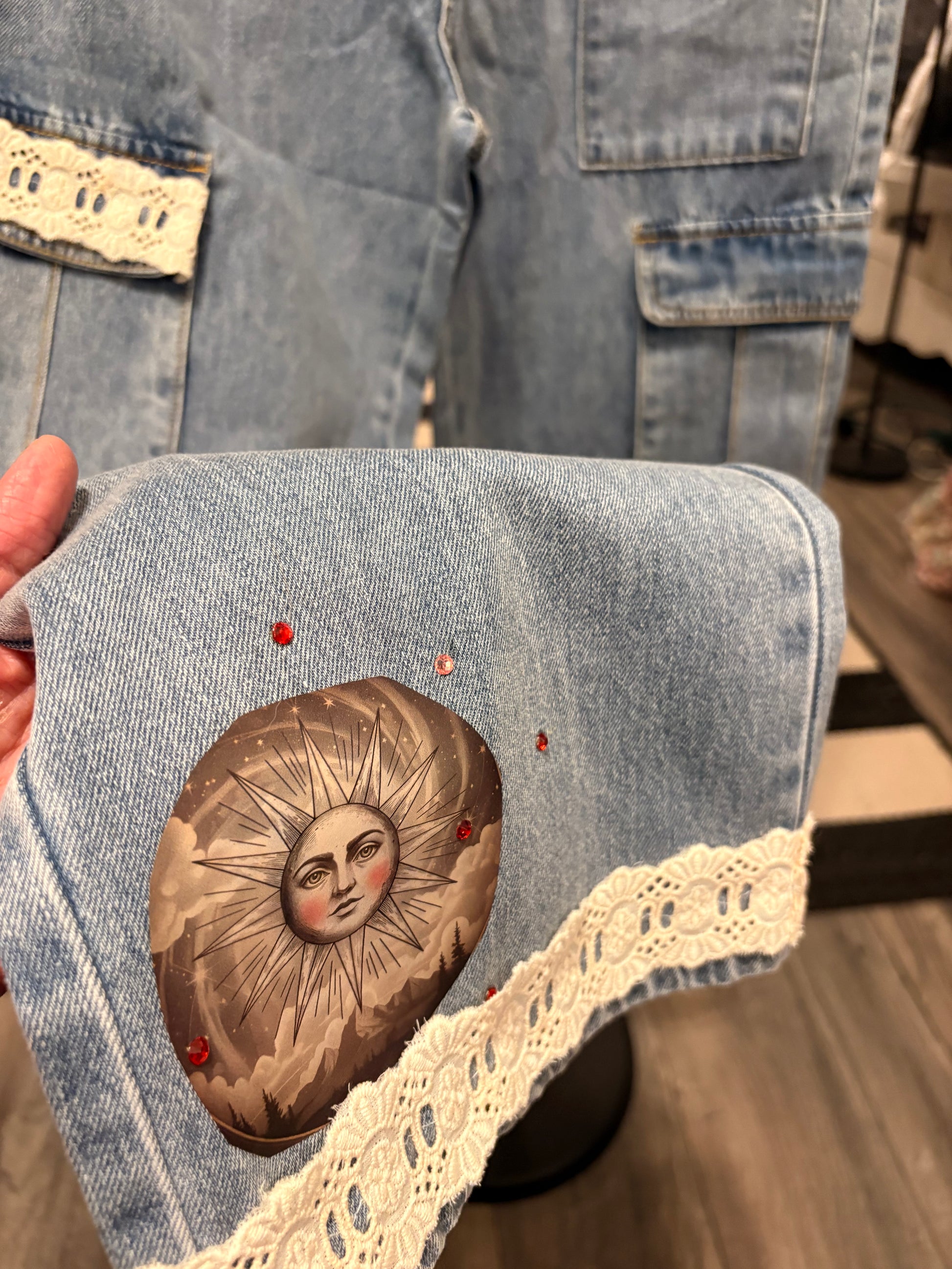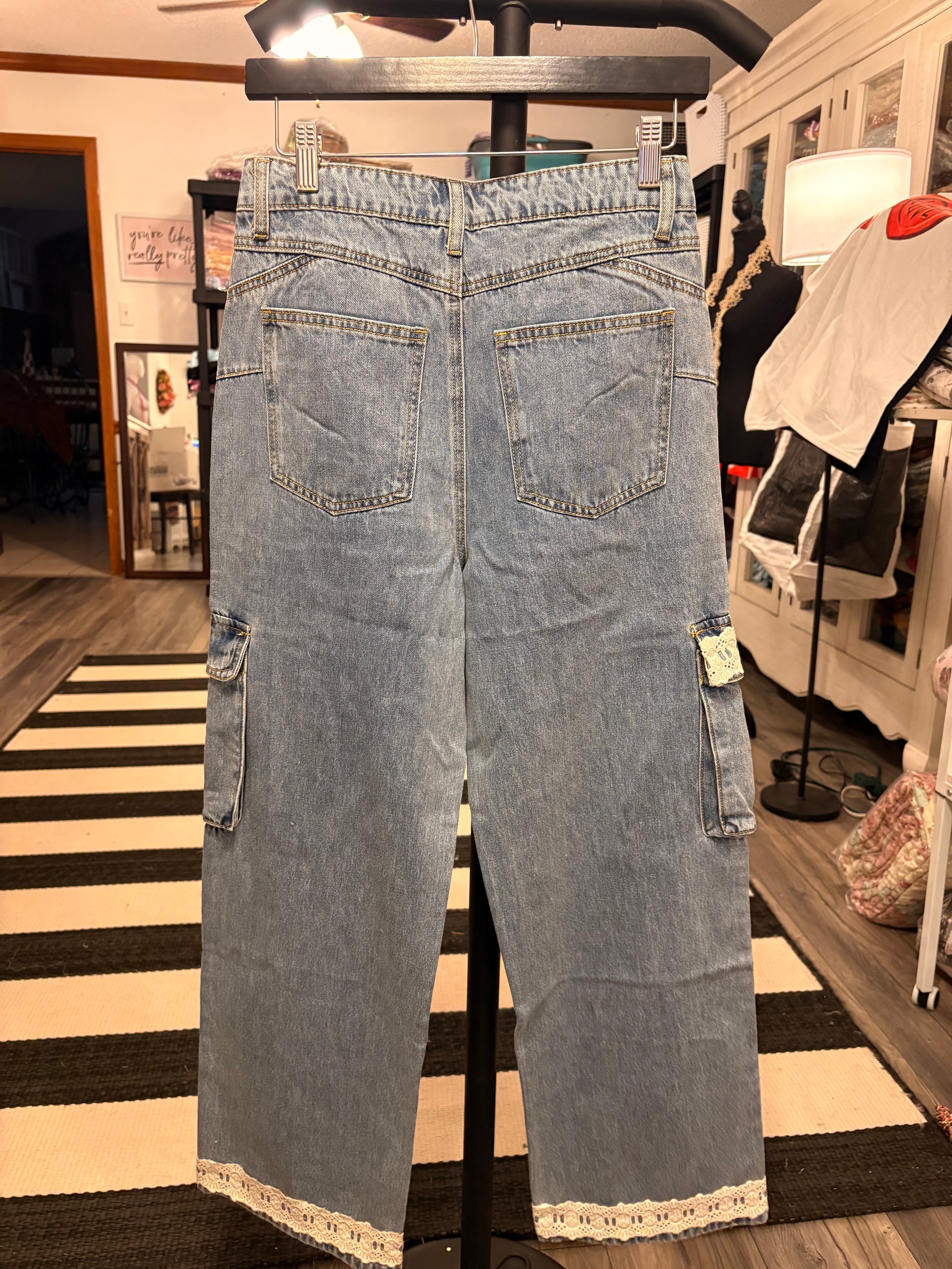 Mineral washed jeans. Brand new boutique brand Jean cargo jeans, Crochet trim, rhinestones and soft vinyl image.