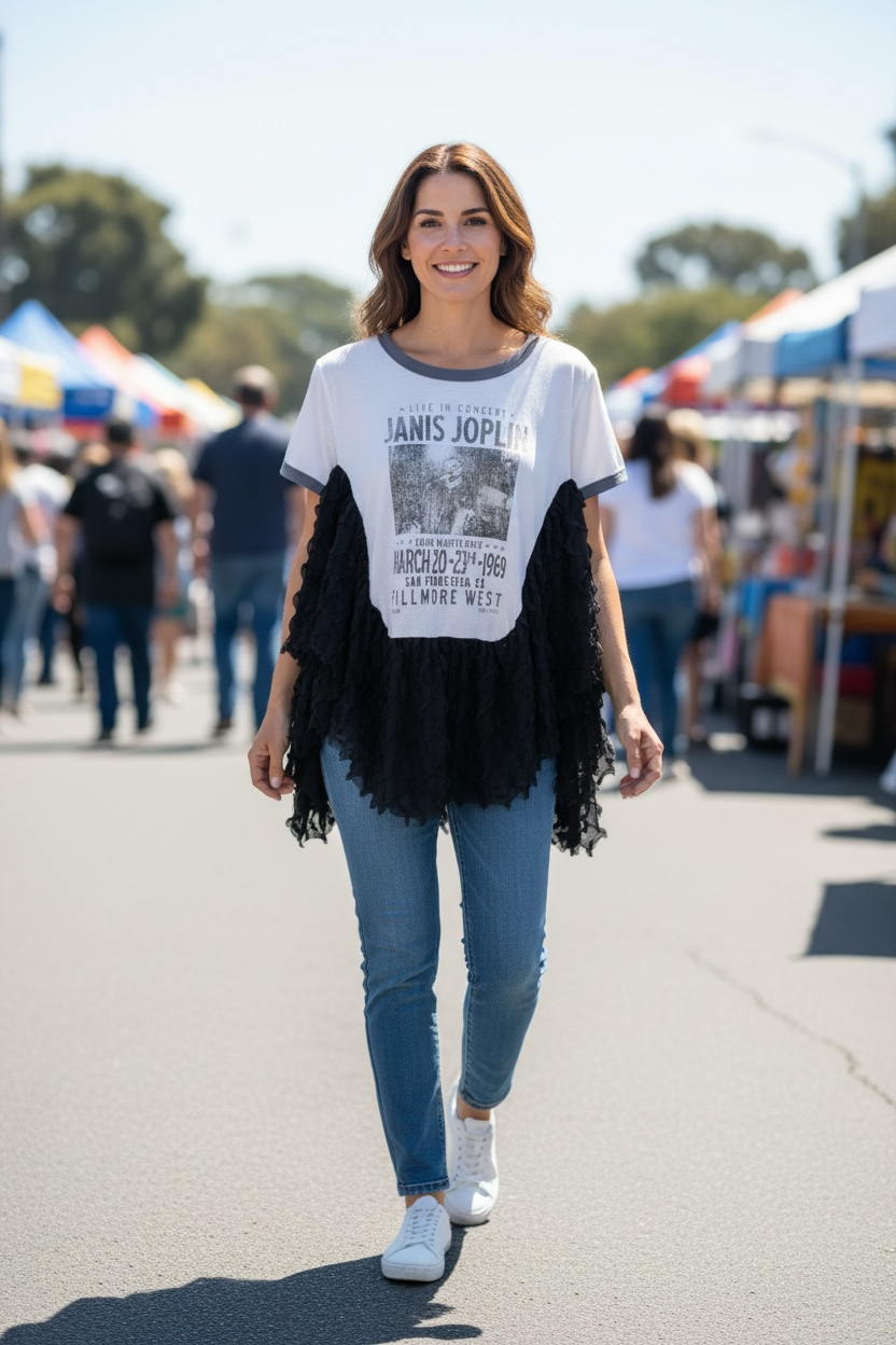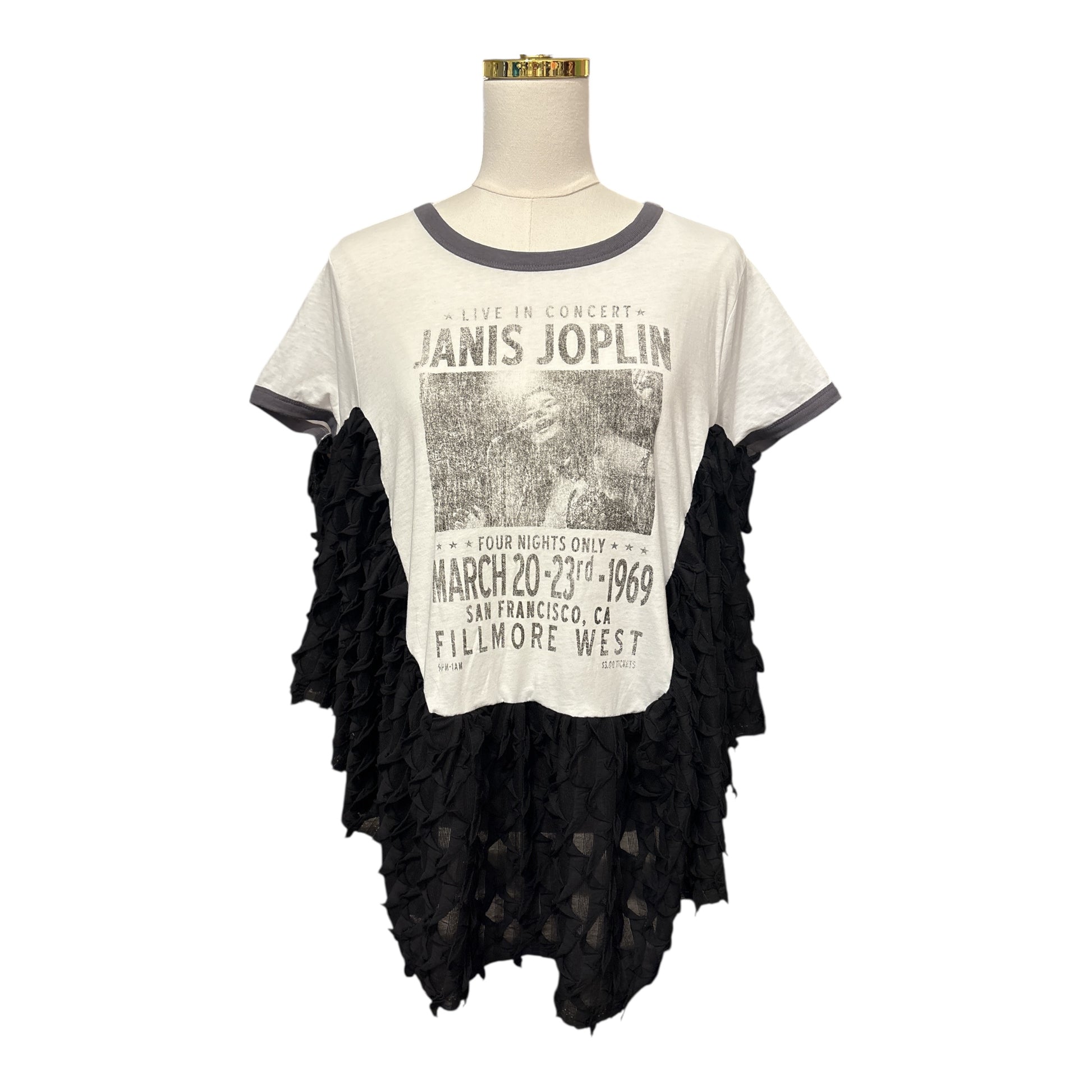 Fabulous black scalloped knit fabric and Upcycled graphic tee used to make this beautiful ruffled poncho. Oversized and GORGEOUS poncho! Super cute and cozy!! Perfect for ALL seasons! Has stitches for arm holes and sides are open.. circular shape…higher on the sides.