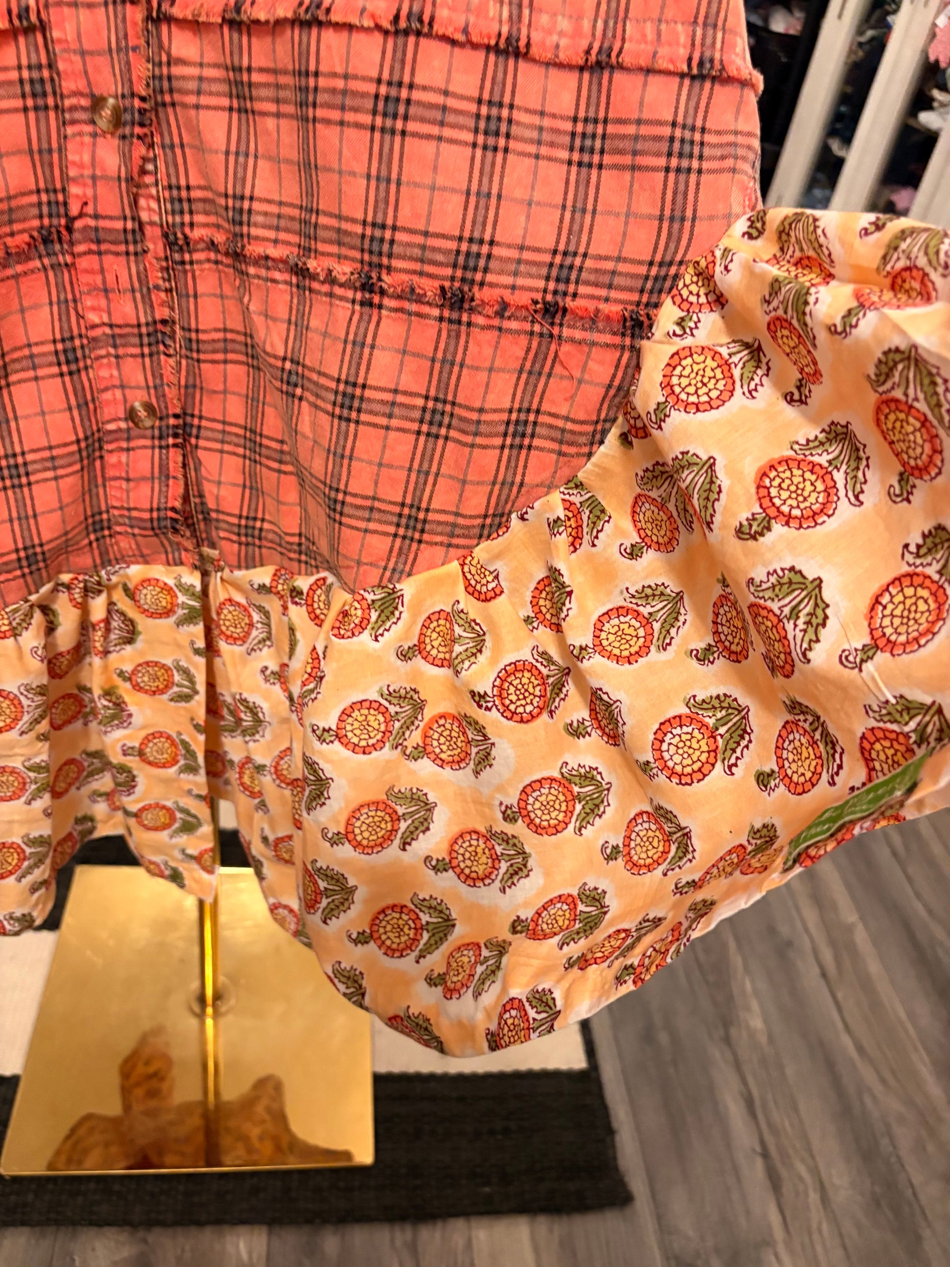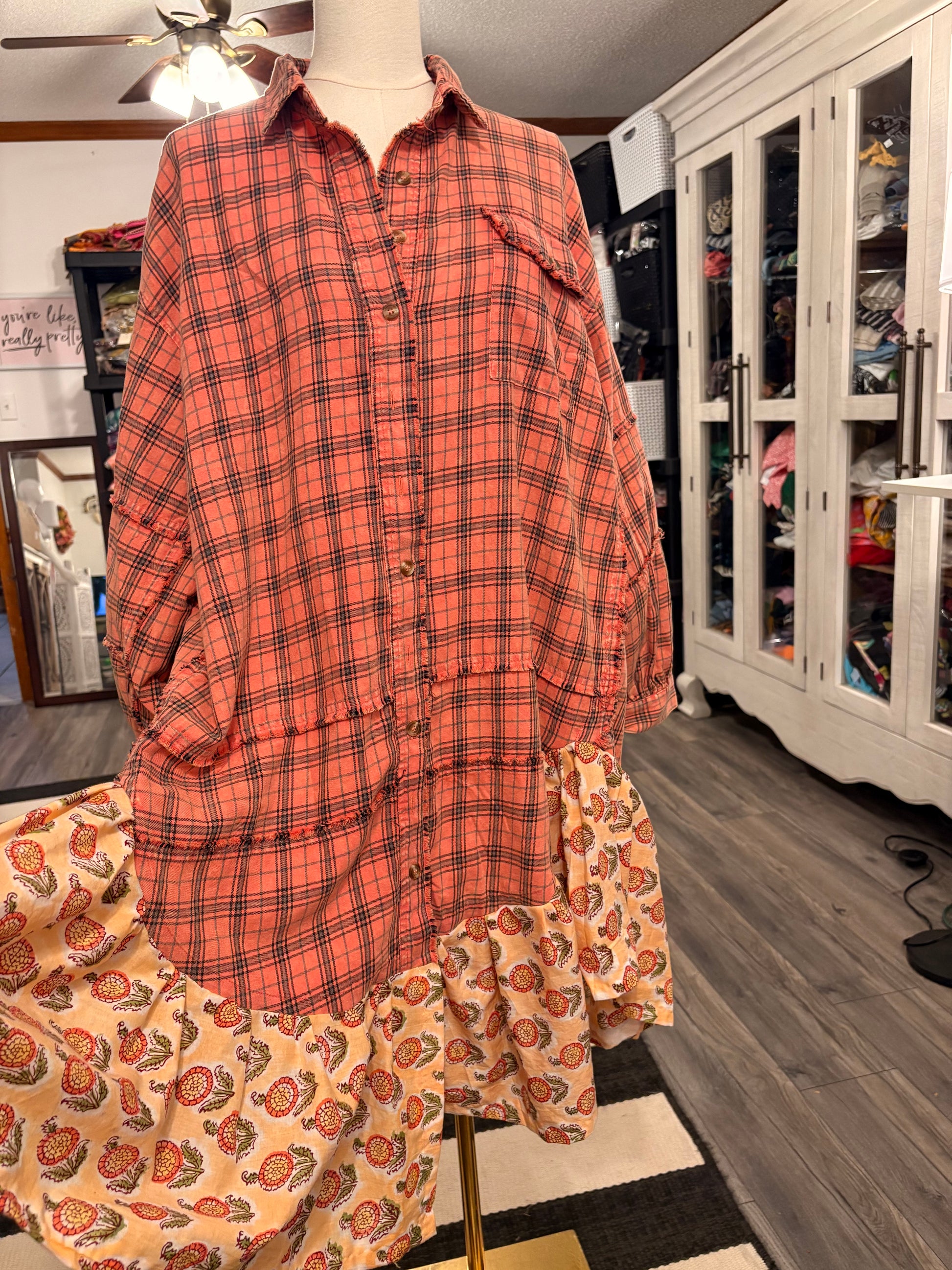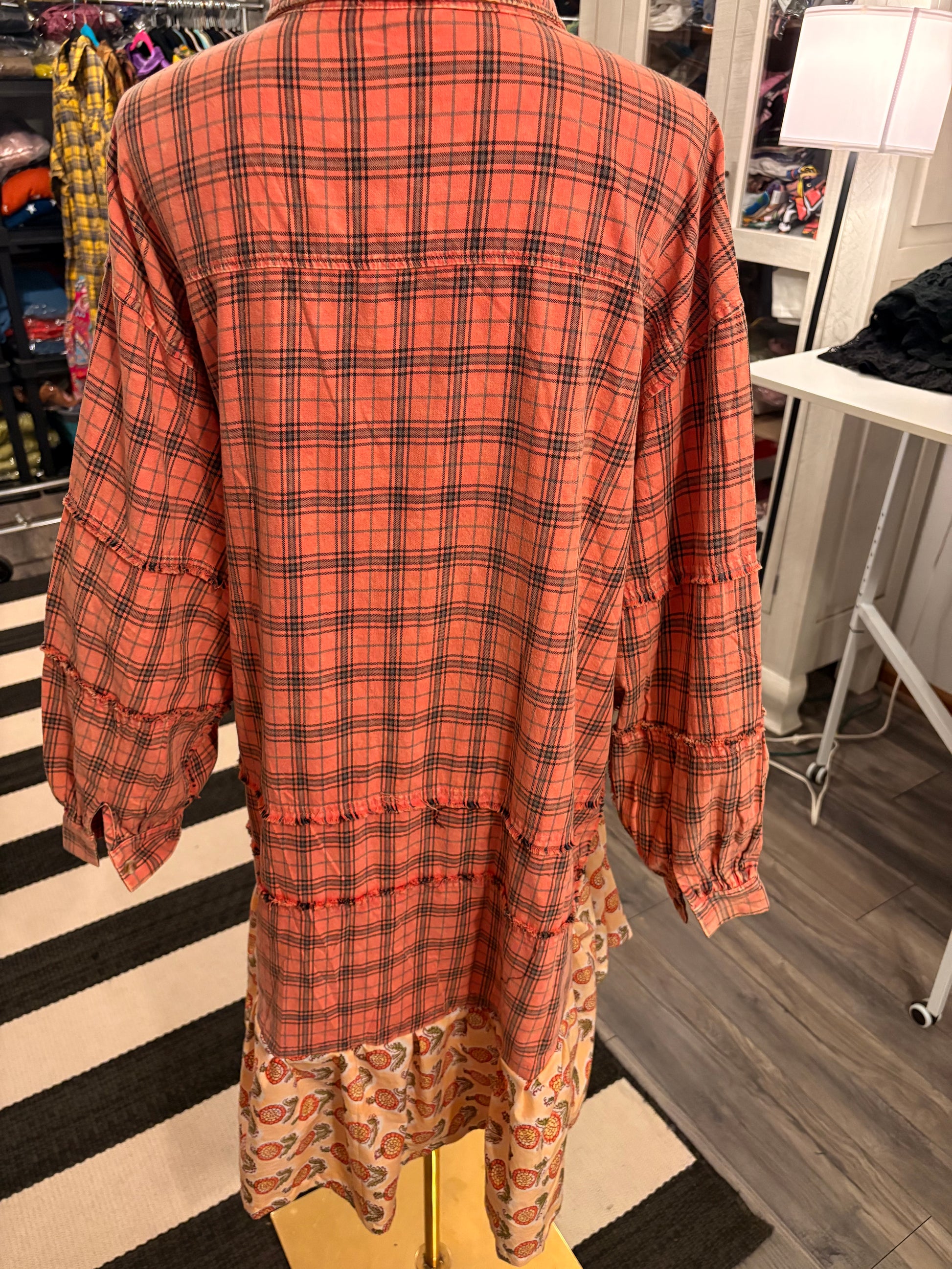 Upcycled boutique flannel and hand blocked cotton voile fabric used to create this super oversized and boot worthy dress or duster!! Long and cozy!! Can be worn with tights and boots or as a duster with jeans!!