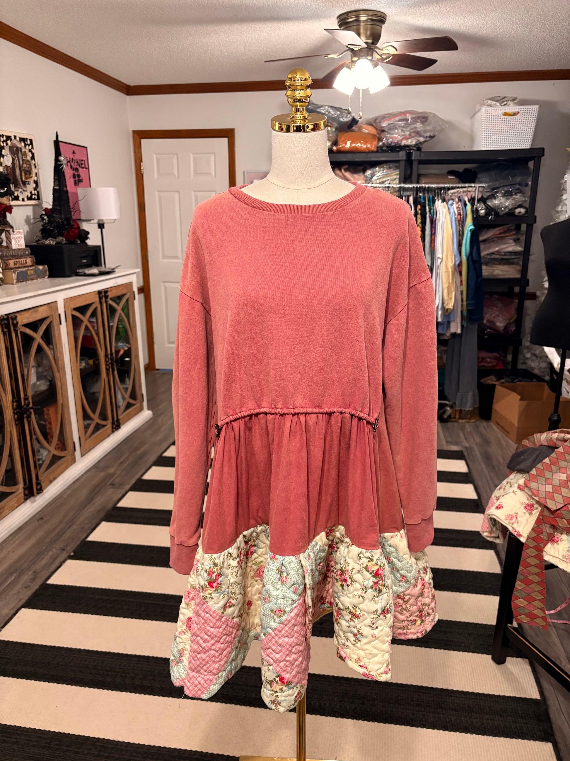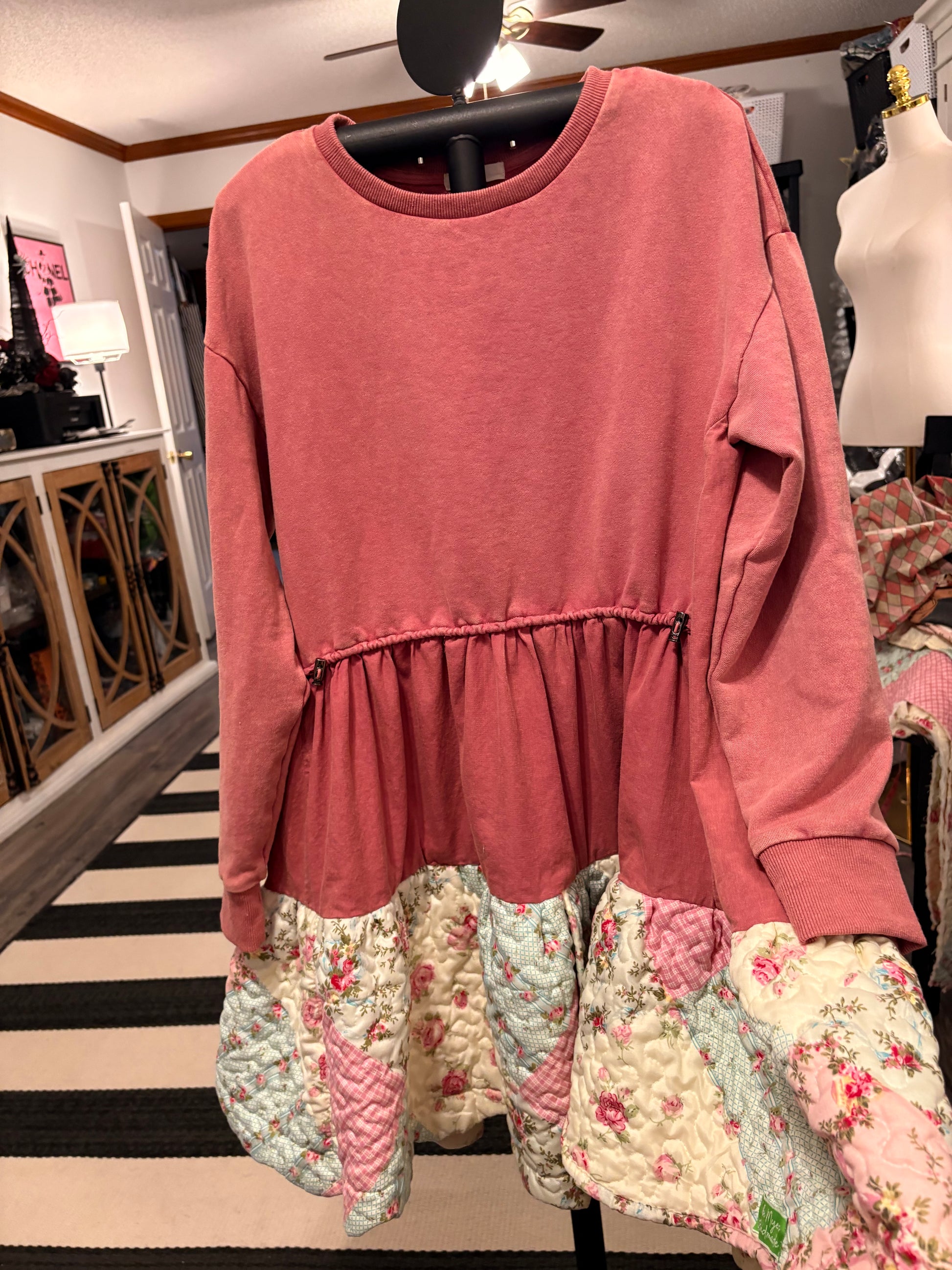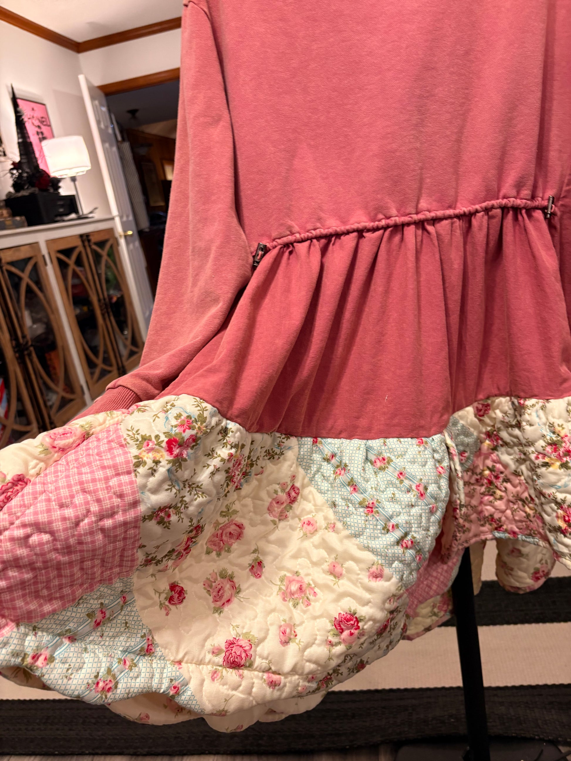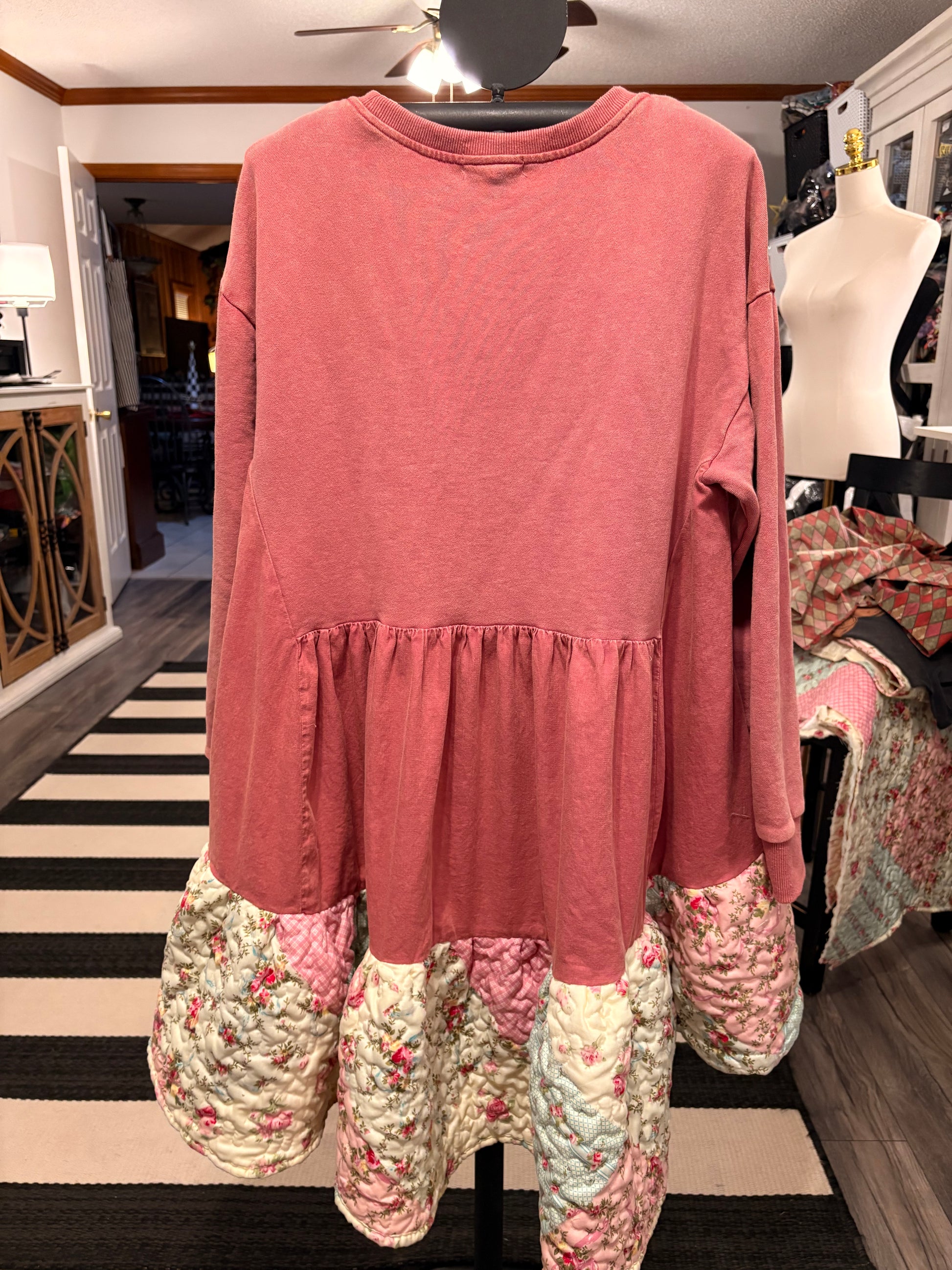Upcycled mixed fabric sweatshirt and quilt used to make this FABULOUS jumper. So cozy and CUTE!! Looks so cute over with tights and boots!