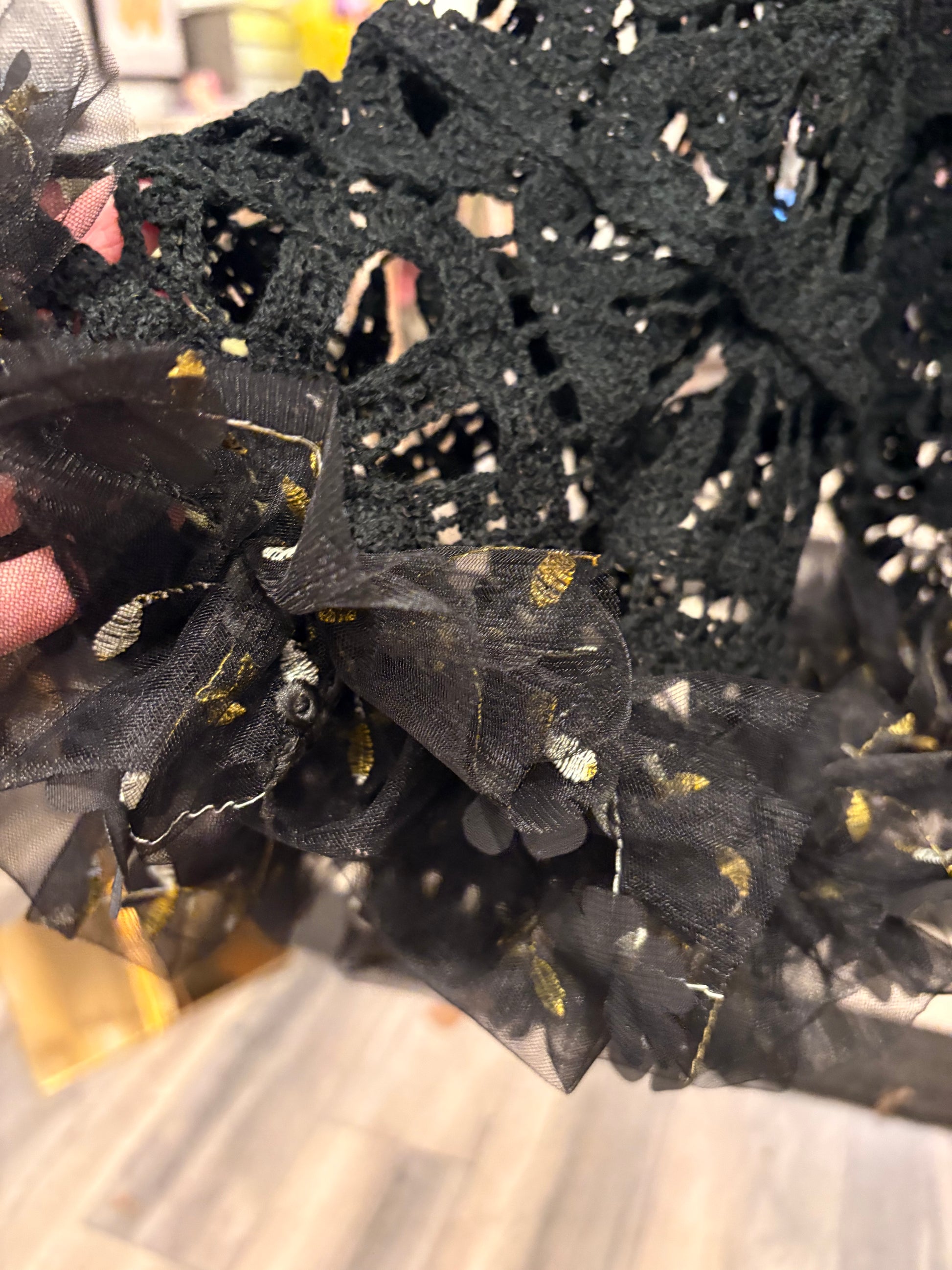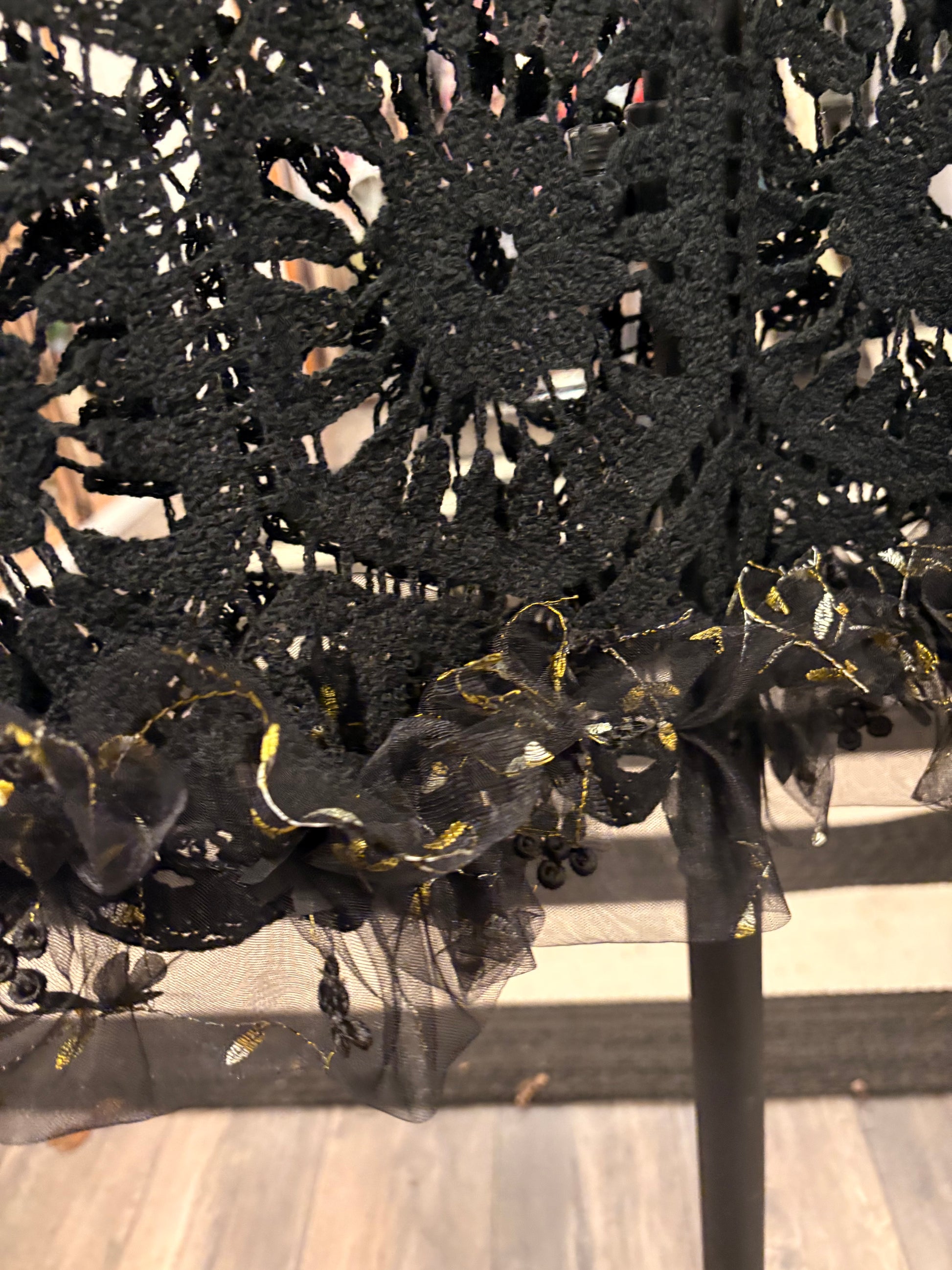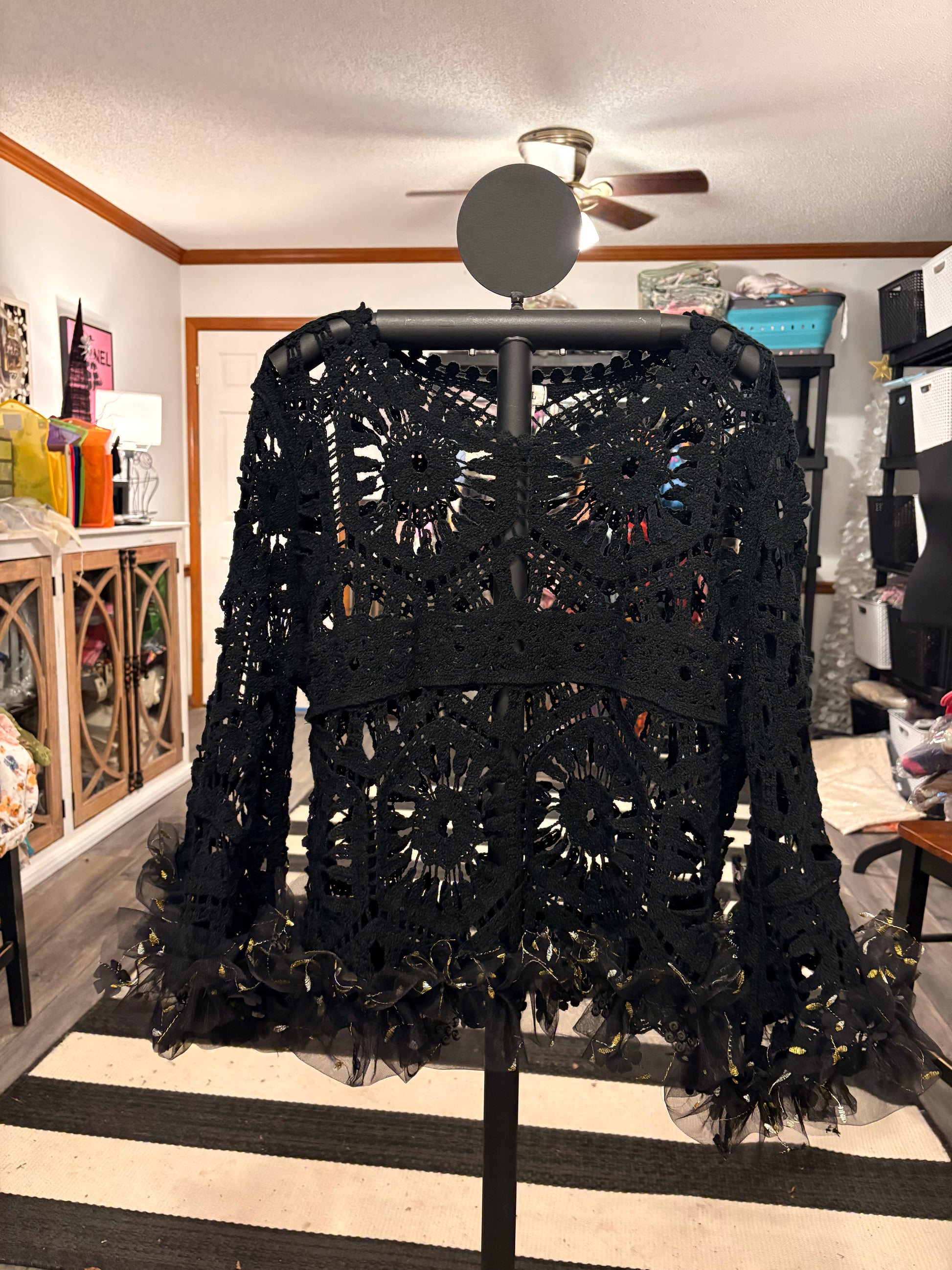 Upcycled crochet sweater and black tulle ruffle and gold and black ruffle used to make this absolutely breathtaking sweater!!!