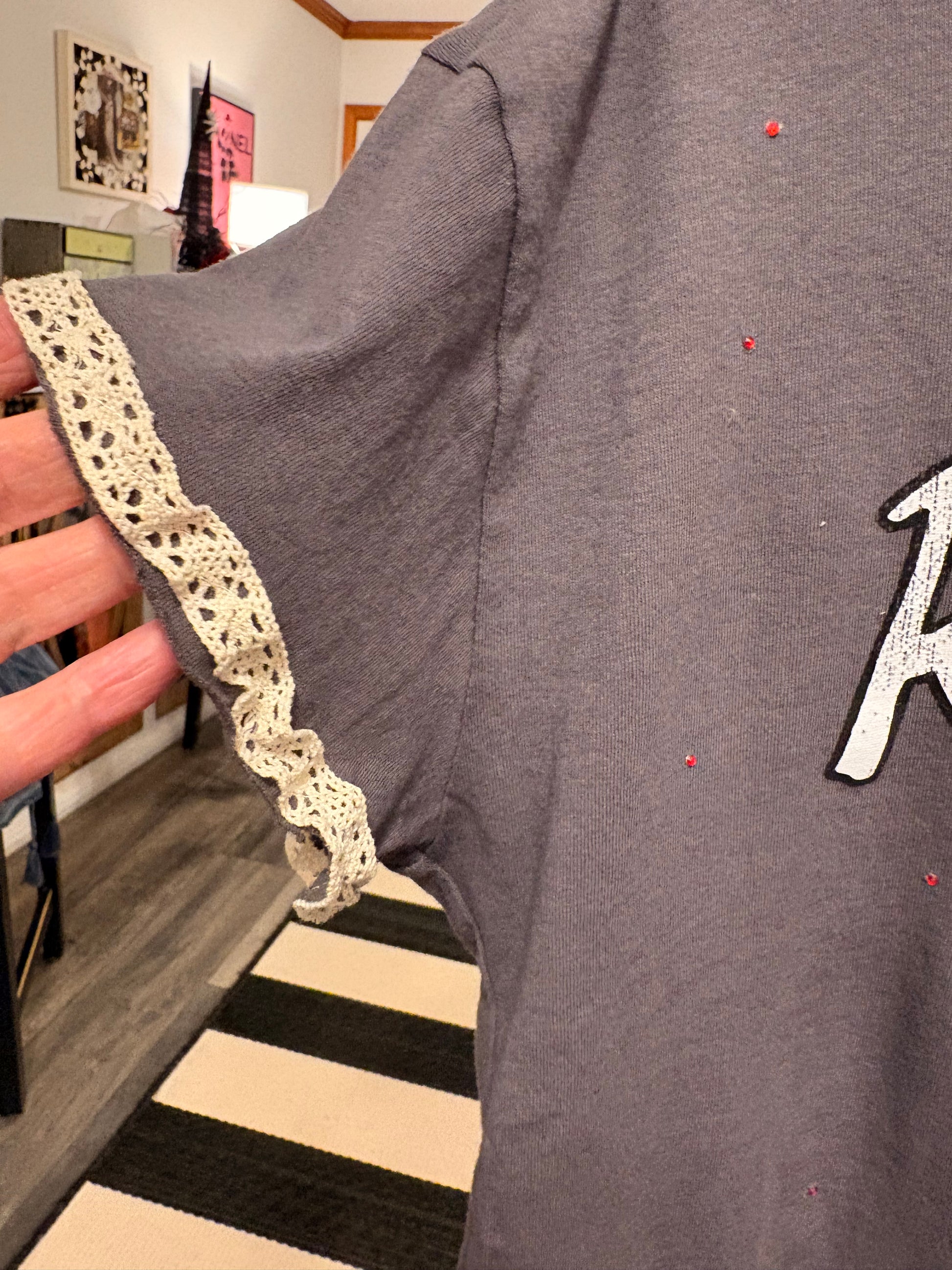 Pretty little tees! Upcycled rock tee adorned with rhinestones and crochet trim. Comfortable and beautiful!! SEW many beautiful details ❤️ Shirt used is an Large