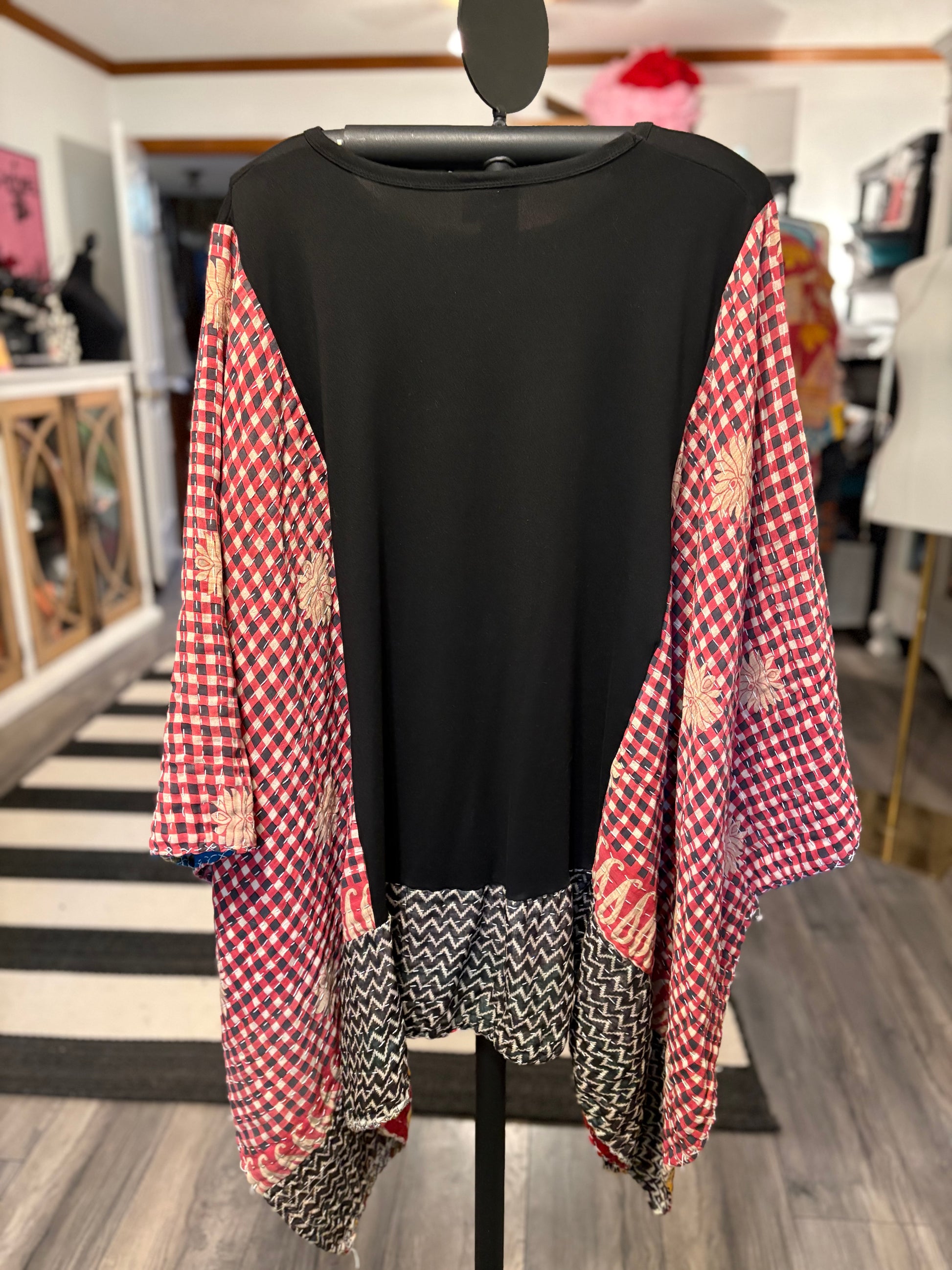 Beautiful vintage Kantha quilt and graphic tee paired to make this FABULOUS Upcycled tee. Vintage Kantha quilts have been well loved. They may have white strings (which can be cut) , slight holes, small stains,and may be weathered, rustic and tattered which all lends to the vintage beauty of the top. Perfectly imperfect!!