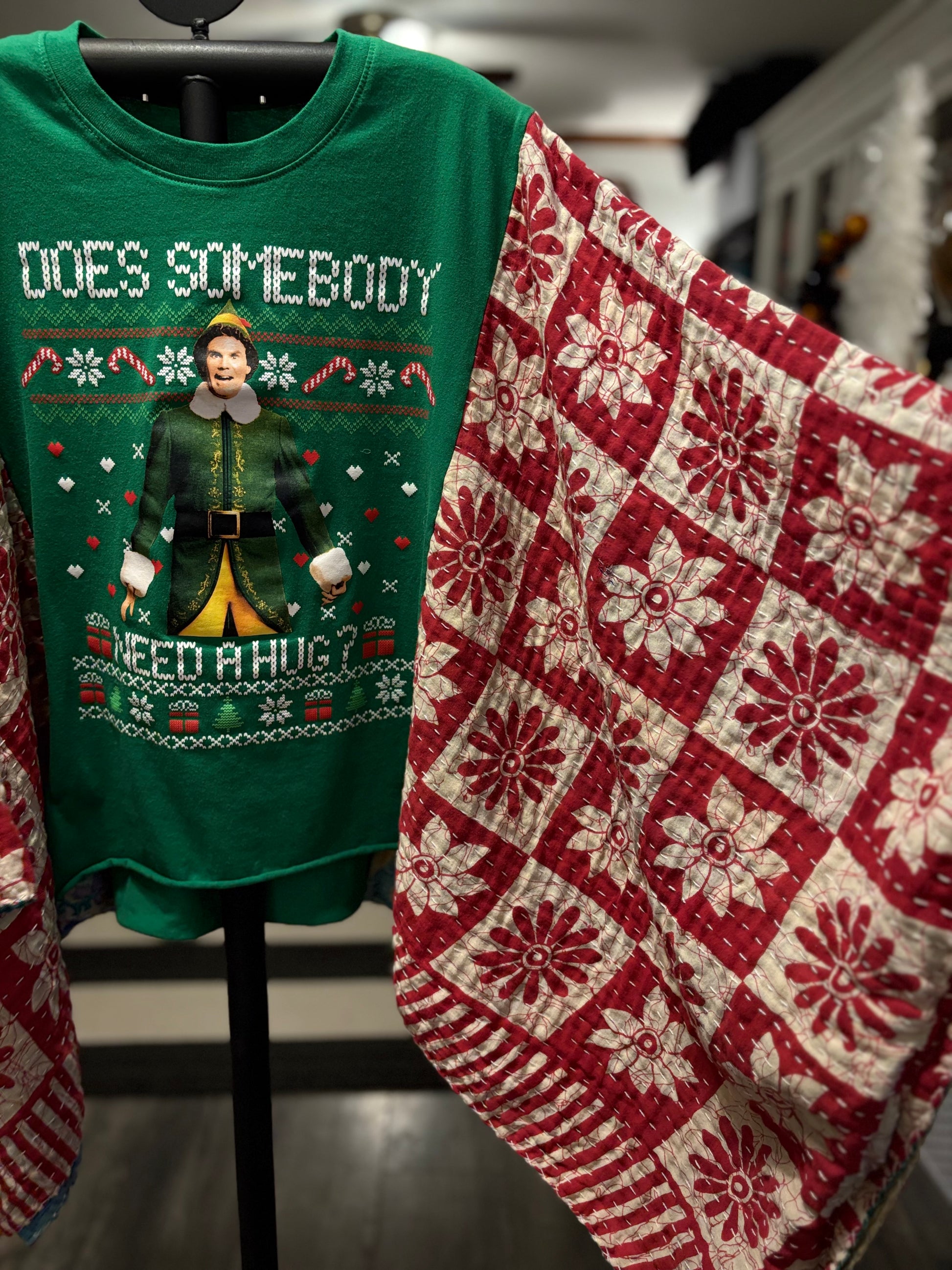 Beautiful vintage Kantha quilt and graphic tee paired to make this FABULOUS Upcycled tee. Vintage Kantha quilts have been well loved. They may have white strings (which can be cut) , slight holes, small stains,and may be weathered, rustic and tattered which all lends to the vintage beauty of the top. Perfectly imperfect!!