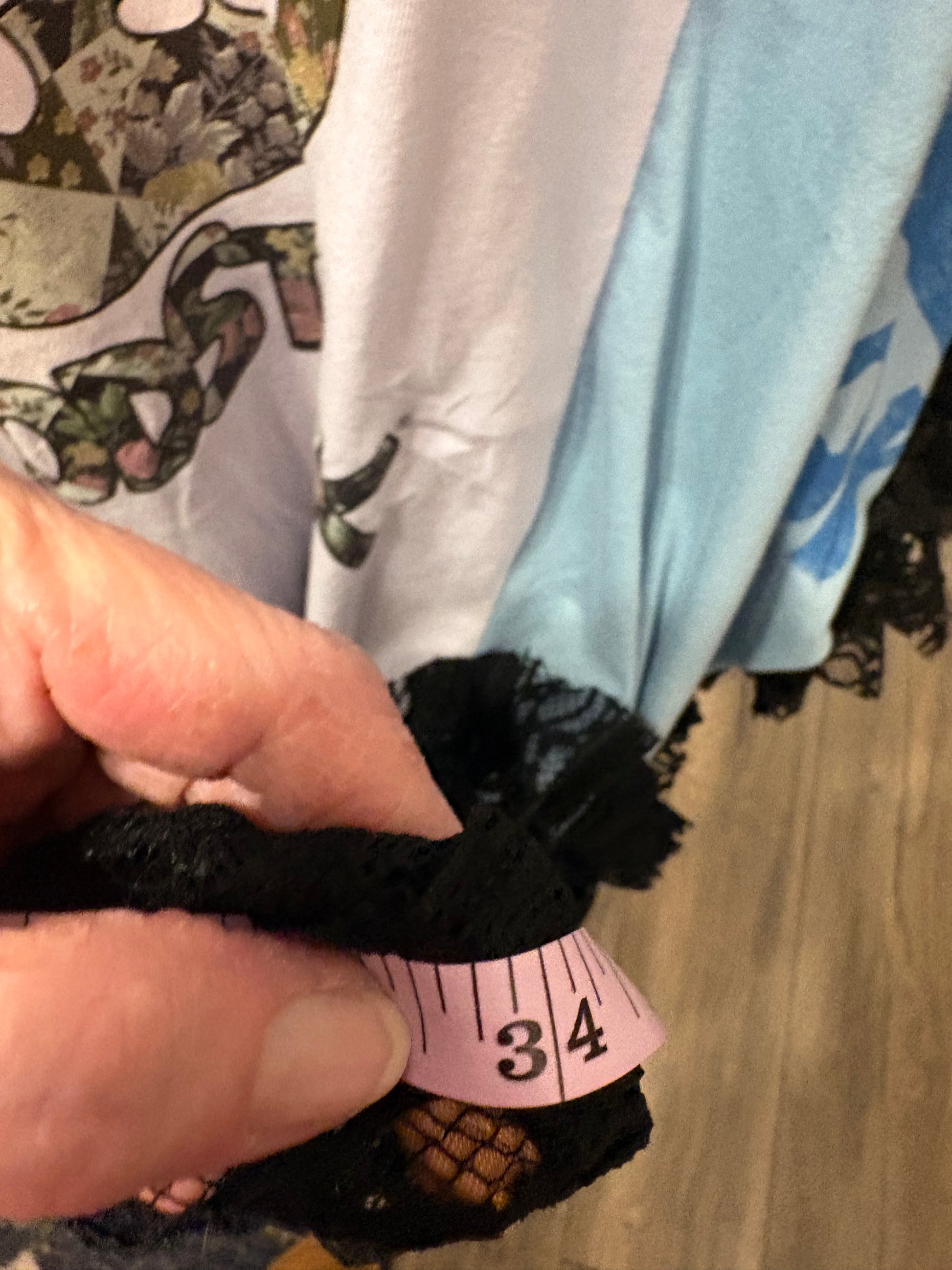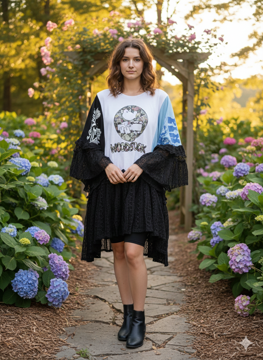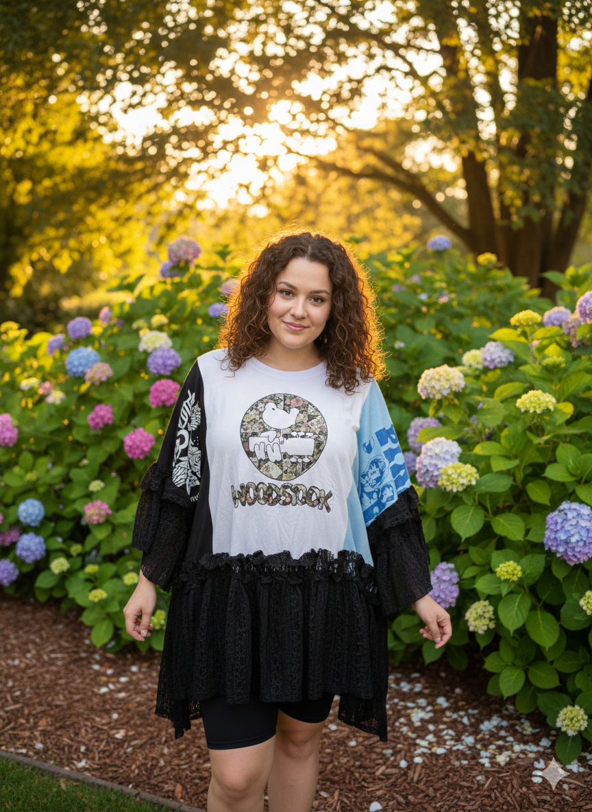 3 Upcycled graphic tees and 2 lace skirts used to make this FABULOUS ROCKSTAR top. Looks great with absolutely everything! You will ROCK this!!!❤️