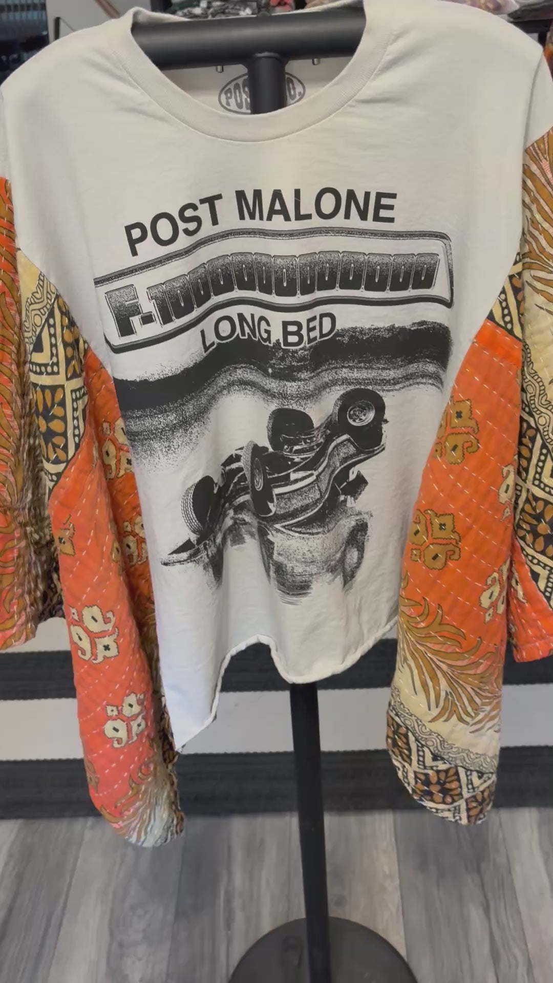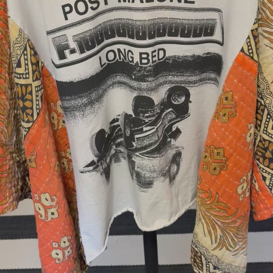 Beautiful vintage Kantha quilt and graphic tee paired to make this FABULOUS Upcycled tee. Vintage Kantha quilts have been well loved. They may have white strings (which can be cut) , slight holes, small stains,and may be weathered, rustic and tattered which all lends to the vintage beauty of the top. Perfectly imperfect!