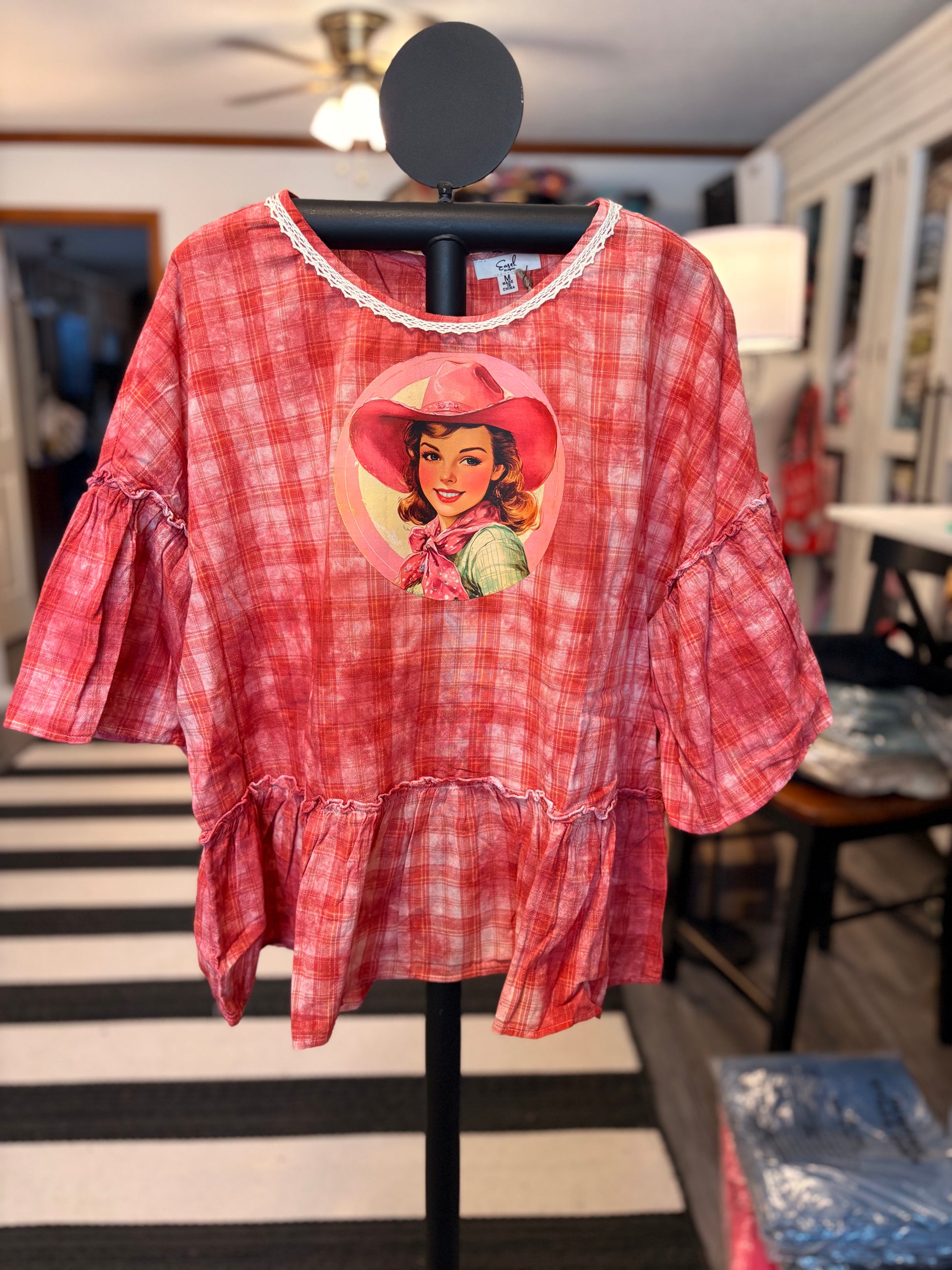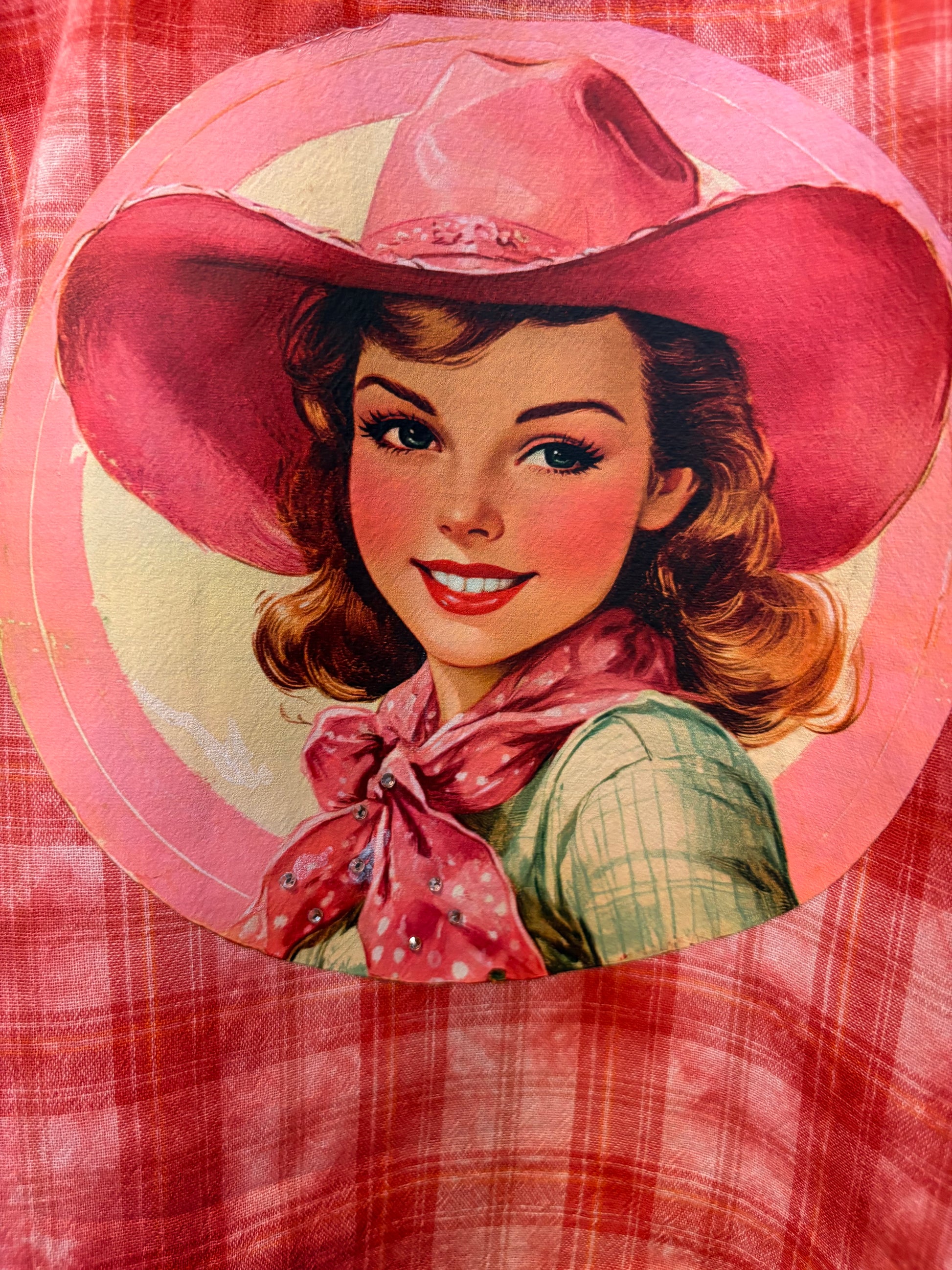 Pretty Pink Cowgirl Upcycled Ruffle Plaid Top OVERSIZED Fits a Small