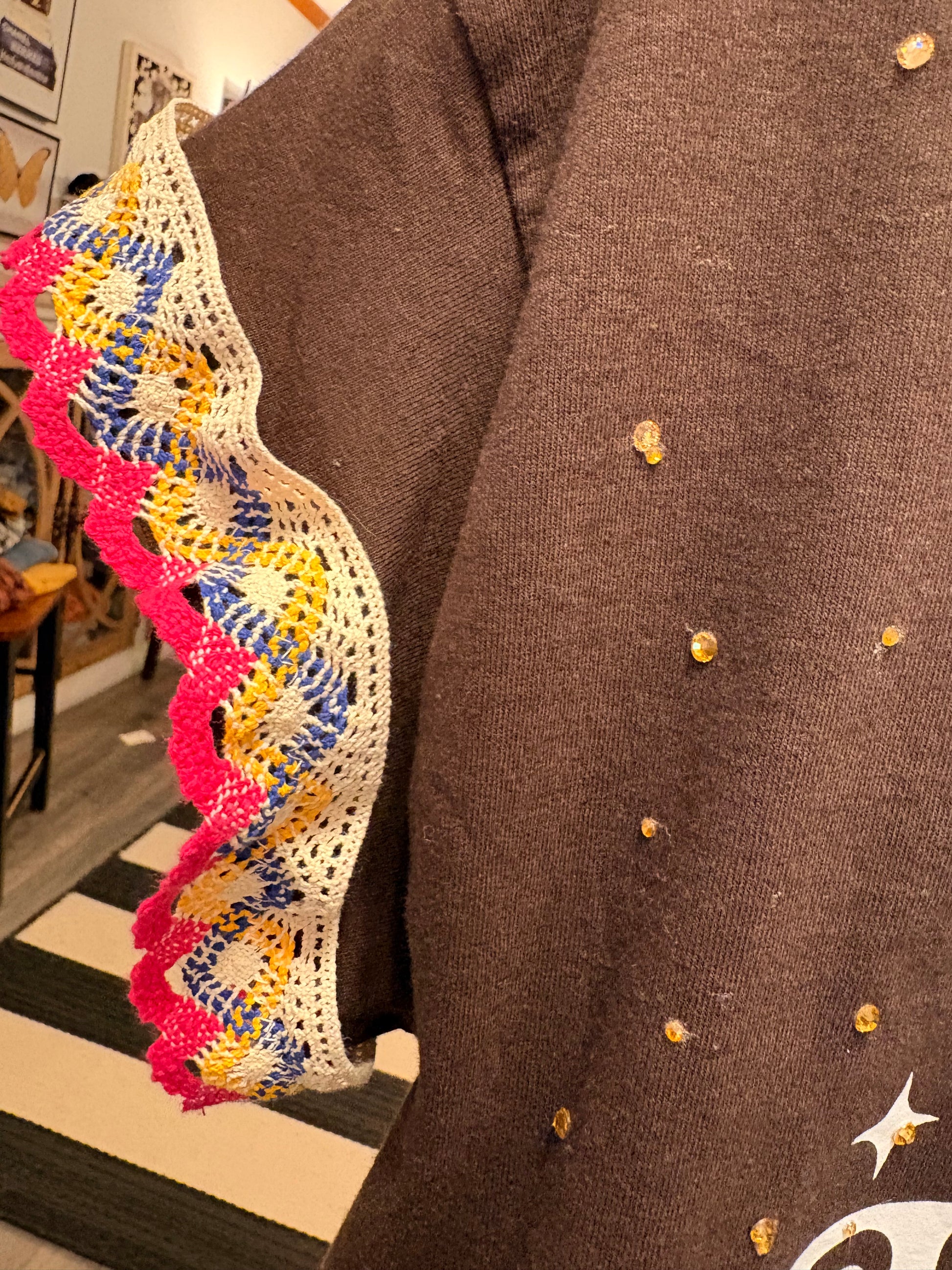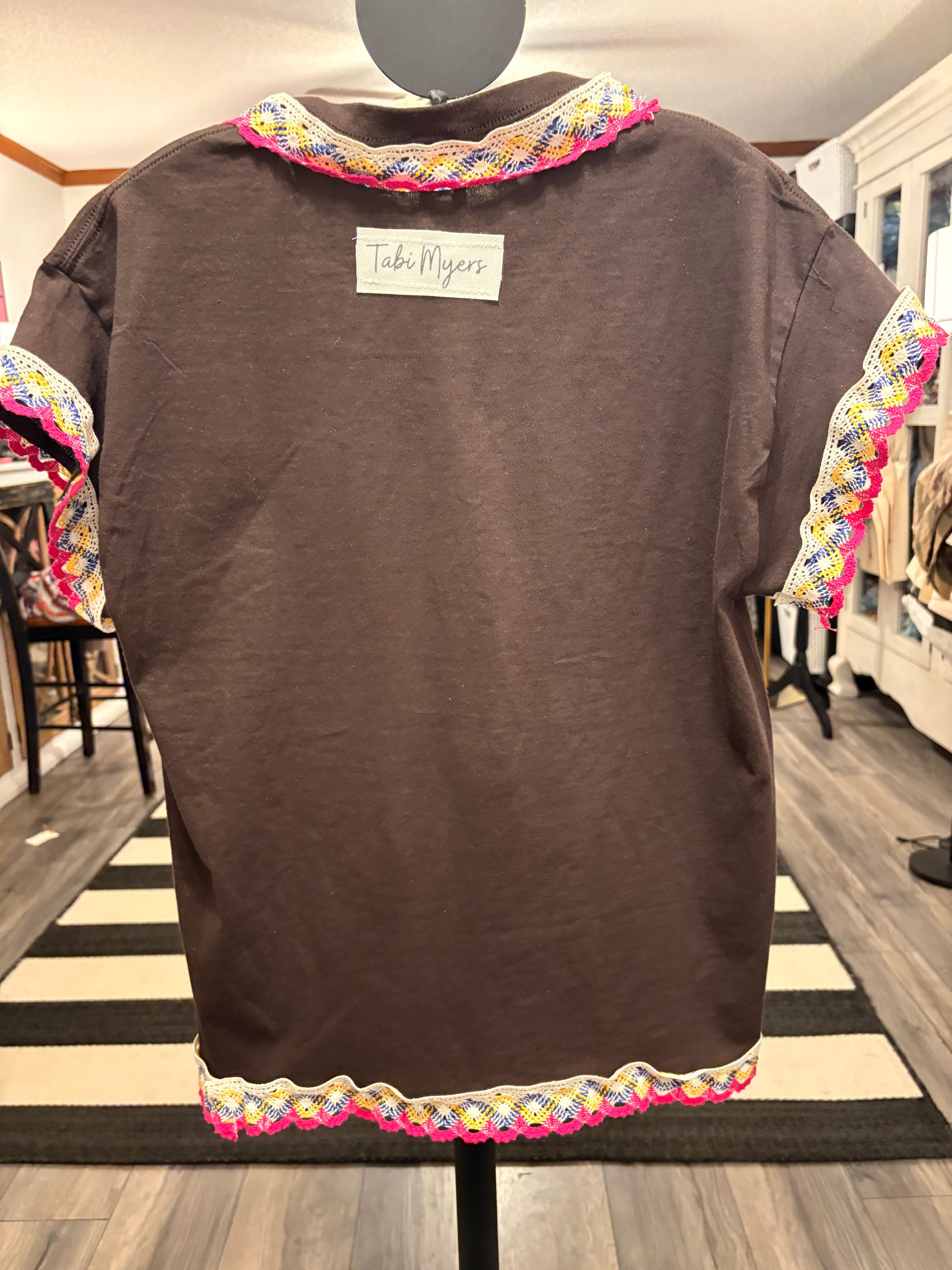 Pretty little tees! Upcycled rock tee adorned with rhinestones and crochet trim. Comfortable and beautiful!! SEW many beautiful details ❤️ Shirt used is a Small