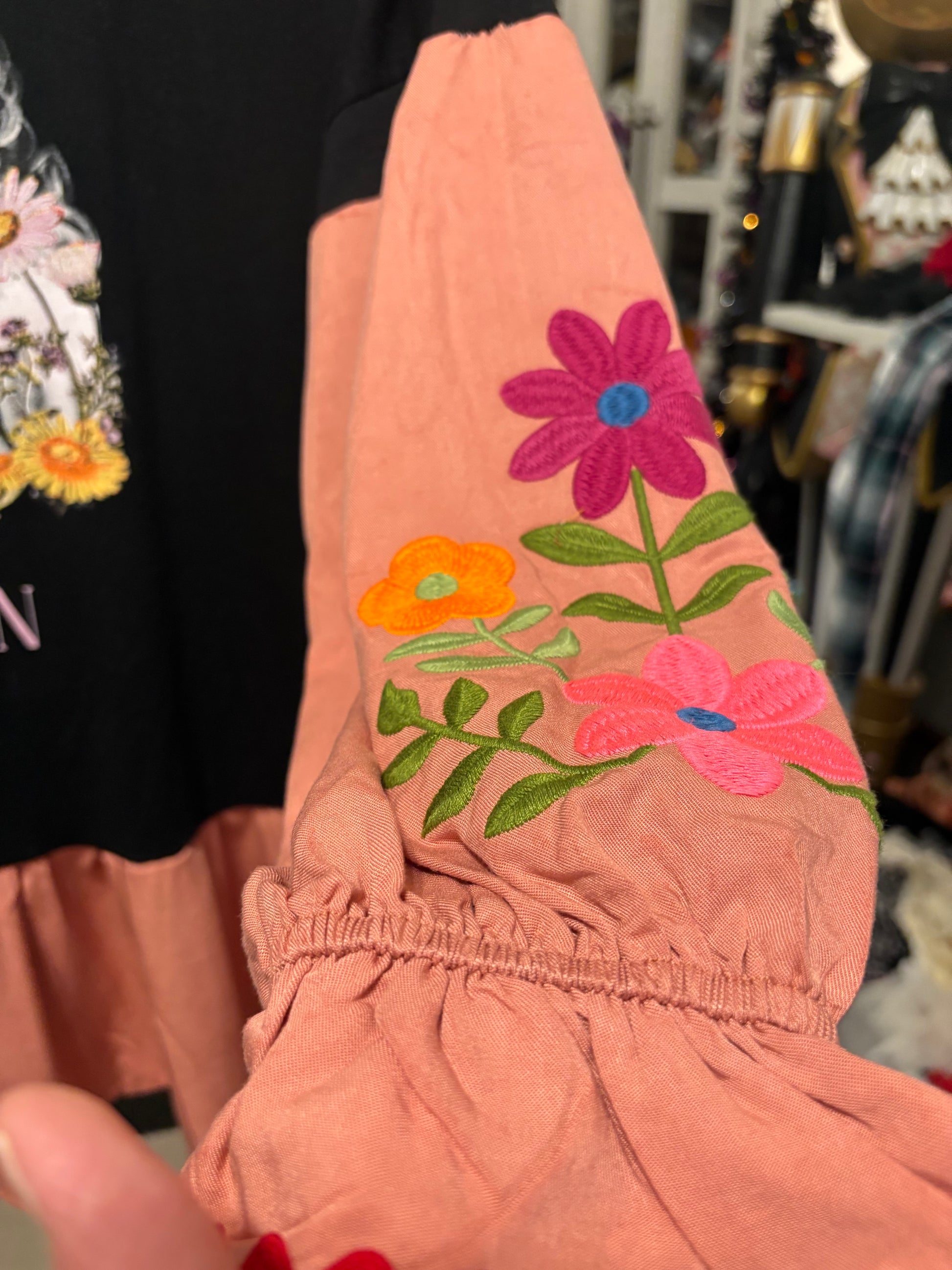 This unique drop sleeve top combines a vintage or upcycled fabric with a graphic tee design to create a sustainable, one-of-a-kind piece. With a relaxed oversized silhouette and long drop sleeves, it’s a comfortable and stylish layering option for casual outfits, streetwear, or cozy lounge looks.