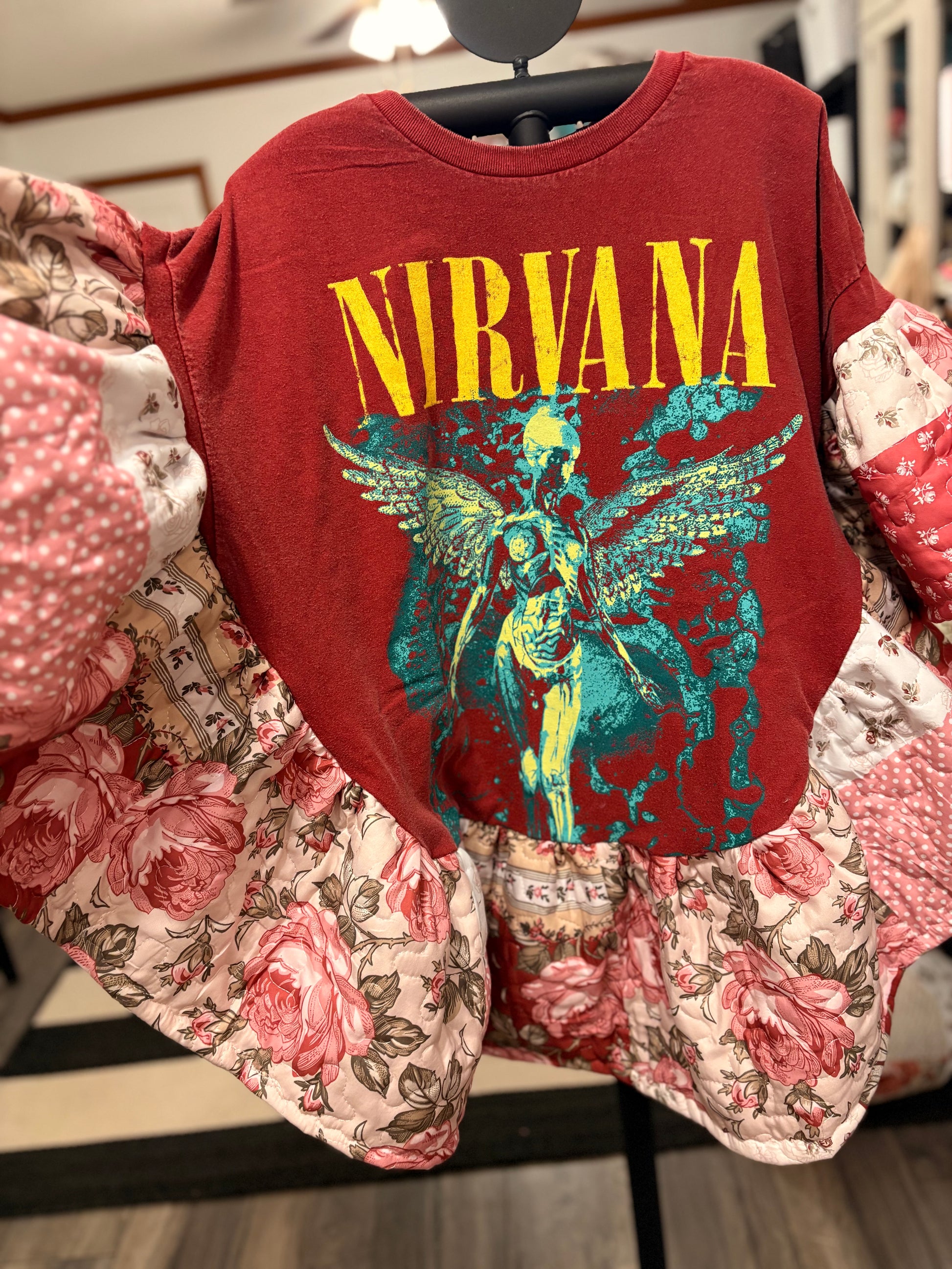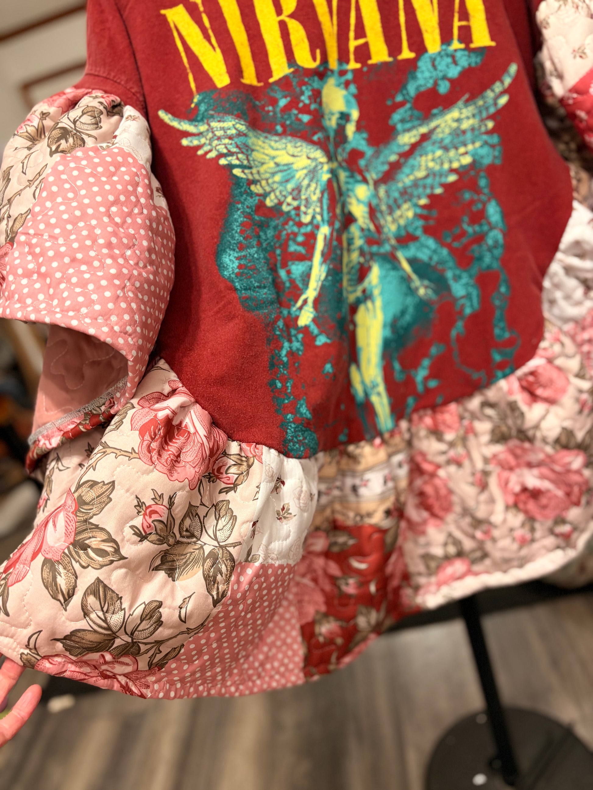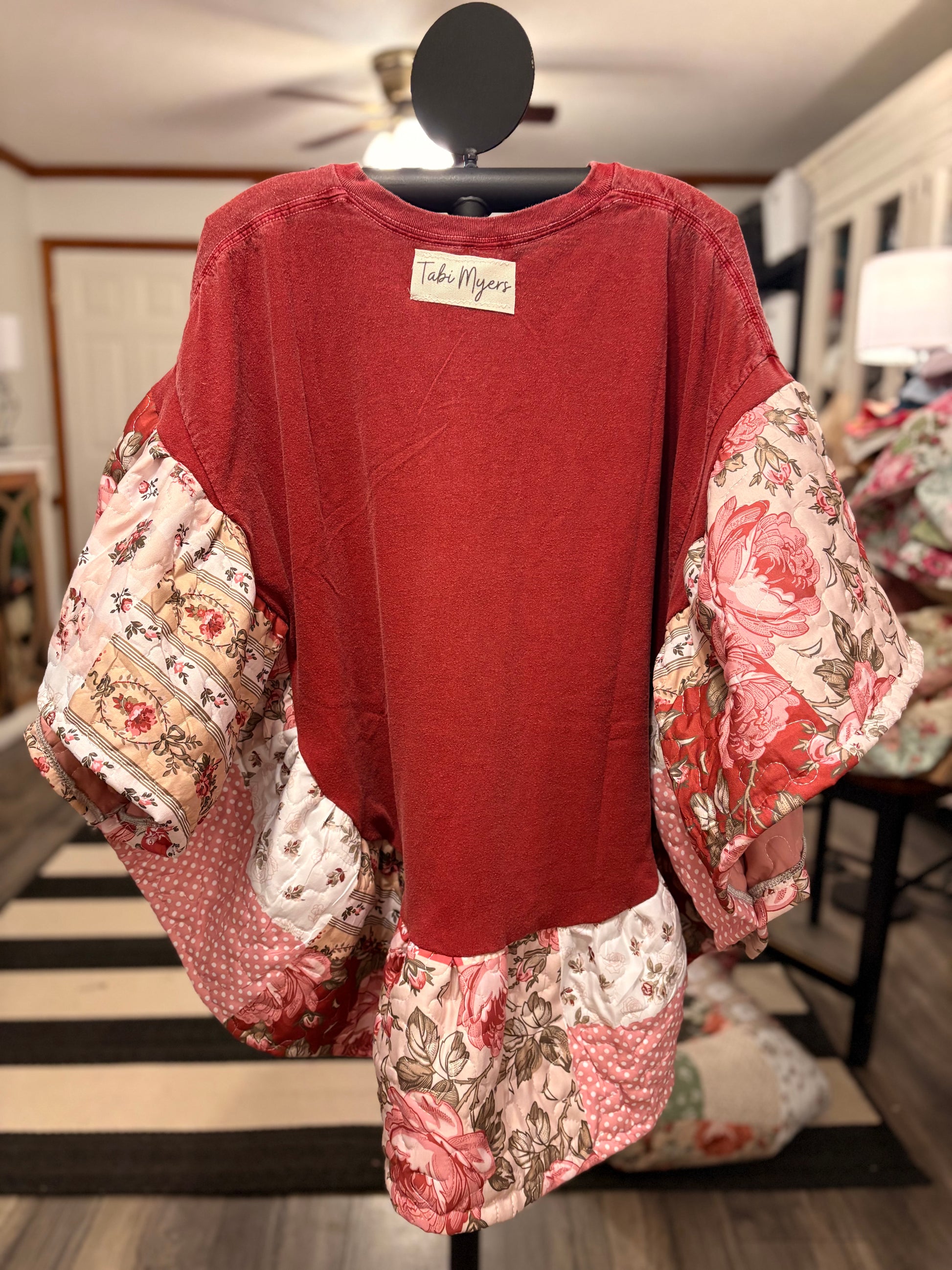 Original Tabi designed graphic tee and quilted fabric used to make this beautiful circle shaped ruffled poncho. Oversized and GORGEOUS poncho! Super cute and cozy!! Perfect for Winter, Spring and Fall. Tee used is a 2XL. ****Sides are open with small stitches on each to side for arms to go through…***** Garment is a PONCHO and does not have a full sleeve!!