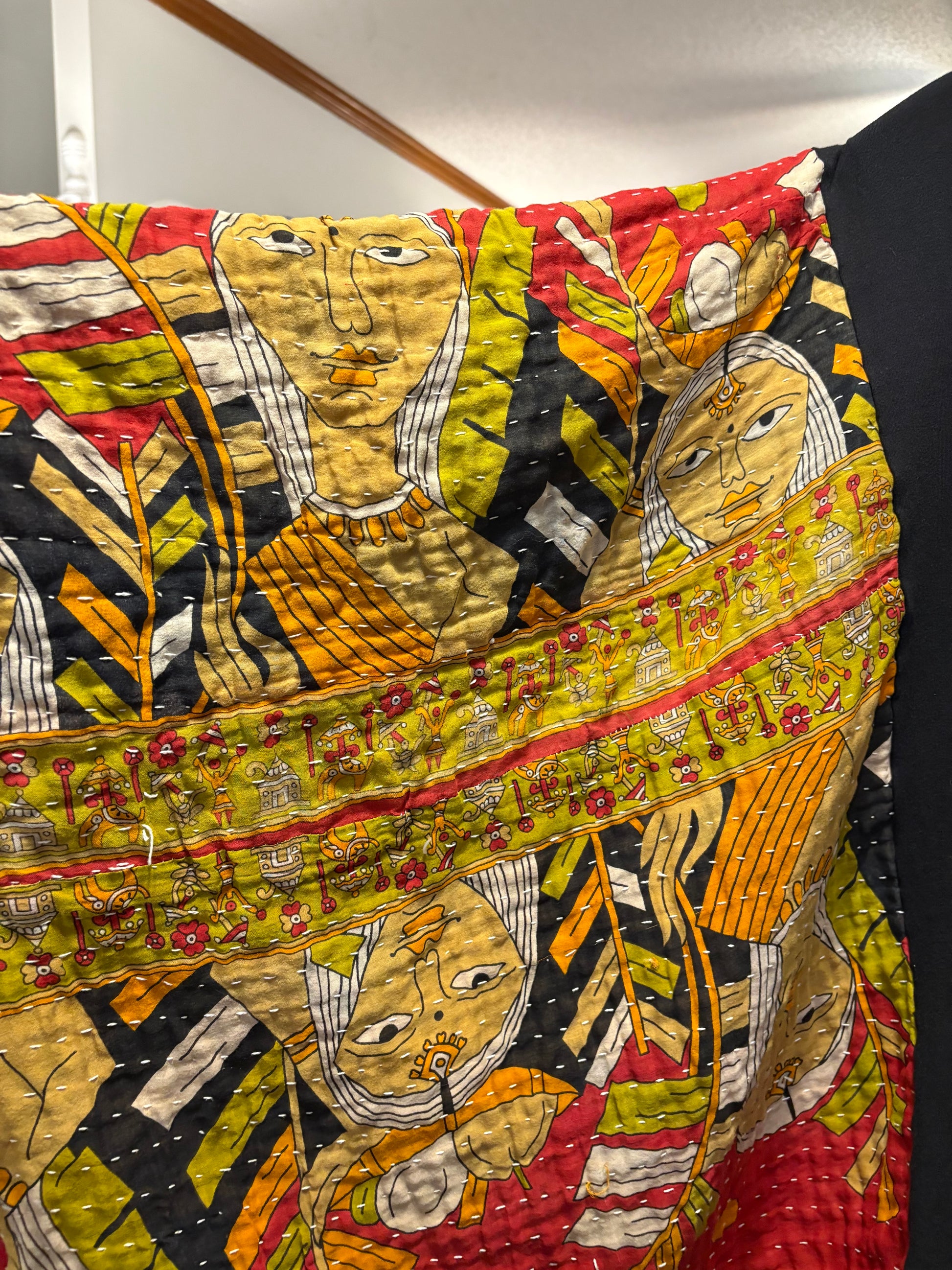 Beautiful vintage Kantha quilt and graphic tee paired to make this FABULOUS Upcycled tee. Vintage Kantha quilts have been well loved. They may have white strings (which can be cut) , slight holes, small stains,and may be weathered, rustic and tattered which all lends to the vintage beauty of the top. Perfectly imperfect!!