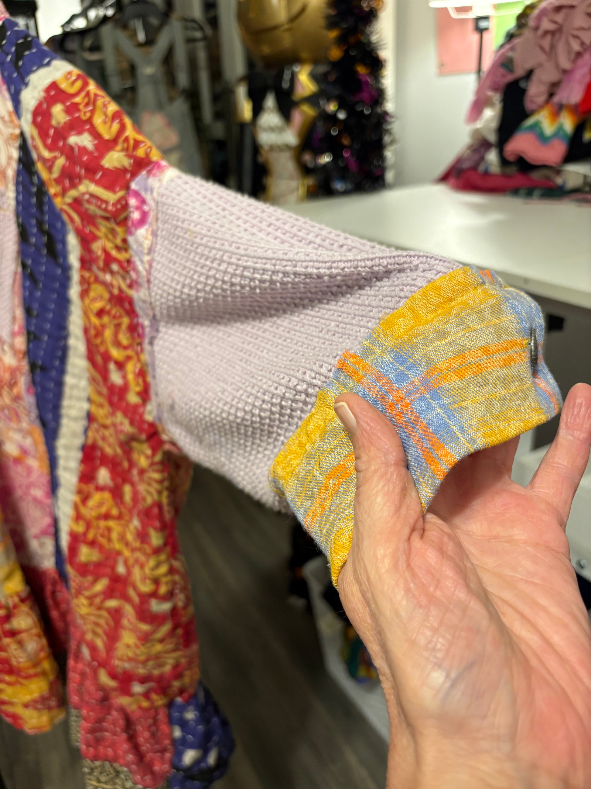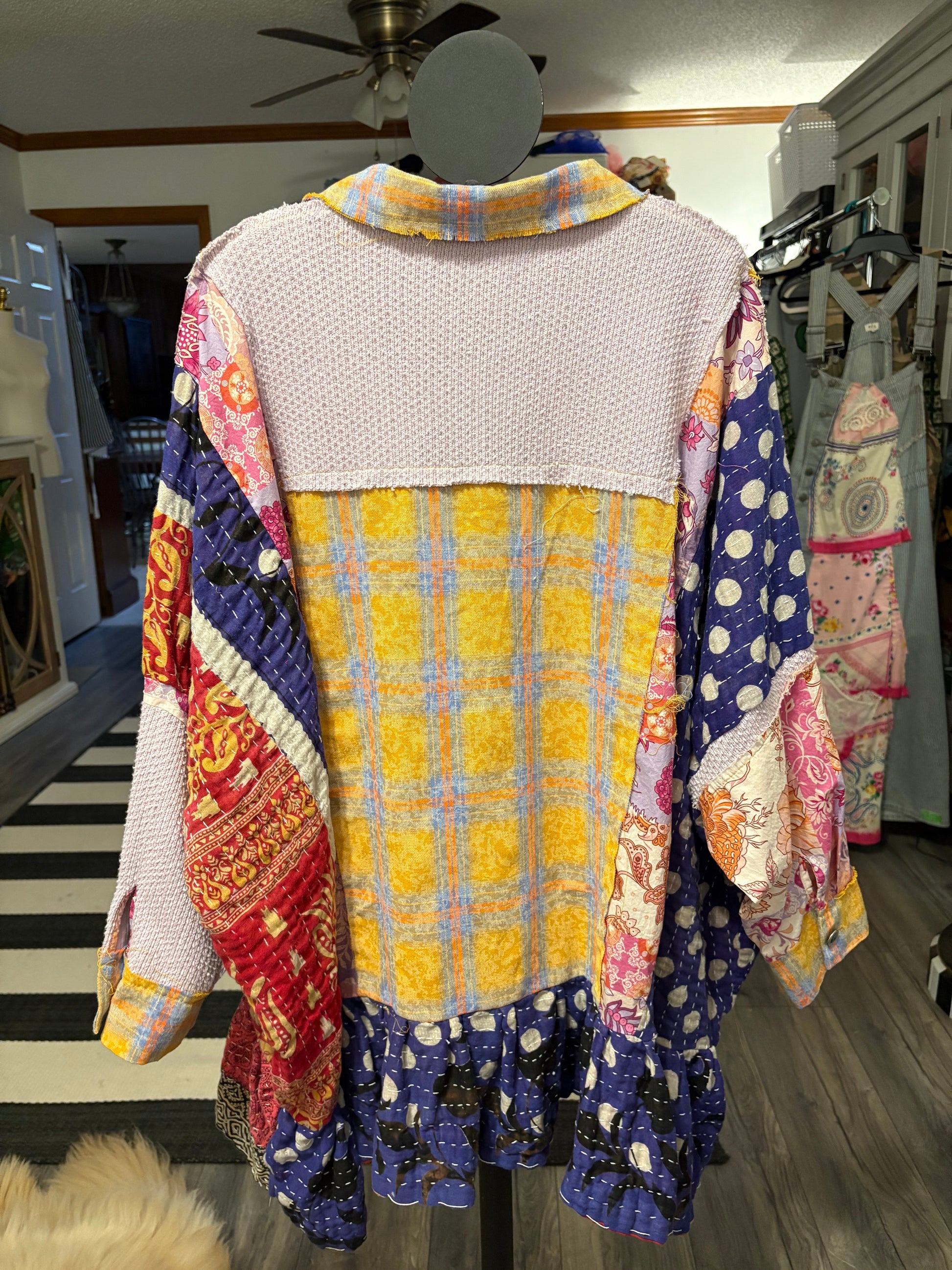Upcycled patchwork button down, and vintage Kantha quilt used to create this gorgeous top! This top is part of the Love, Tabi Collection.. it is handmade, one of a kind and original design! It will be more oversized the smaller you are. Please check measurements before purchasing!!!!***** ONE SIZE FITS MOST Very OVERSIZED!!! Asymmetrical ruffle flowy and flirty hem!!!