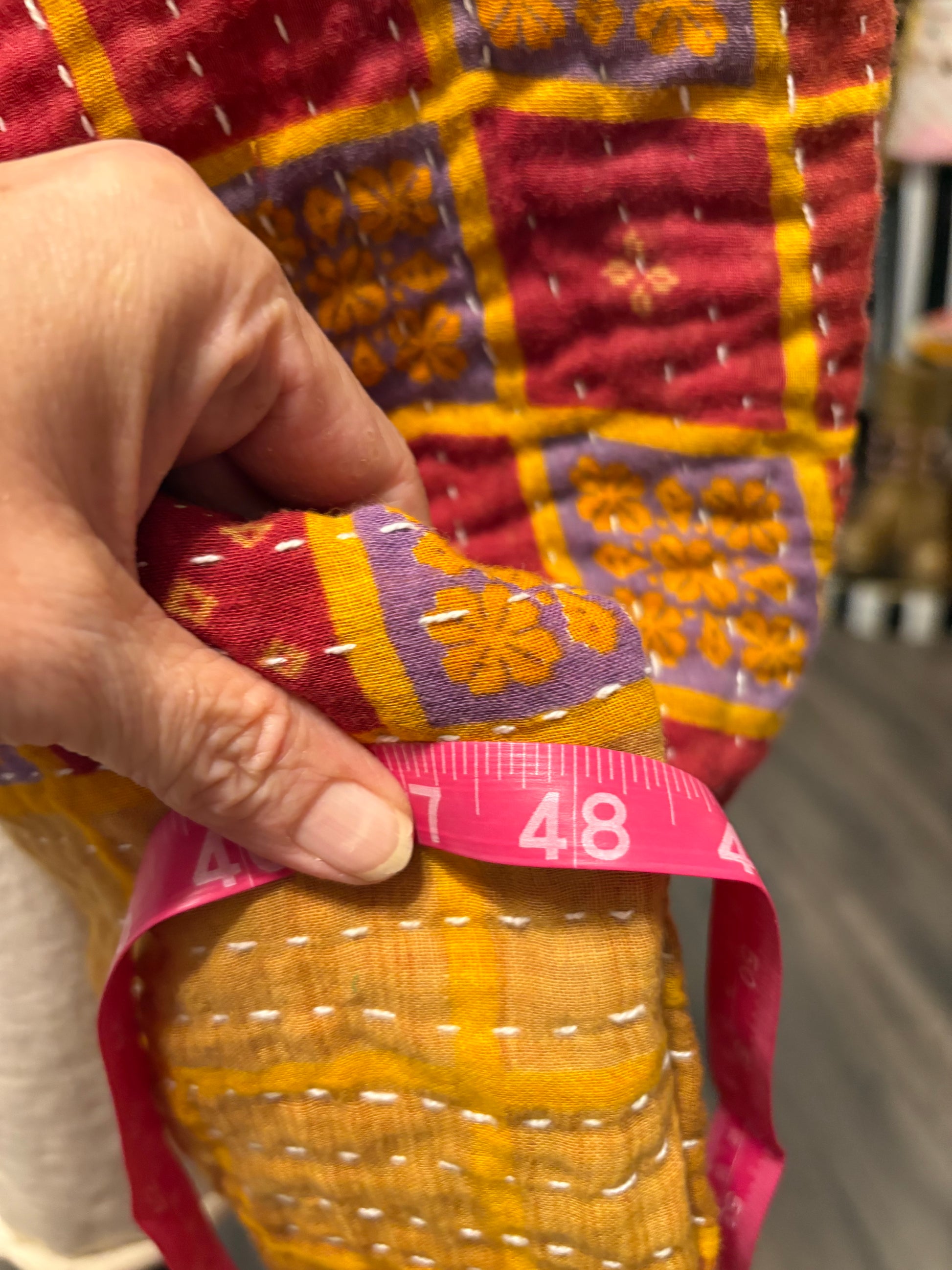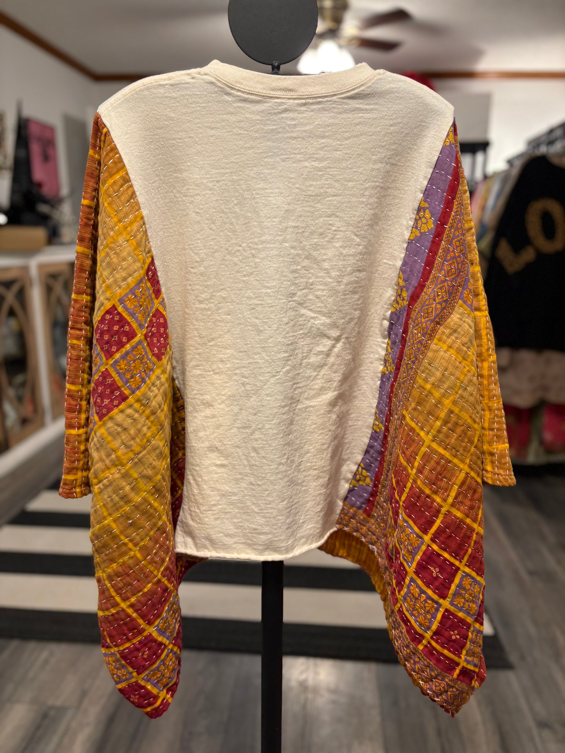Beautiful vintage Kantha quilt and graphic tee paired to make this FABULOUS Upcycled tee. Vintage Kantha quilts have been well loved. They may have white strings (which can be cut) , slight holes, small stains,and may be weathered, rustic and tattered which all lends to the vintage beauty of the top. Perfectly imperfect!!
