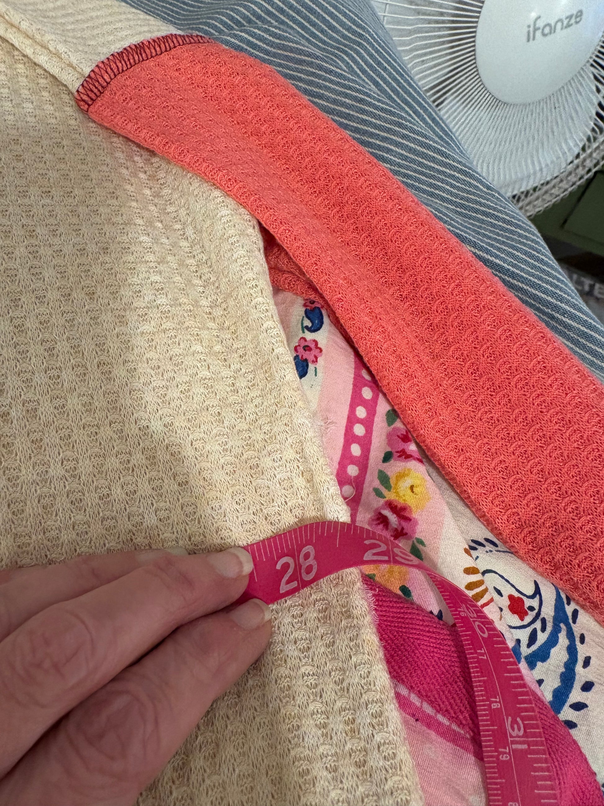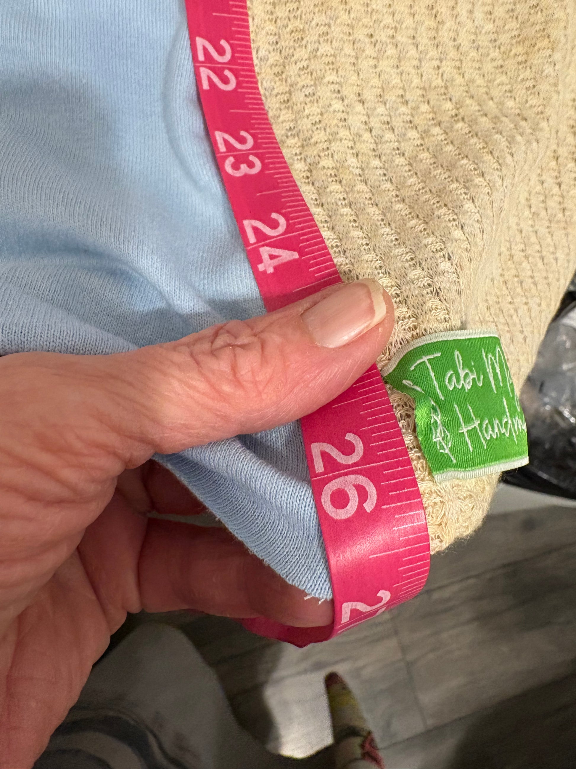 • Handmade from upcycled garments: can include knit tees, sweatshirts, blouses, or vintage textiles