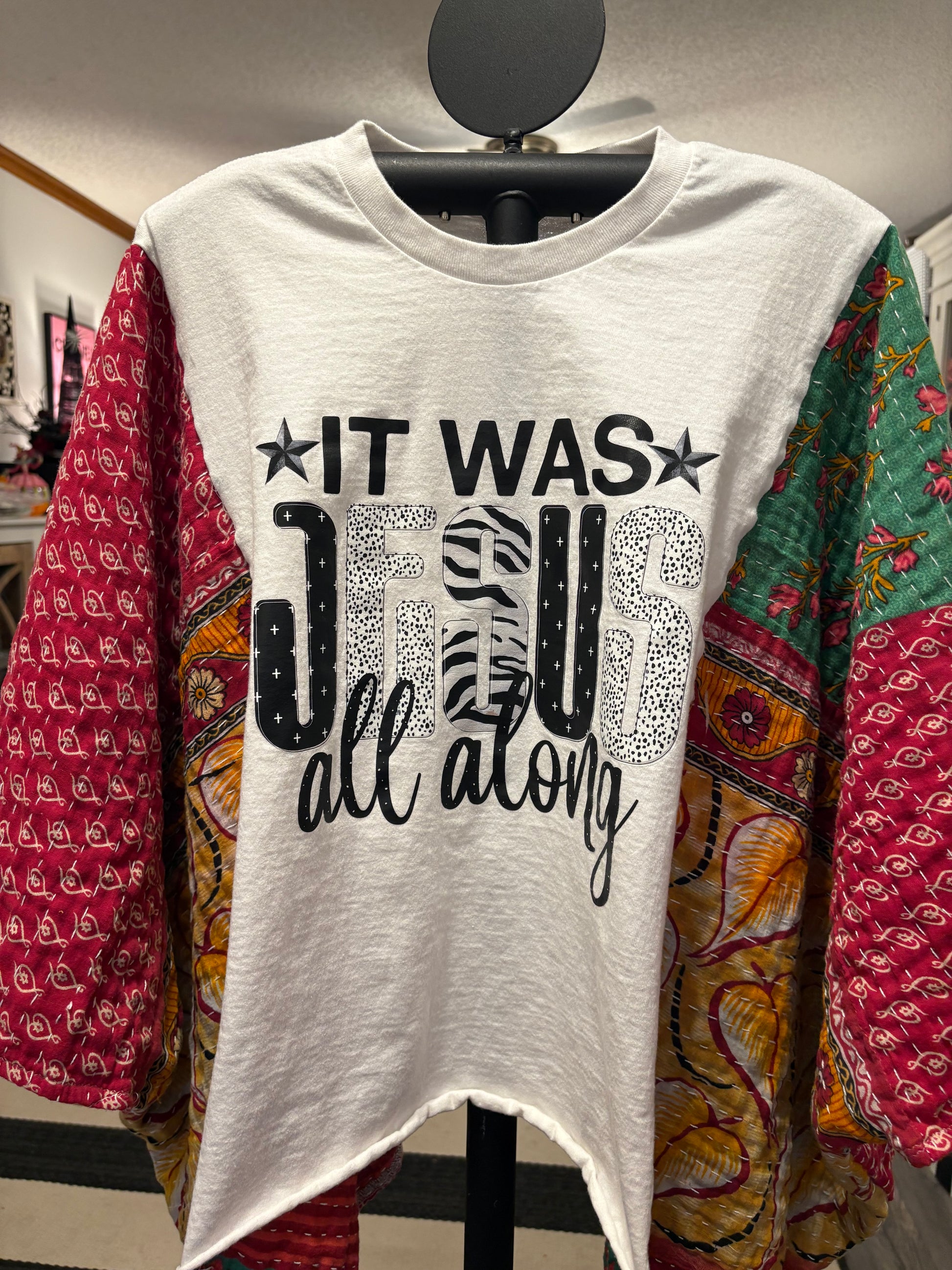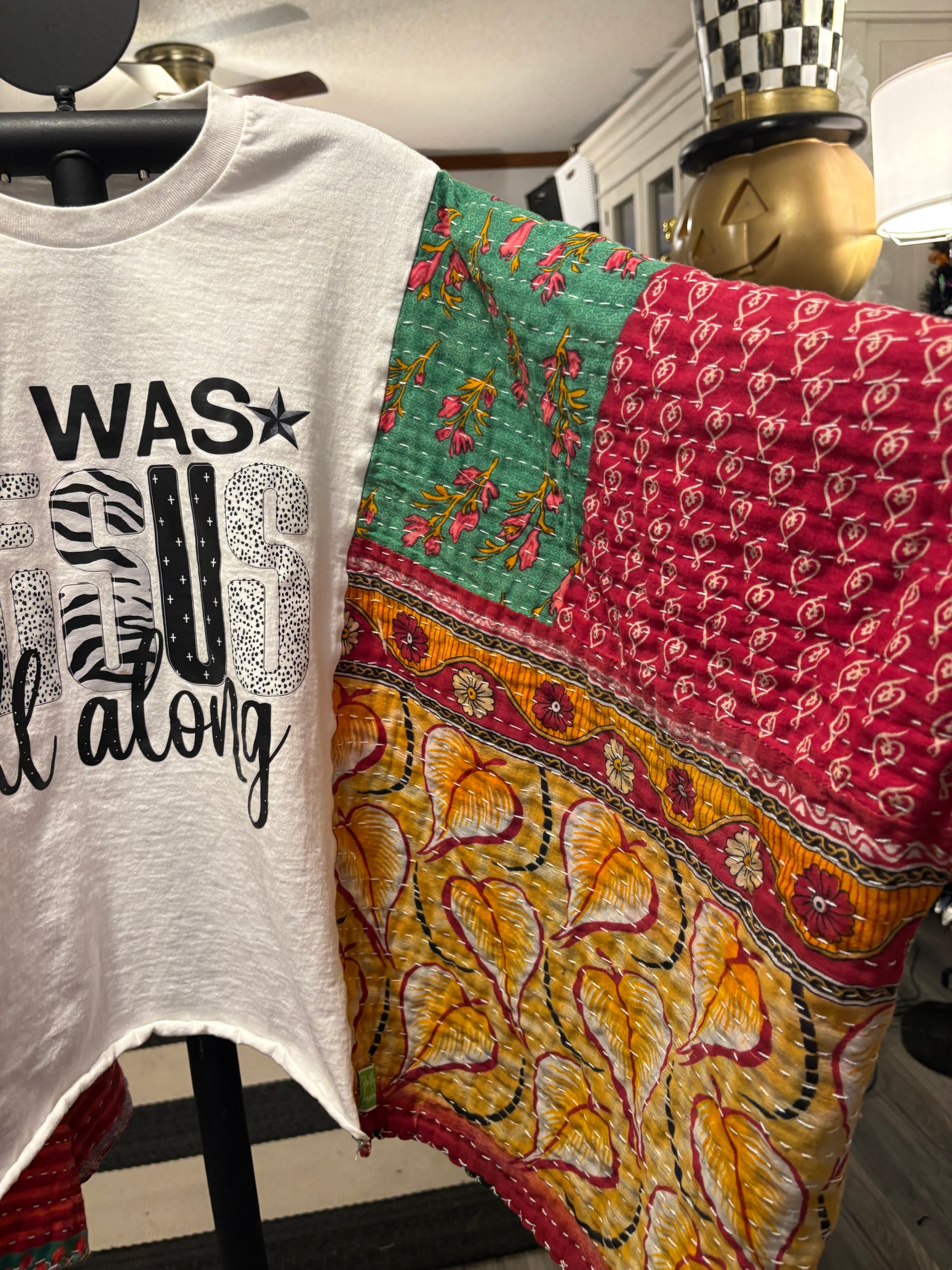 Beautiful vintage Kantha quilt and graphic tee paired to make this FABULOUS Upcycled tee. Vintage Kantha quilts have been well loved. They may have white strings (which can be cut) , slight holes, small stains,and may be weathered, rustic and tattered which all lends to the vintage beauty of the top. Perfectly imperfect!!