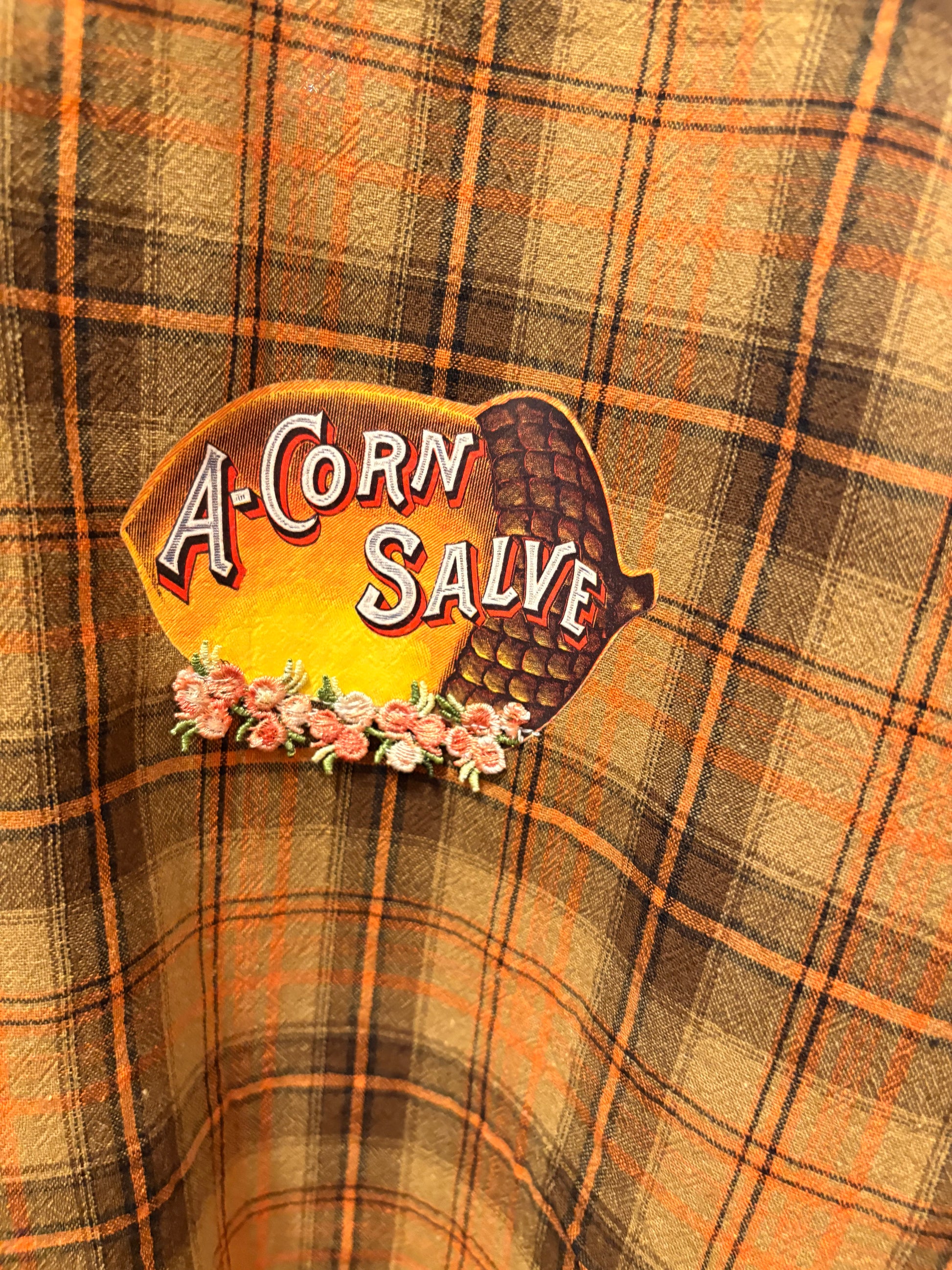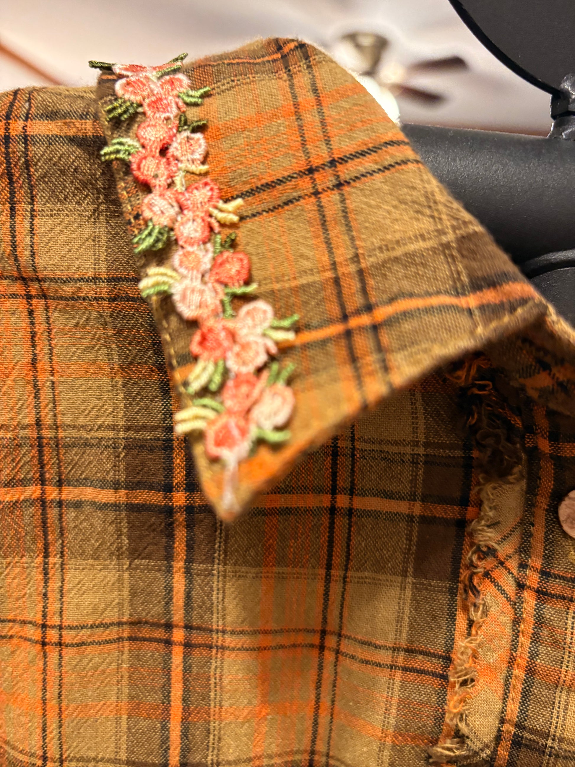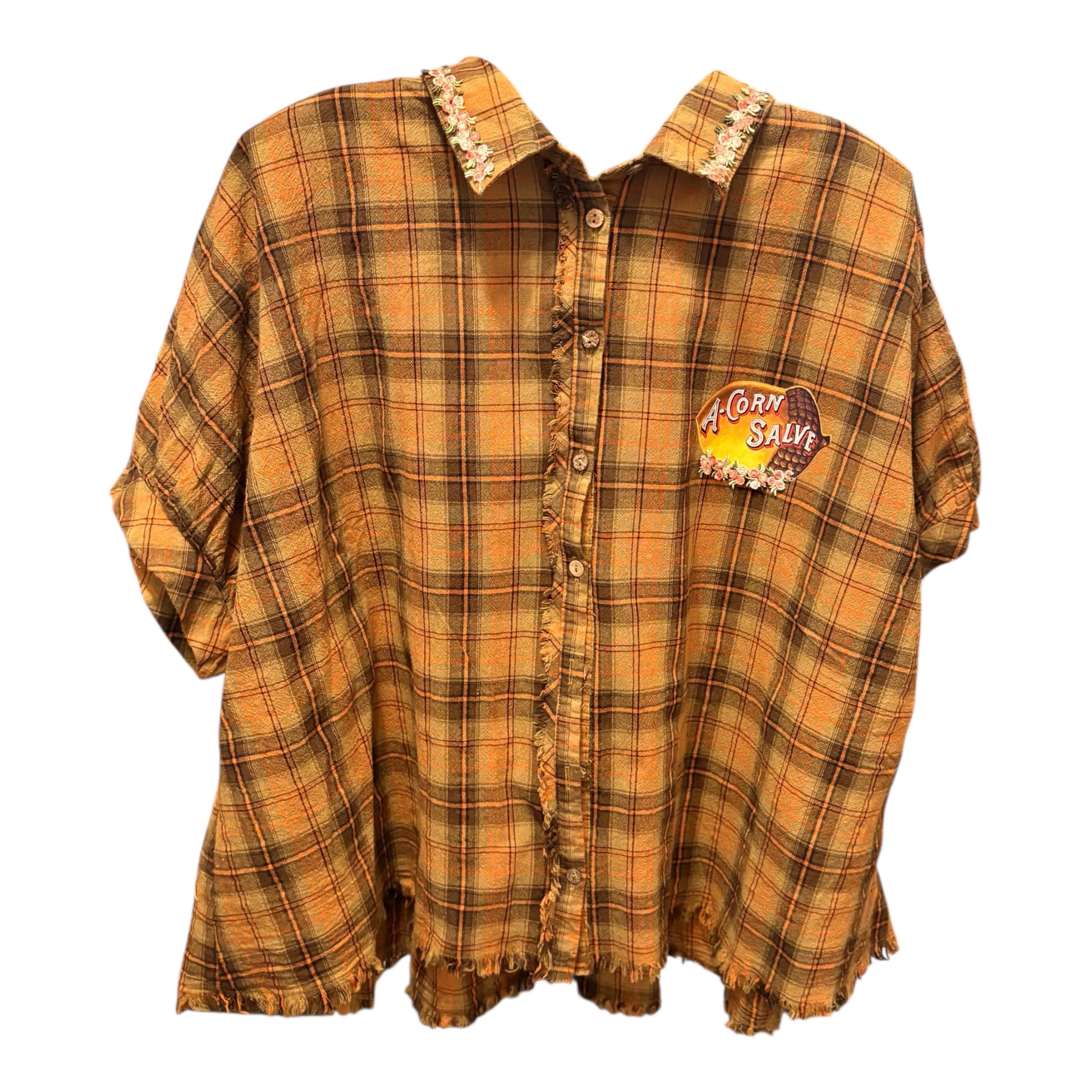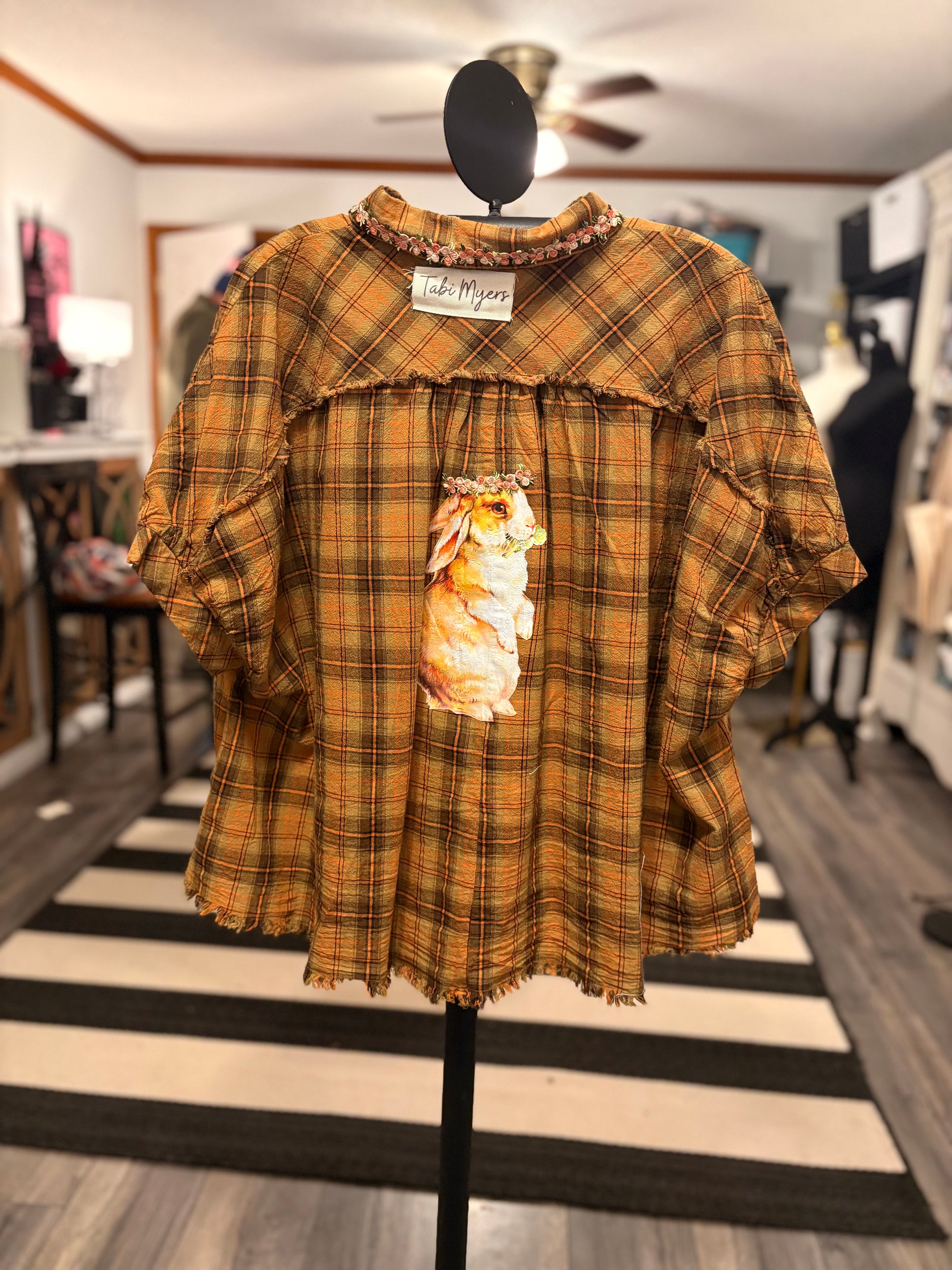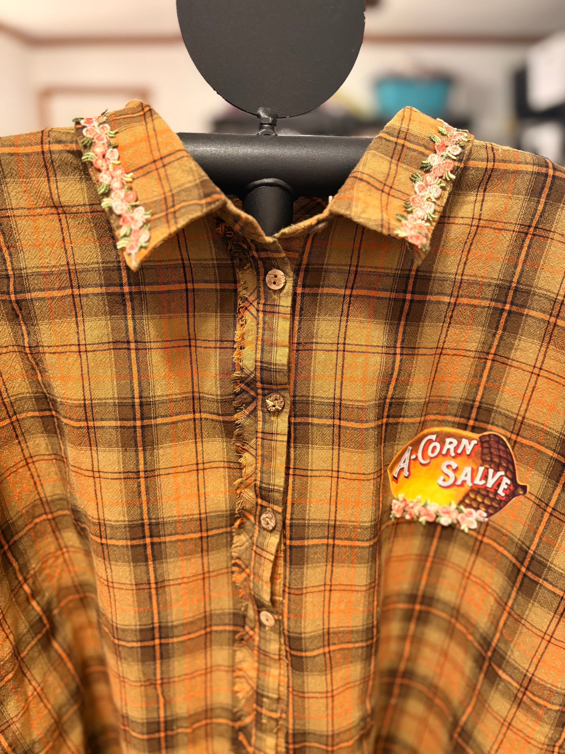 Inspired by Junk Journals.  These tops are a collection of favorite things! Upcycled plaid top with vintage graphics design on the back and front, and crochet and embroidery trim detail. SEW many beautiful details ❤️