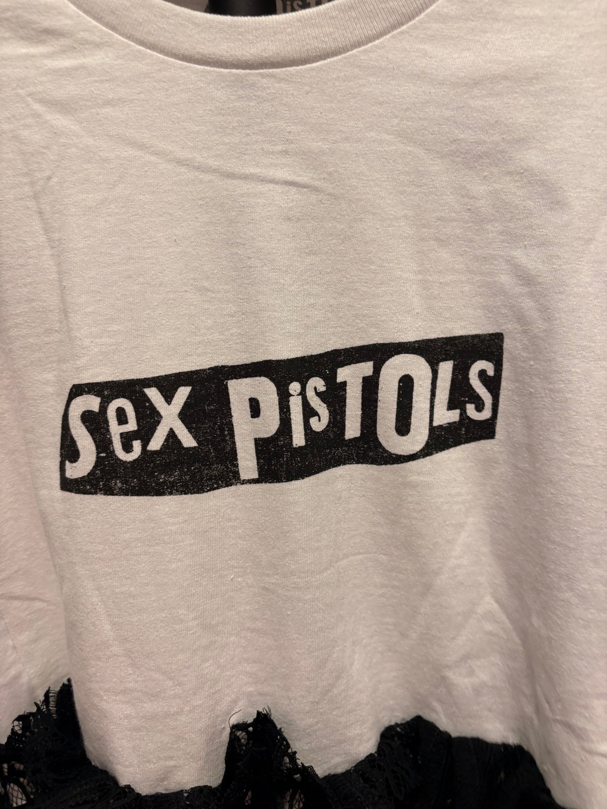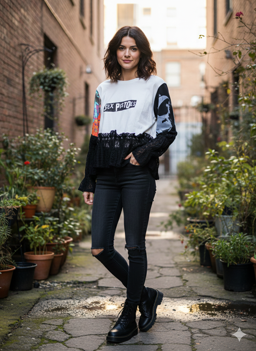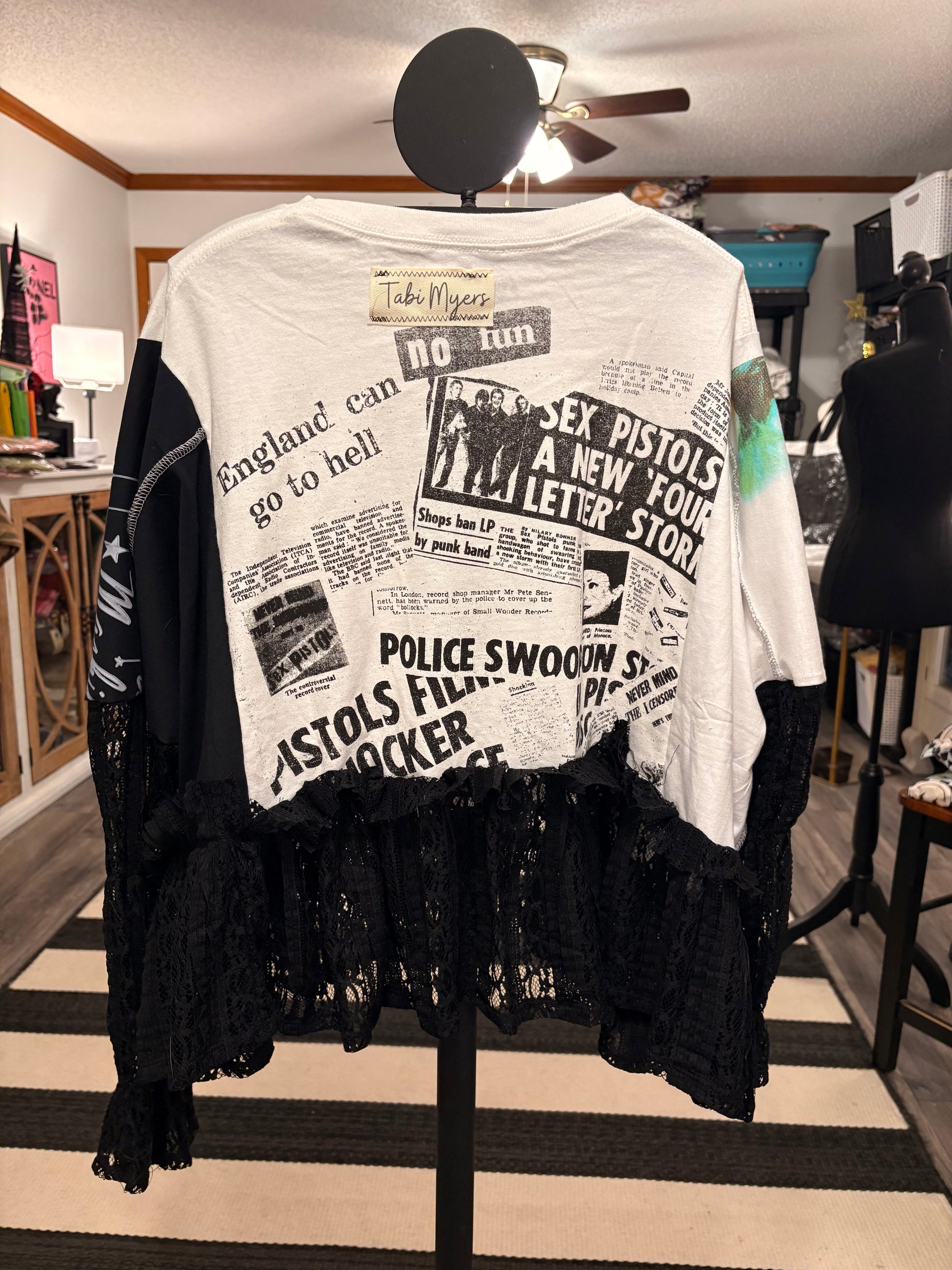 3 Upcycled graphic tees and 3 lace tops used to make this FABULOUS ROCKSTAR and top. Looks great with absolutely everything! You will ROCK this!!!❤️