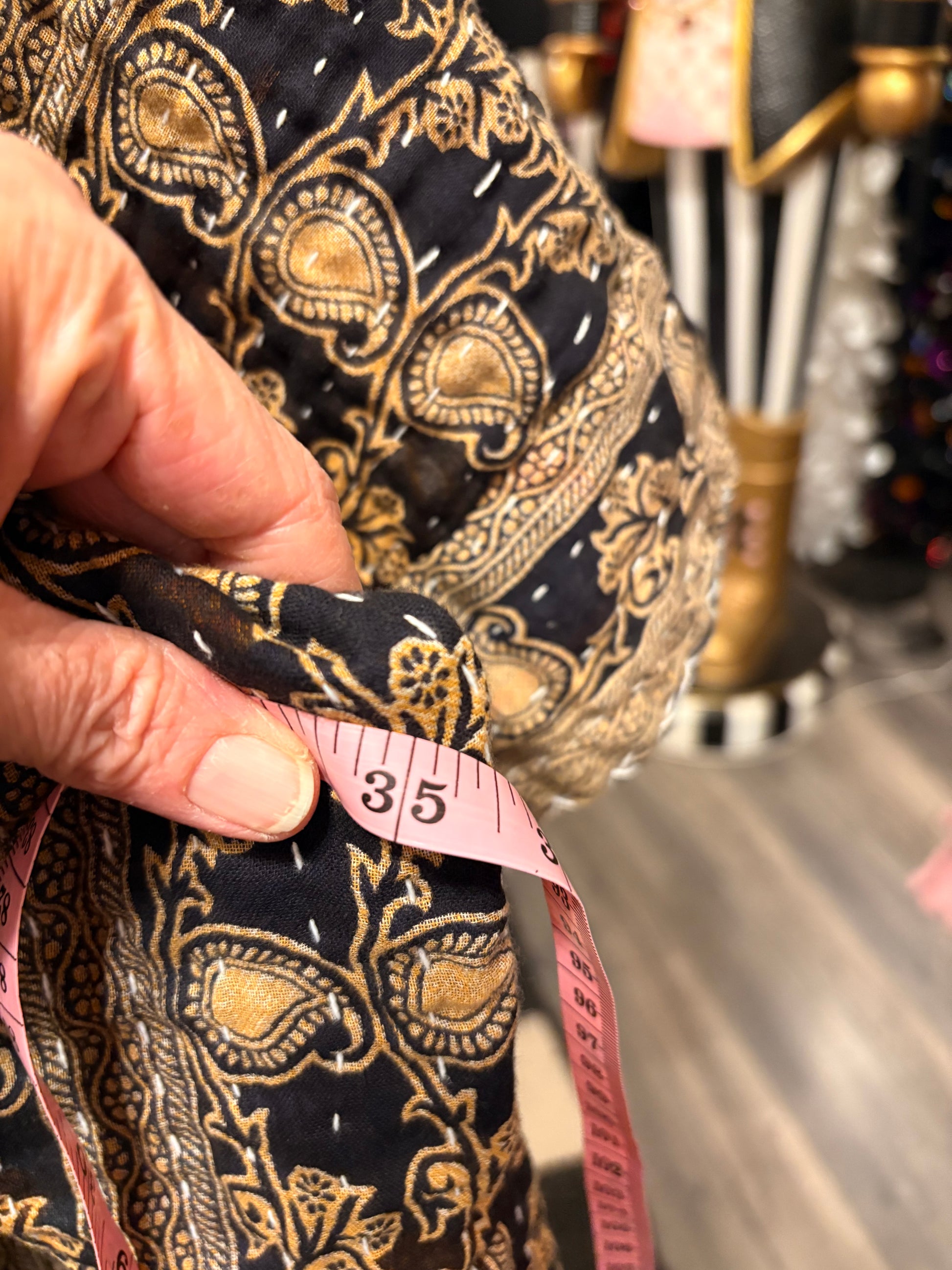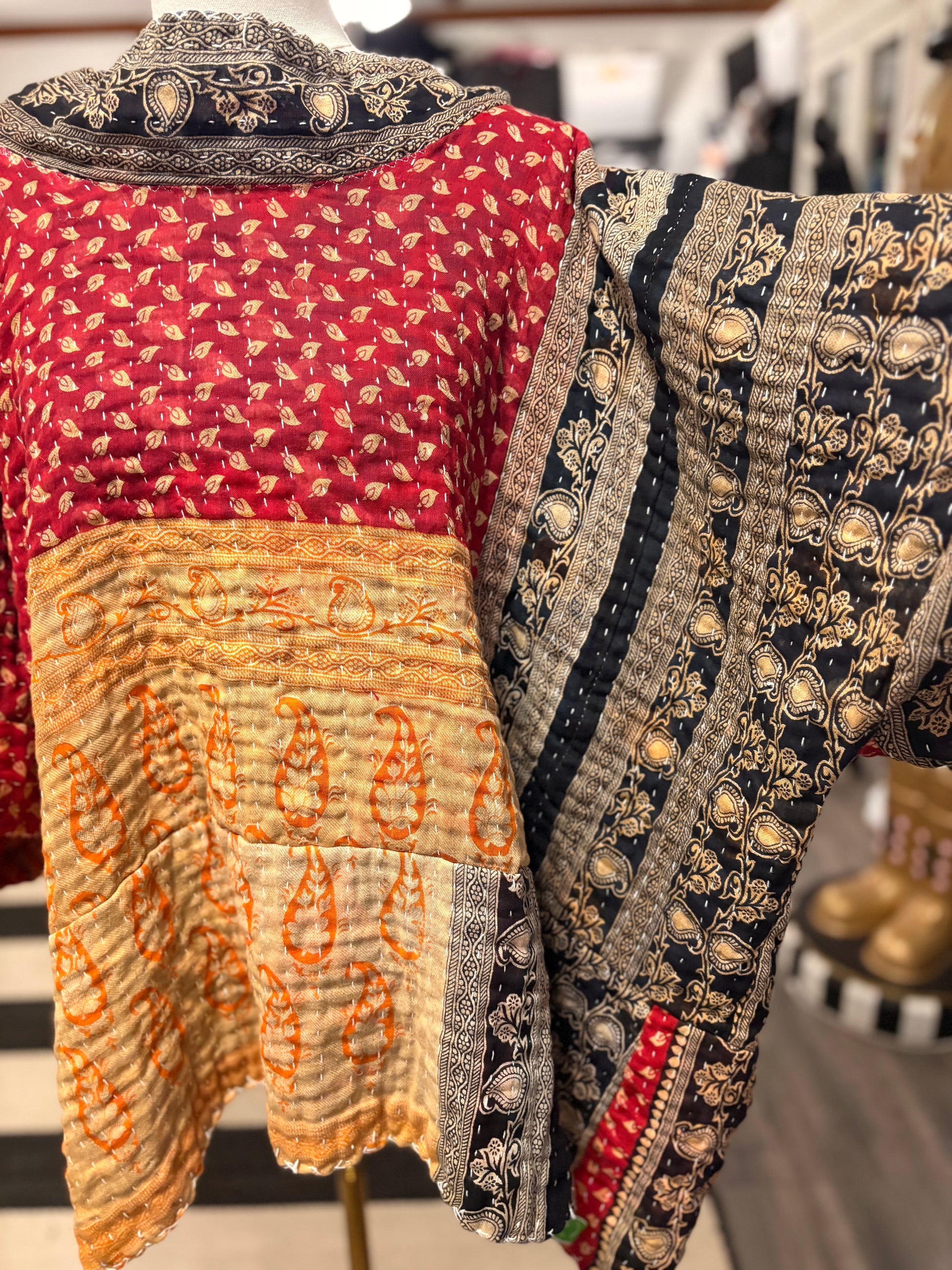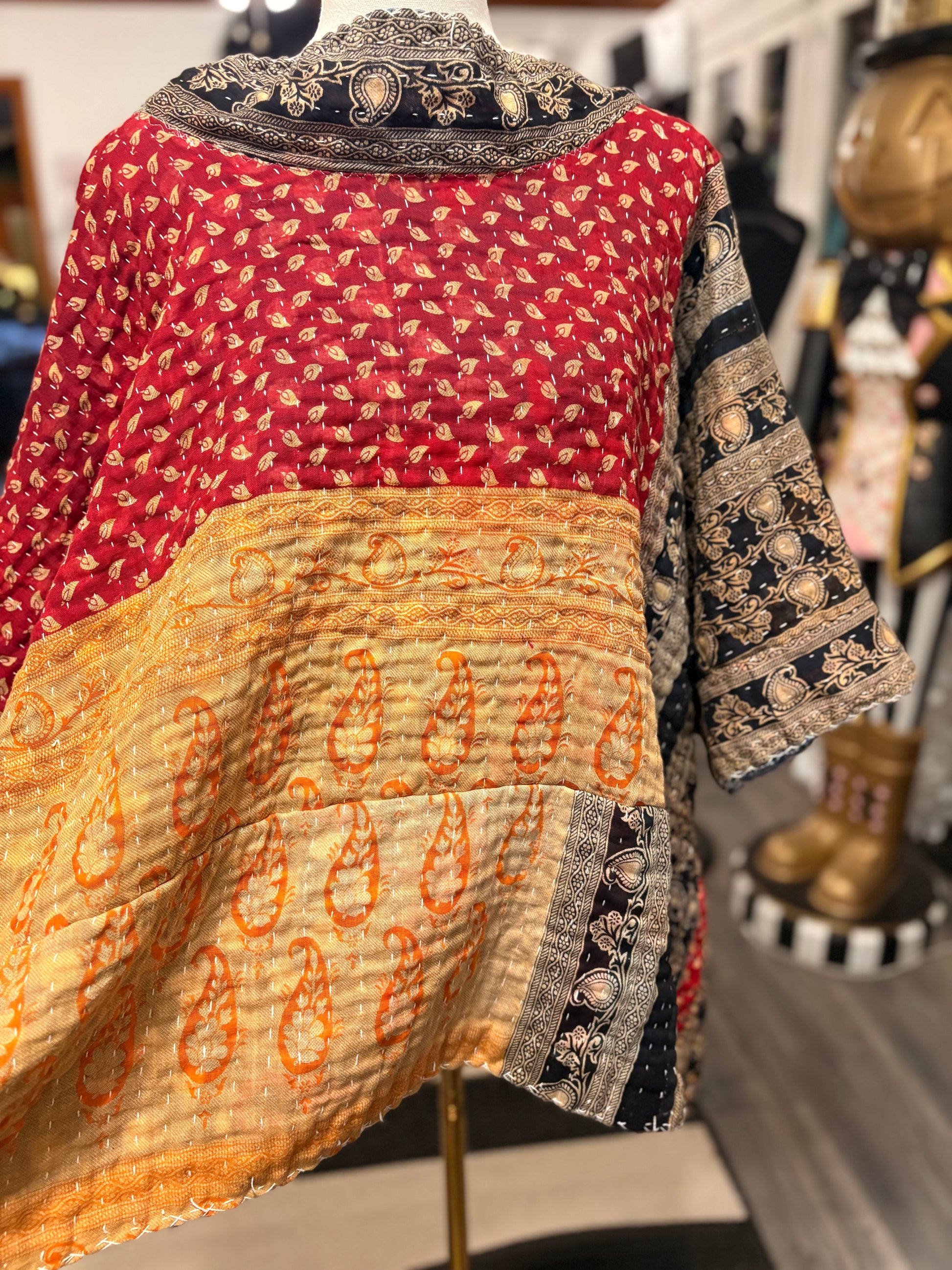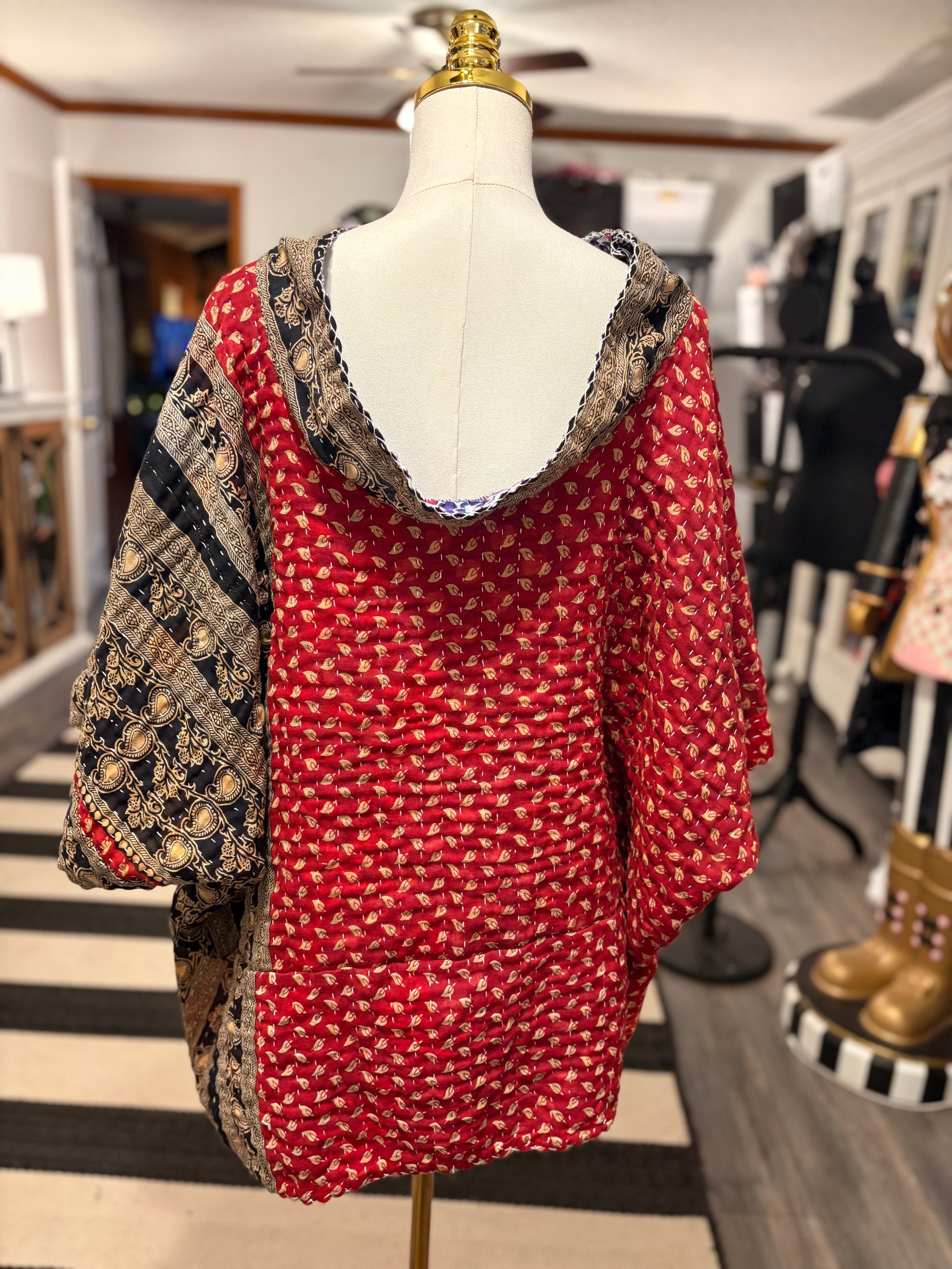 Upcycled Vintage Kantha Quilt used to make this super FABULOUS ART Layering top. Looks great layered over anything!!! Long cropped, side shoulder wide droop neckline and long length. Please check measurements before purchasing!! Will be more oversized the smaller you are. (Small to large will fit side shoulder)