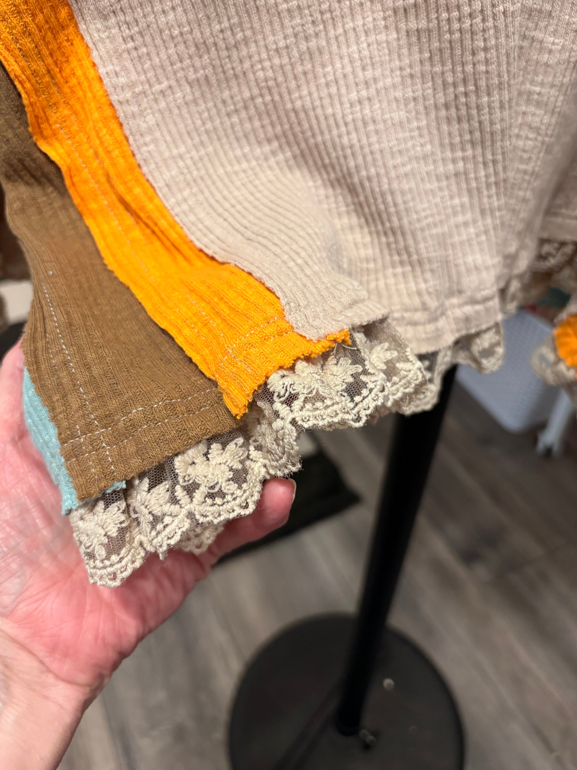 Super comfortable and beautiful knit thermal top with color blacking lace. Flare sleeves and relaxed fit. .. made by Easel Clothing.