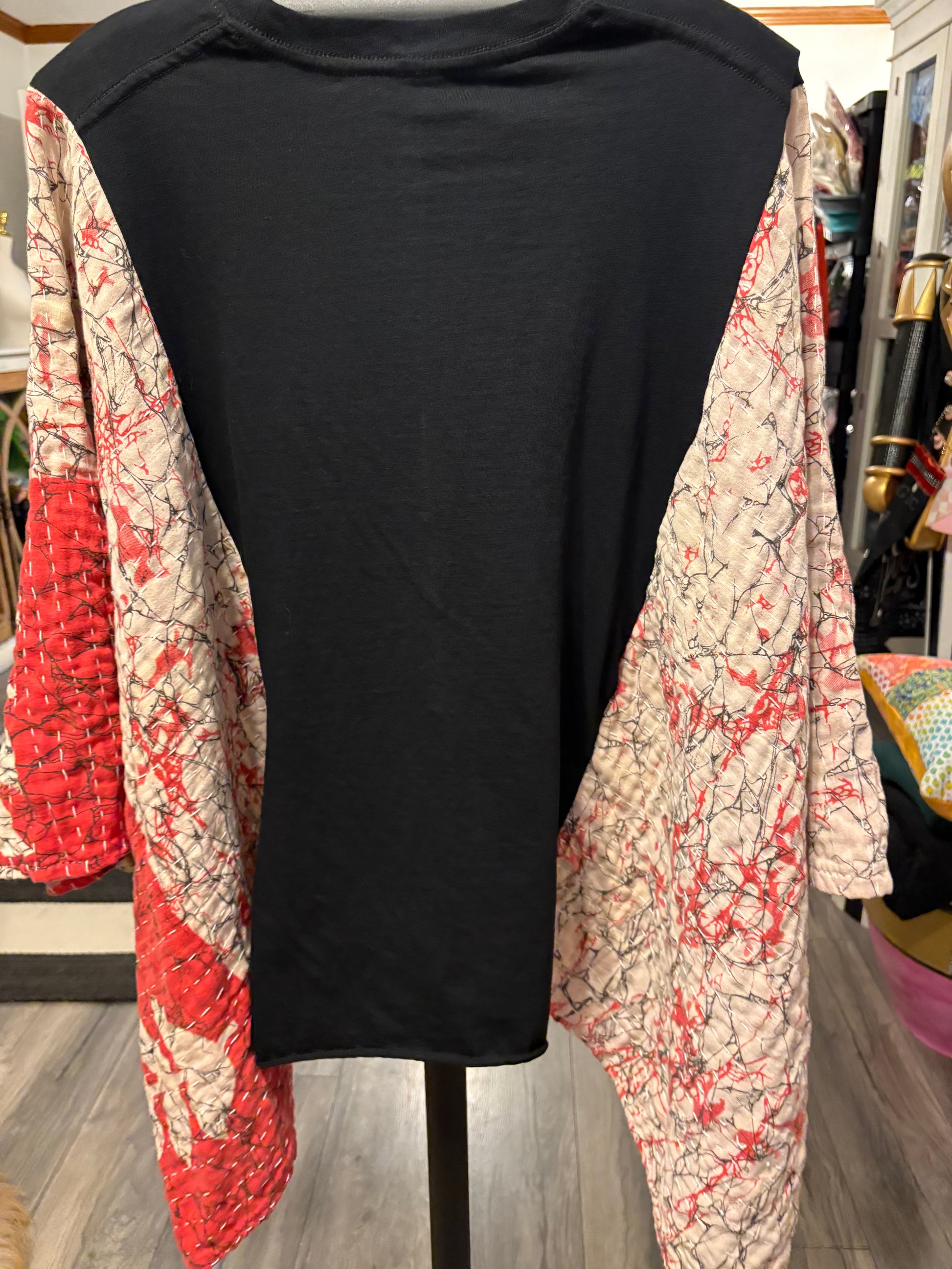 Beautiful vintage Kantha quilt and graphic tee paired to make this FABULOUS Upcycled tee. Vintage Kantha quilts have been well loved. They may have white strings (which can be cut) , slight holes, small stains,and may be weathered, rustic and tattered which all lends to the vintage beauty of the top. Perfectly imperfect!!