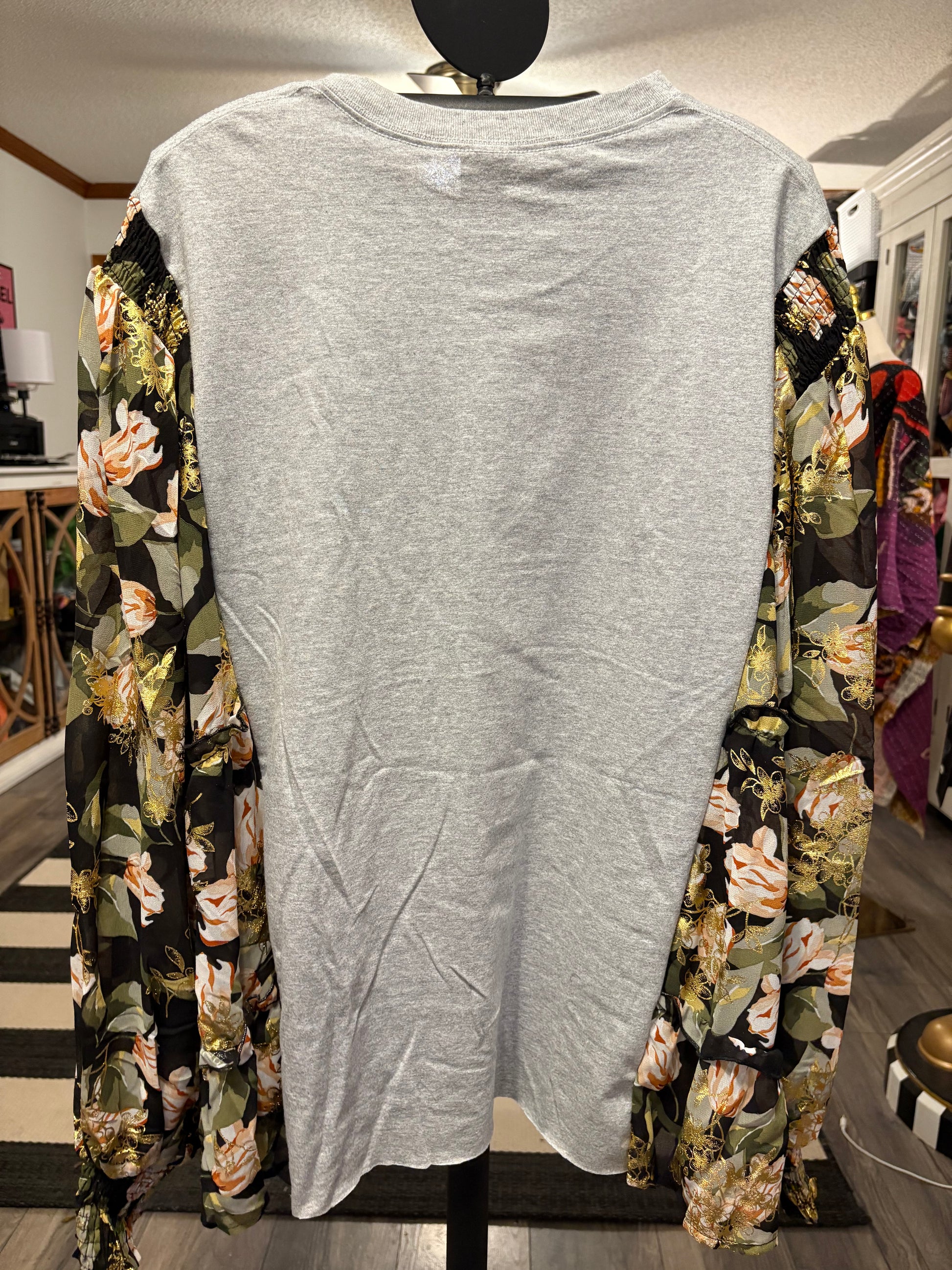 This unique drop sleeve top combines a vintage or upcycled fabric with a graphic tee design to create a sustainable, one-of-a-kind piece. With a relaxed oversized silhouette and long drop sleeves, it’s a comfortable and stylish layering option for casual outfits, streetwear, or cozy lounge looks.