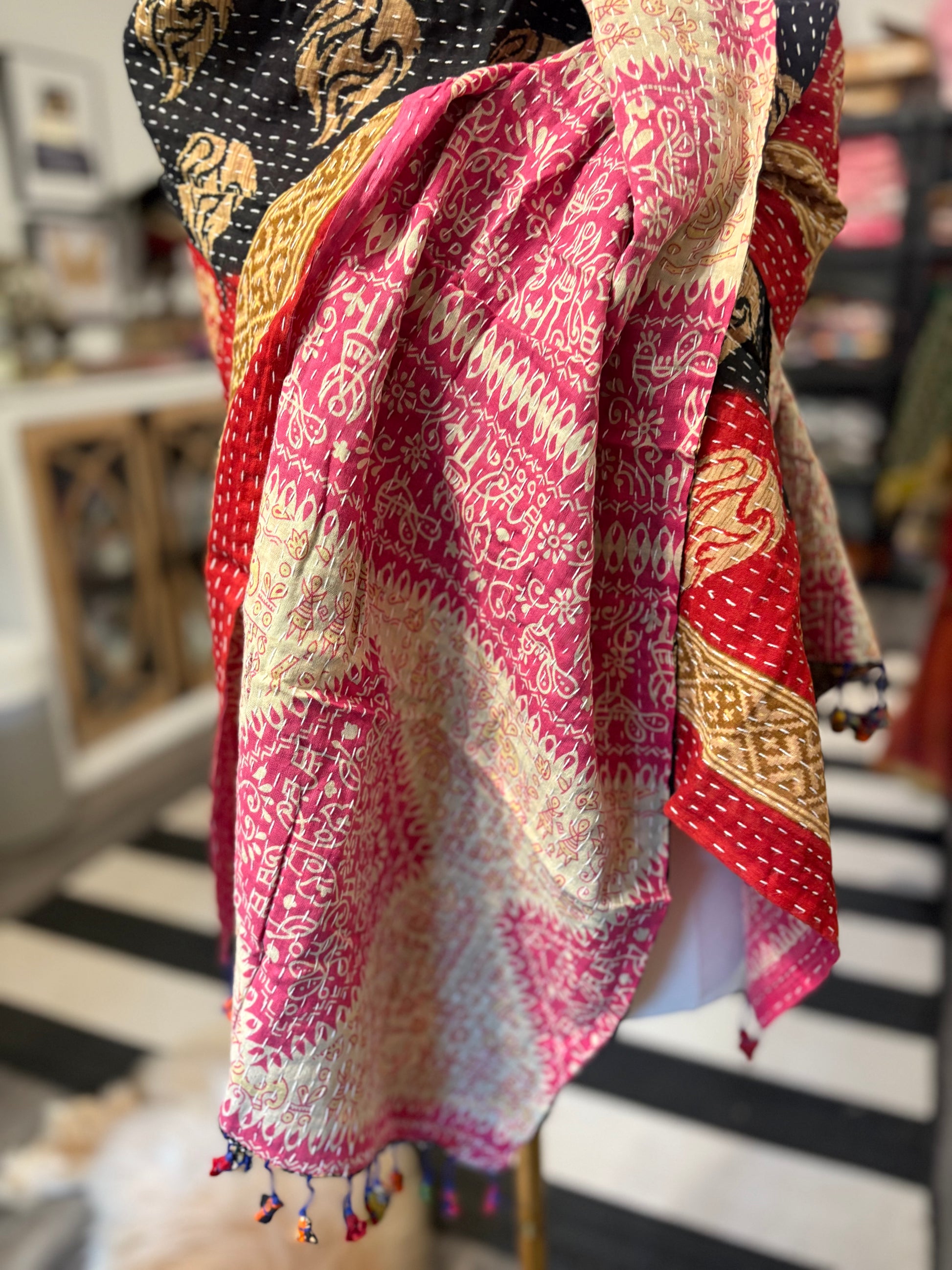 Our Cotton Kantha Scarves are handmade by women artisans in India using 100% cotton up-cycled saris. Each piece is unique and is made from two saris that are stitched together using the traditional “kantha” embroidery technique. • Featuring handmade tassels with vibrant prints and colors on each side, these handmade kantha scarves are works of art and showcase the rich textile crafts of India. • Comes in assorted colors and prints. -------------------------------- • Material: 100% Up-cycled Cotton • Color: Assorted • Shape: Rectangle • Care: Machine Wash in Cold Water • Dimensions: 18" x 70" --------------------------------