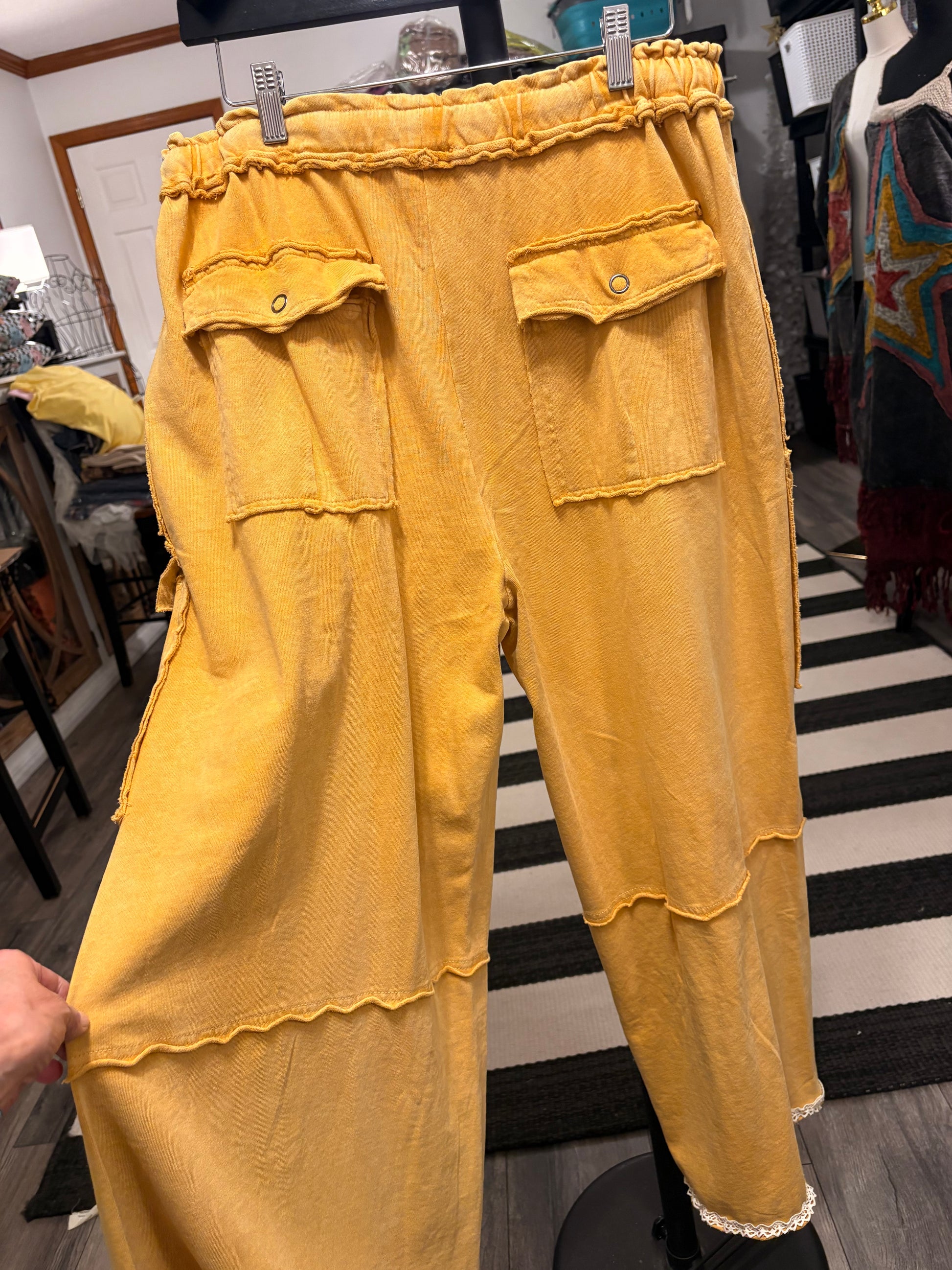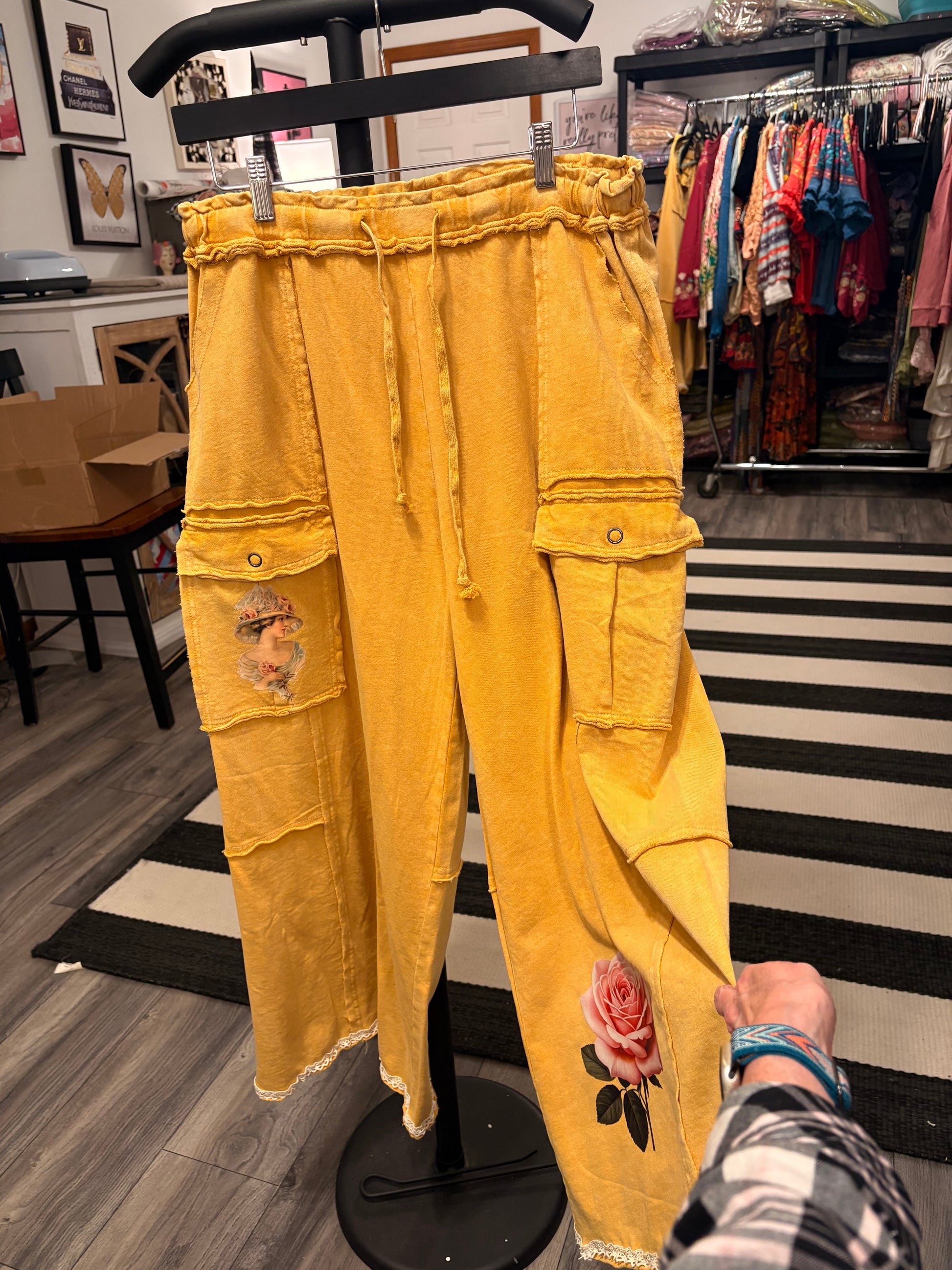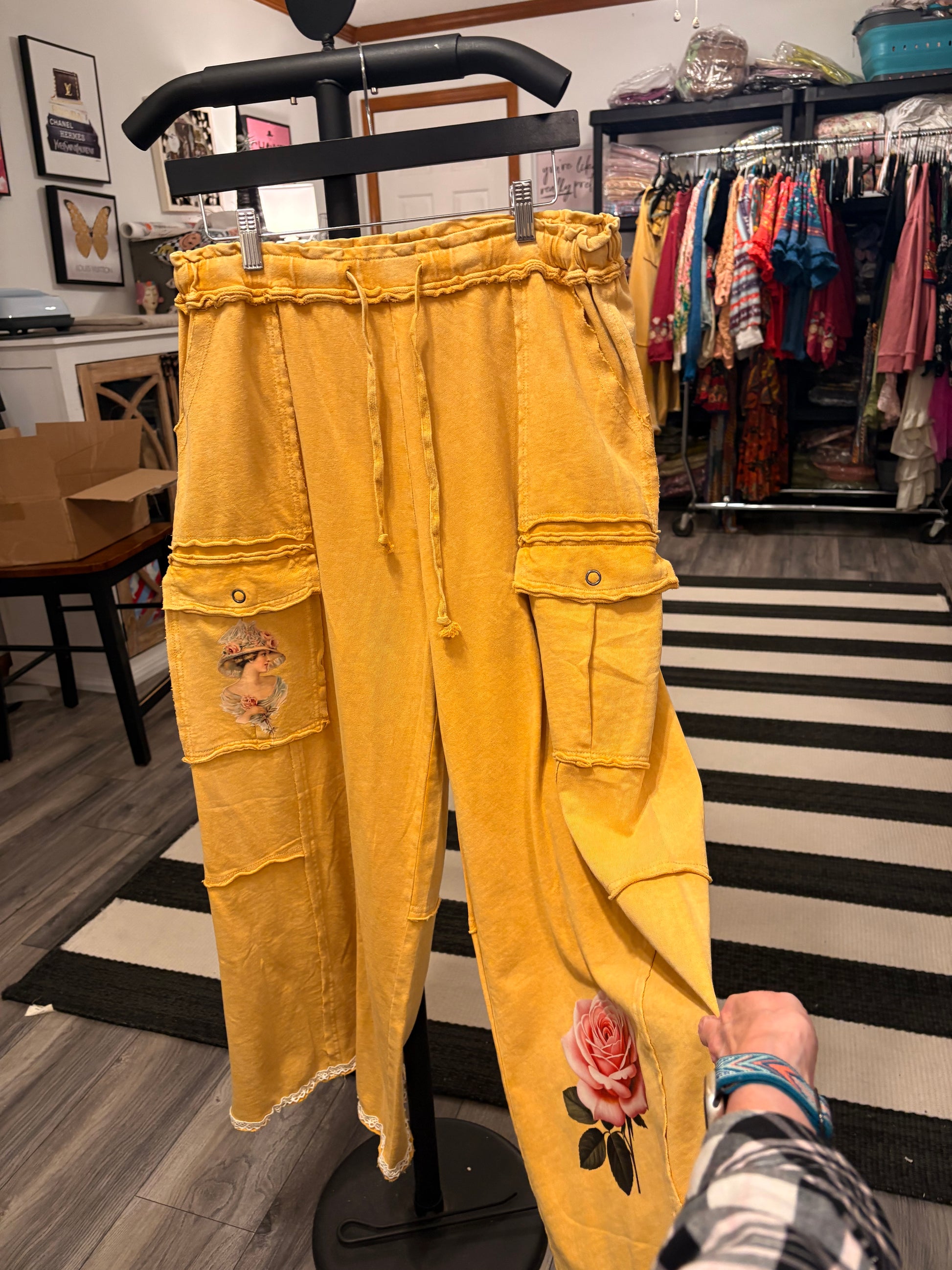 Mineral washed jeans. Brand new boutique brand  cargo jeans. Crochet trim, and soft vinyl image. Cropped ankle length.