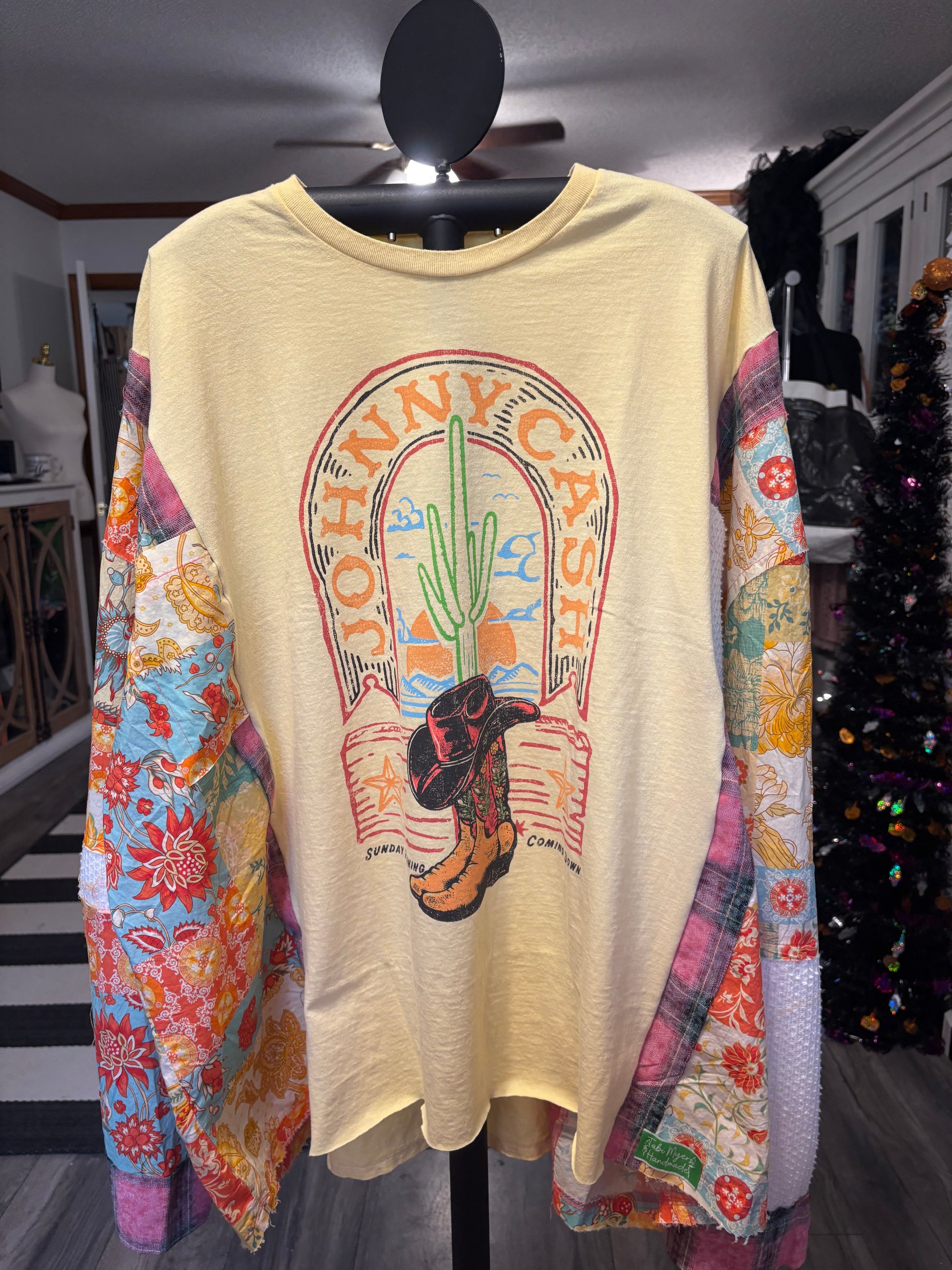 This unique drop sleeve top combines a vintage or upcycled fabric with a graphic tee design to create a sustainable, one-of-a-kind piece. With a relaxed oversized silhouette and long drop sleeves, it’s a comfortable and stylish layering option for casual outfits, streetwear, or cozy lounge looks.