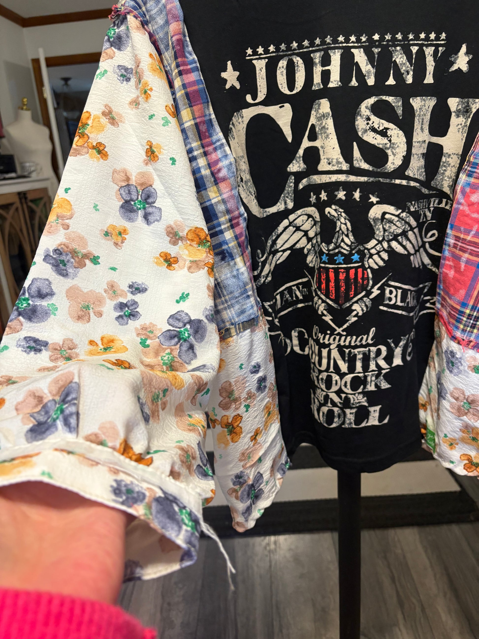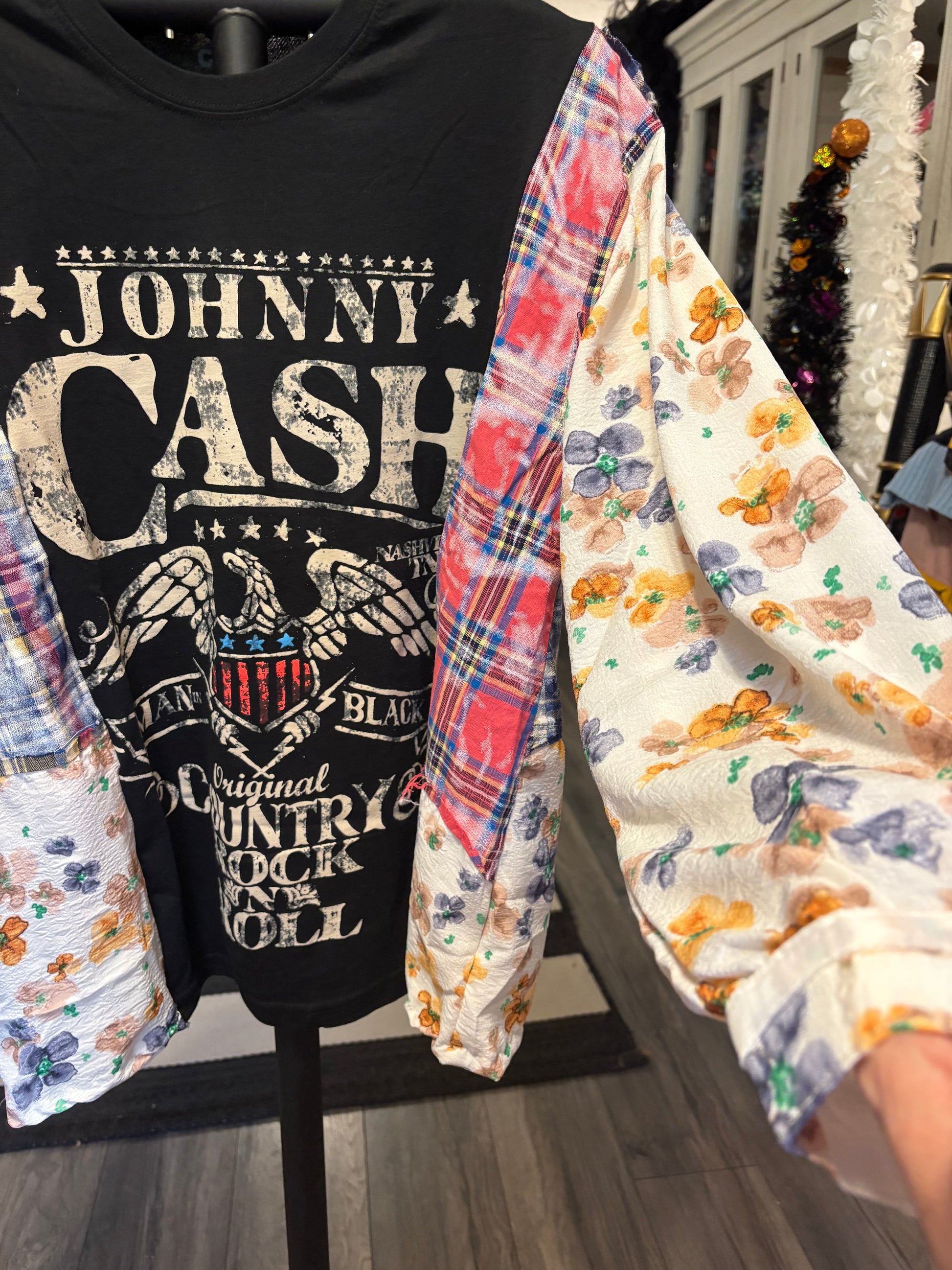 This unique drop sleeve top combines a vintage or upcycled fabric with a graphic tee design to create a sustainable, one-of-a-kind piece. With a relaxed oversized silhouette and long drop sleeves, it’s a comfortable and stylish layering option for casual outfits, streetwear, or cozy lounge looks.
