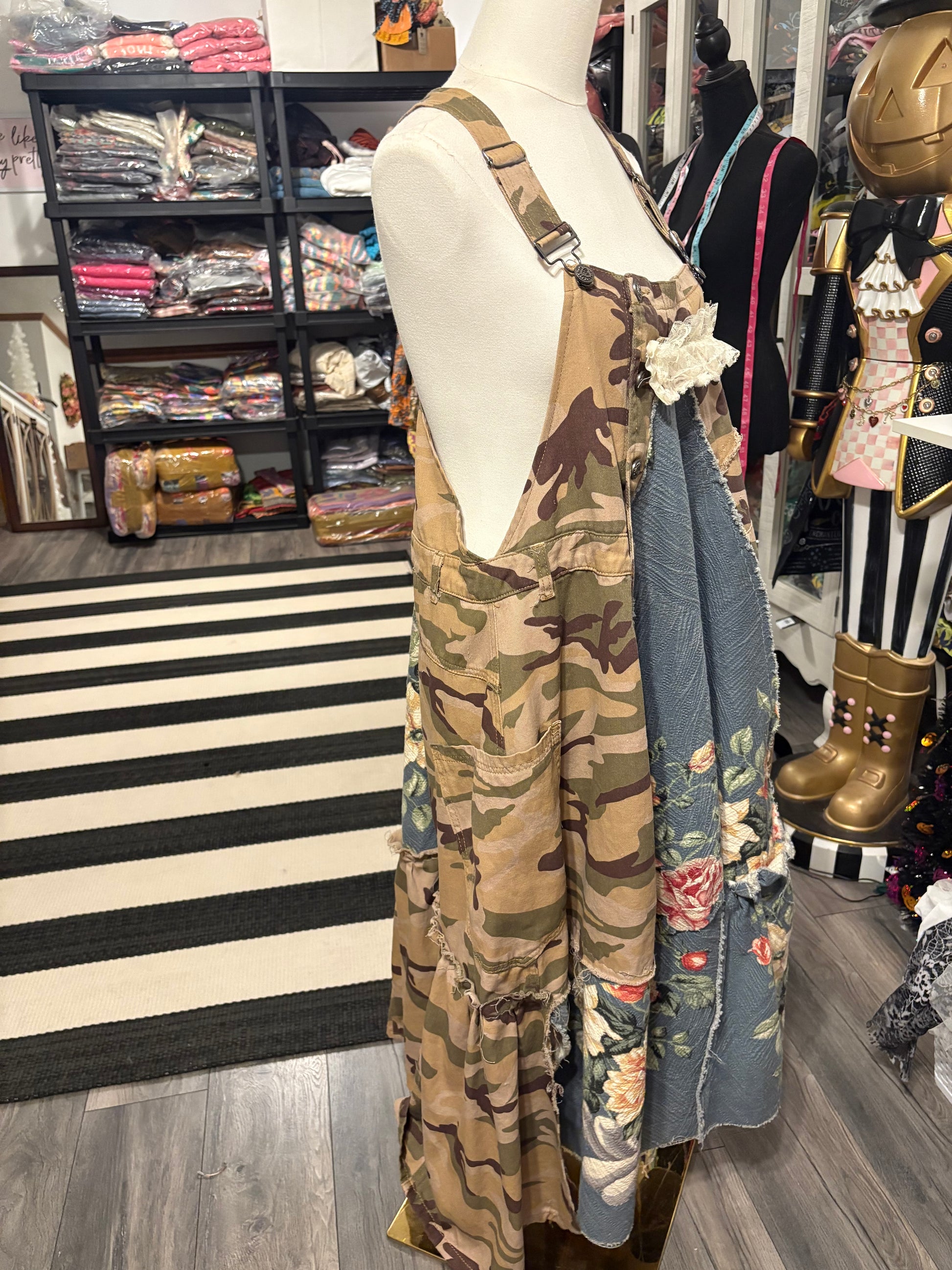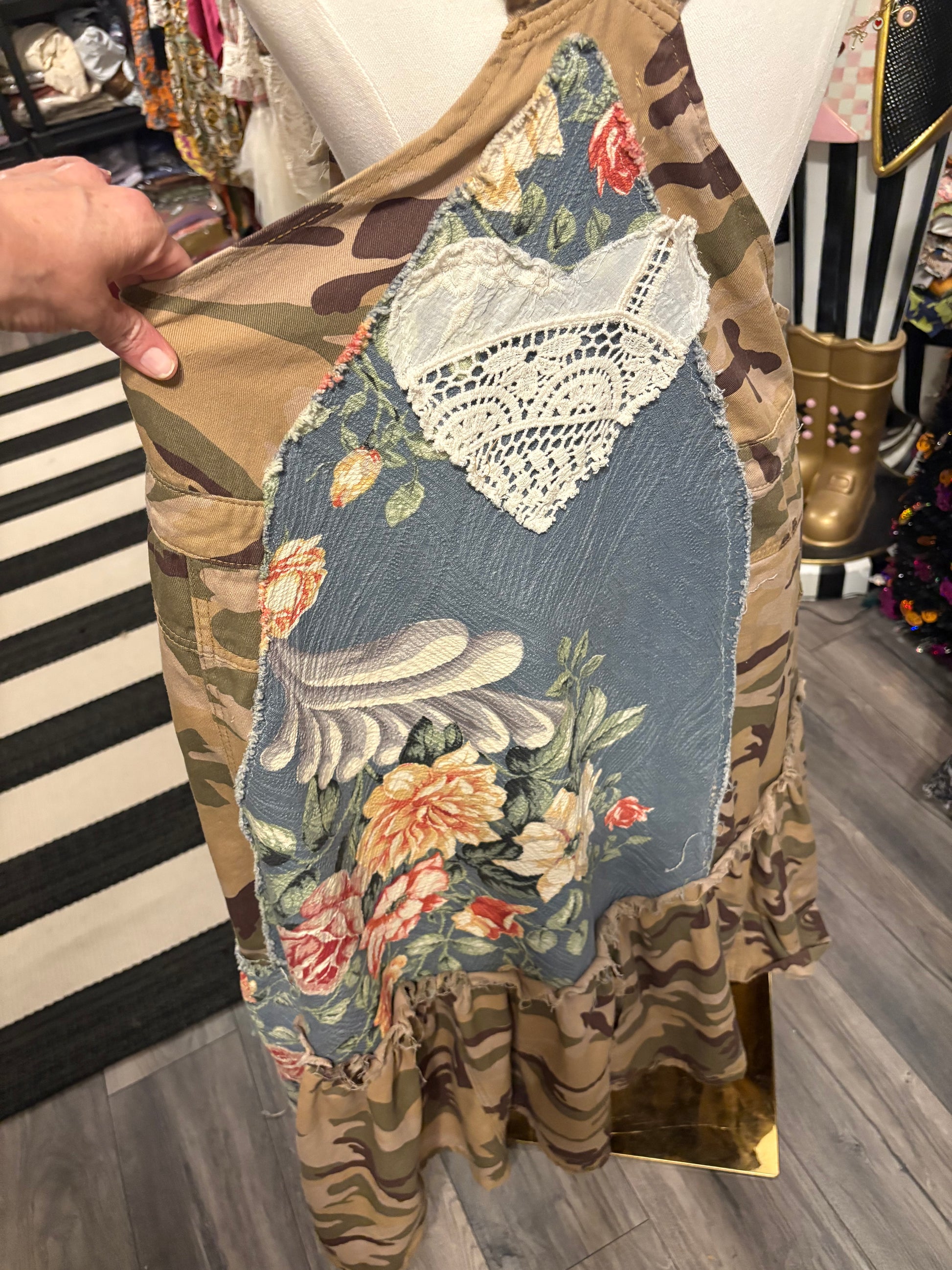 Introducing our brand new line of Patchwork Love Tabi Signature Dresses. Each dress is made from boutique dresses, featuring ruffles, tulle, lace, and crochet details. Each piece is completely unique and handmade!! Shop the Love Tabi collection now. One-2 dresses will be added daily! This dress is patchworked with boutique camo overalls, crochet and lace and vintage linens.