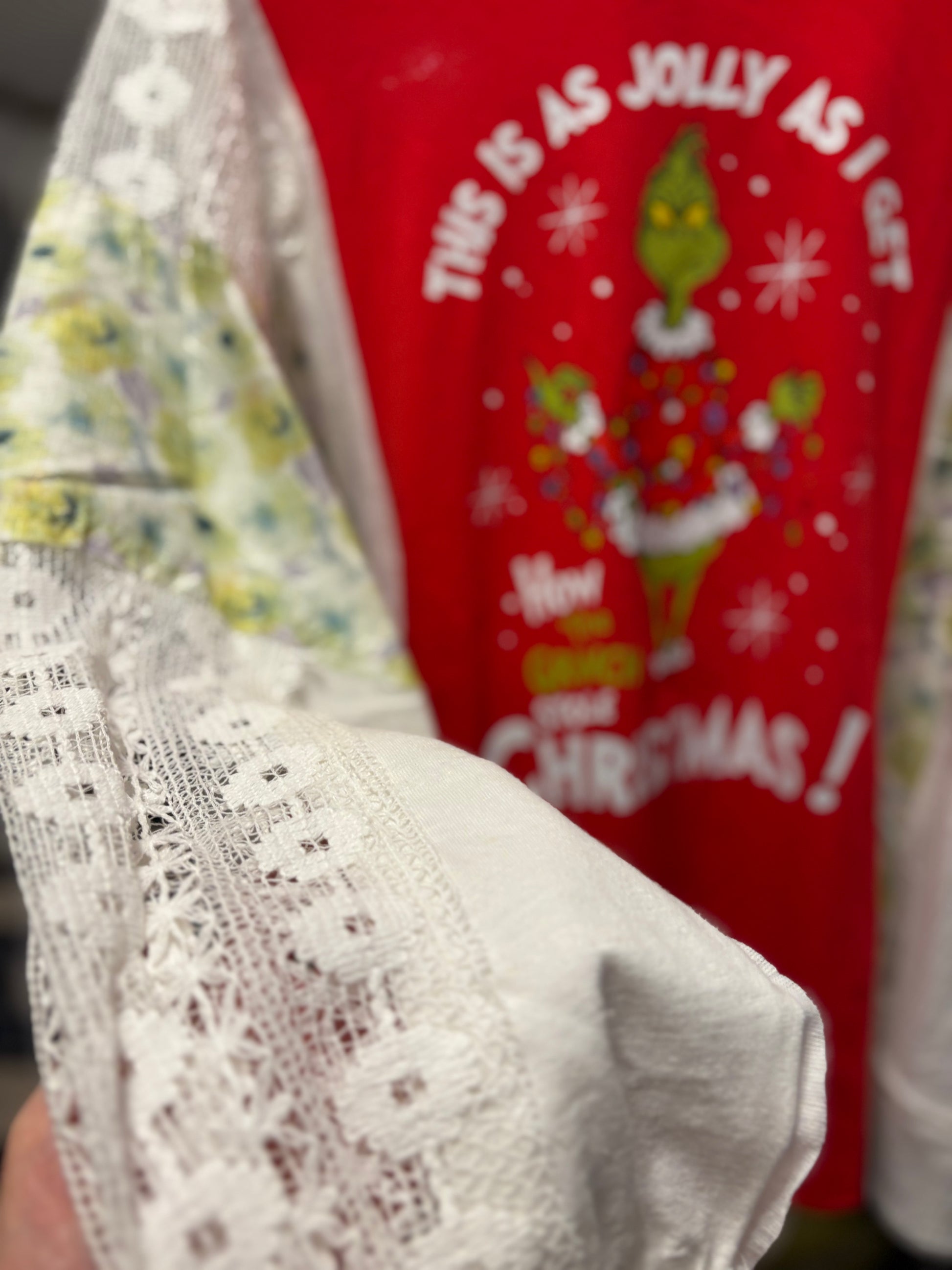 Jolly Grinch Upcycled Frayed Lace Sleeve Tee One Size Fits Small to XXL Oversized