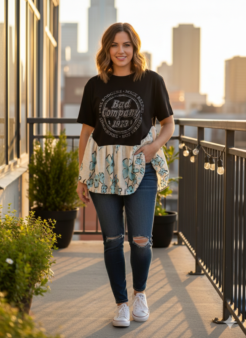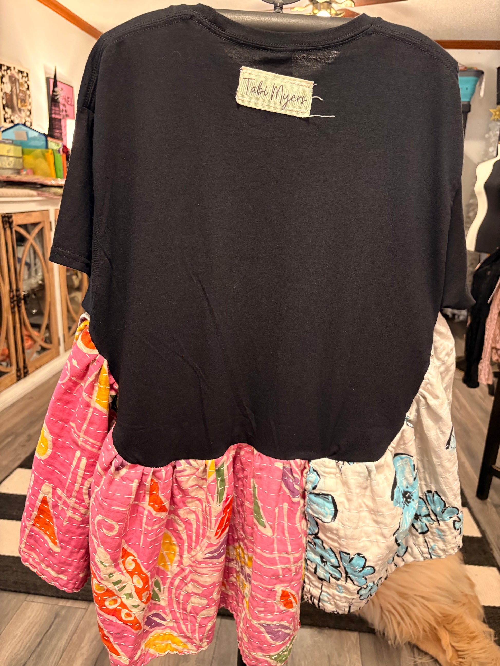 Upcycled vintage Kantha quilt and Upcycled graphic tee used to make this beautiful ruffled Rock Angel Tee. Oversized and GORGEOUS! Super cute and cozy!! Perfect for ALL seasons!