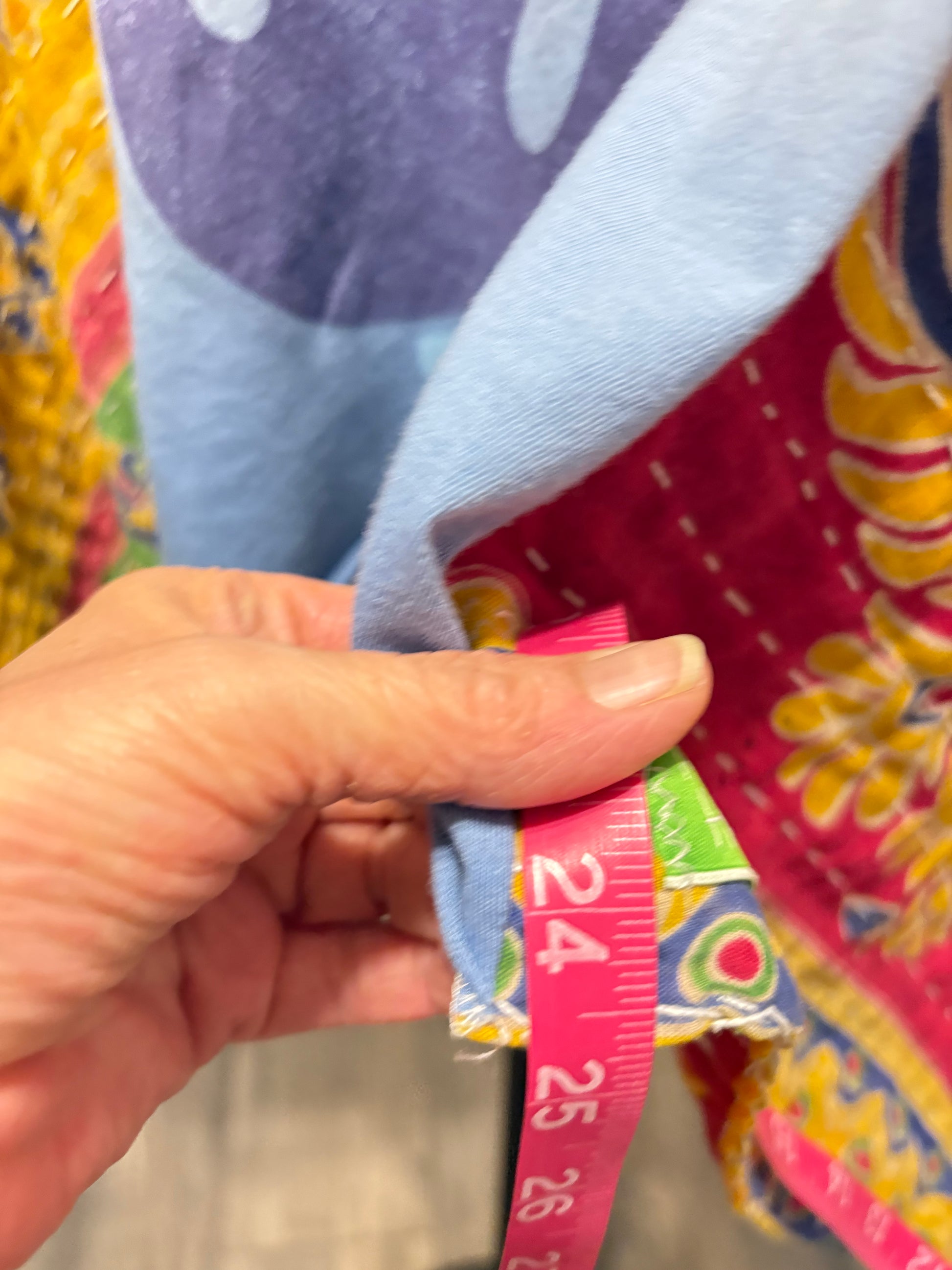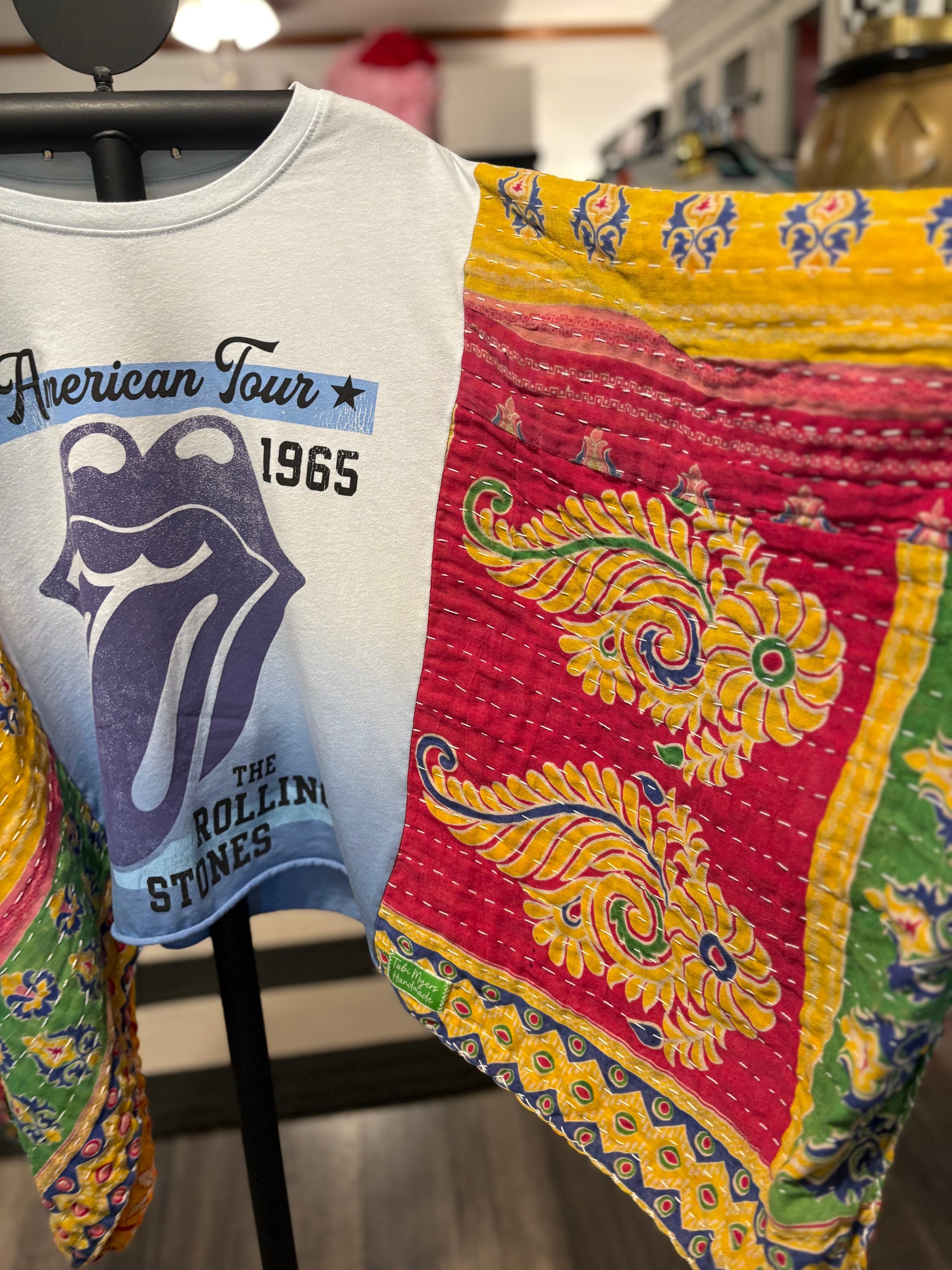 Beautiful vintage Kantha quilt and graphic tee paired to make this FABULOUS Upcycled tee. Vintage Kantha quilts have been well loved. They may have white strings (which can be cut) , slight holes, small stains,and may be weathered, rustic and tattered which all lends to the vintage beauty of the top. Perfectly imperfect!!