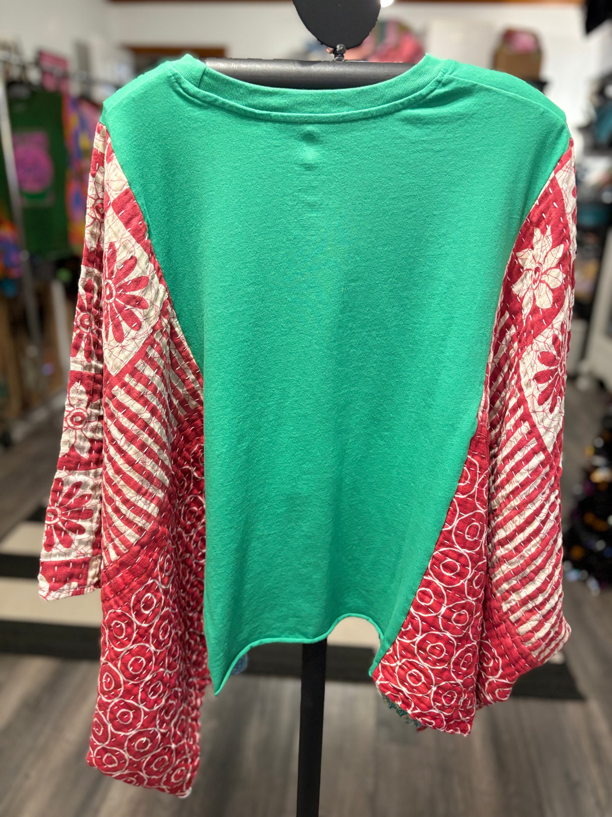 Beautiful vintage Kantha quilt and graphic tee paired to make this FABULOUS Upcycled tee. Vintage Kantha quilts have been well loved. They may have white strings (which can be cut) , slight holes, small stains,and may be weathered, rustic and tattered which all lends to the vintage beauty of the top. Perfectly imperfect!!