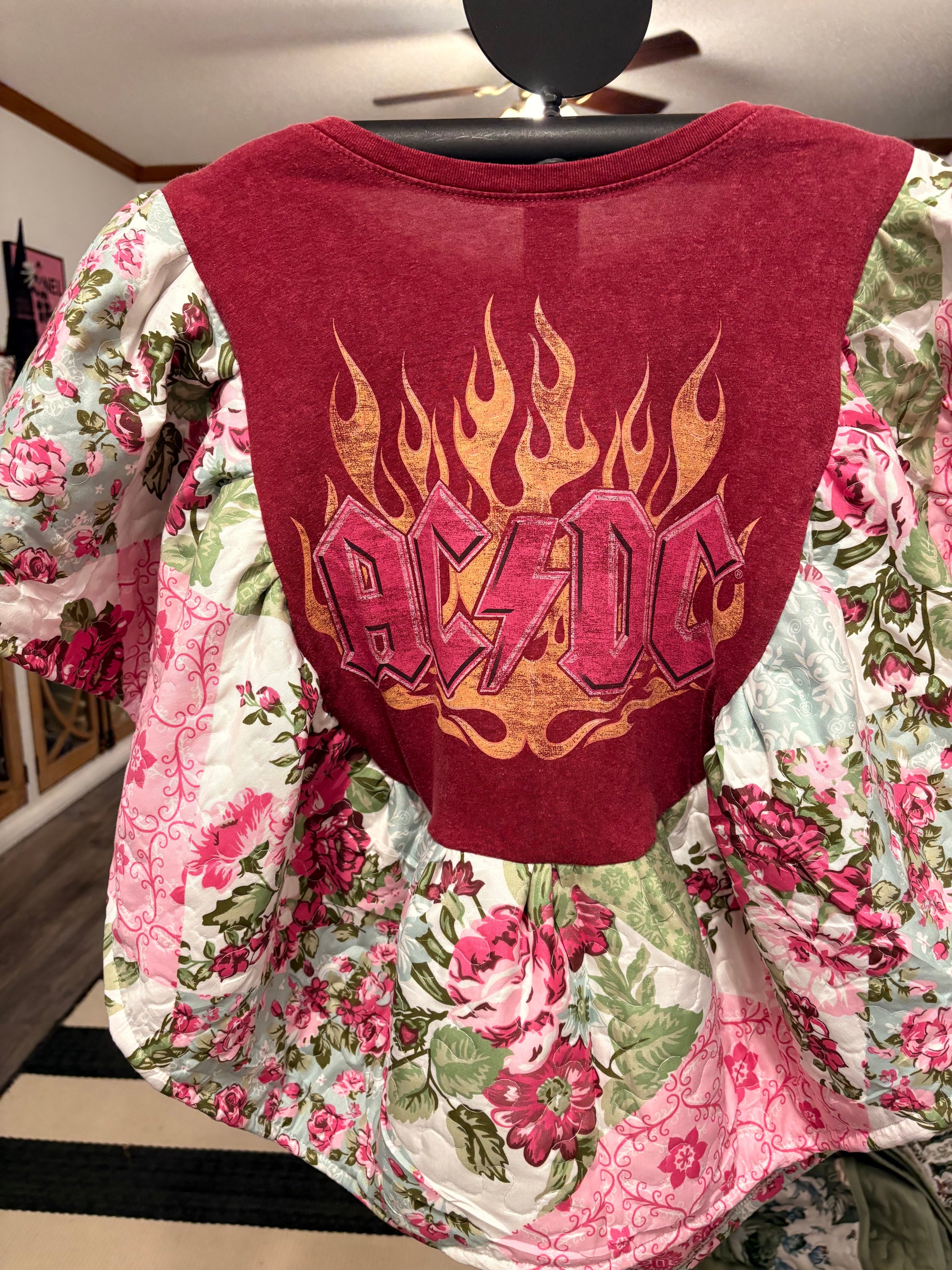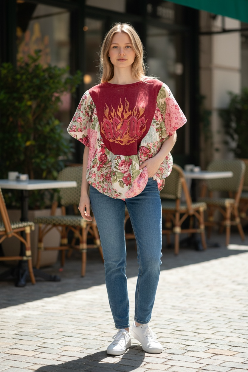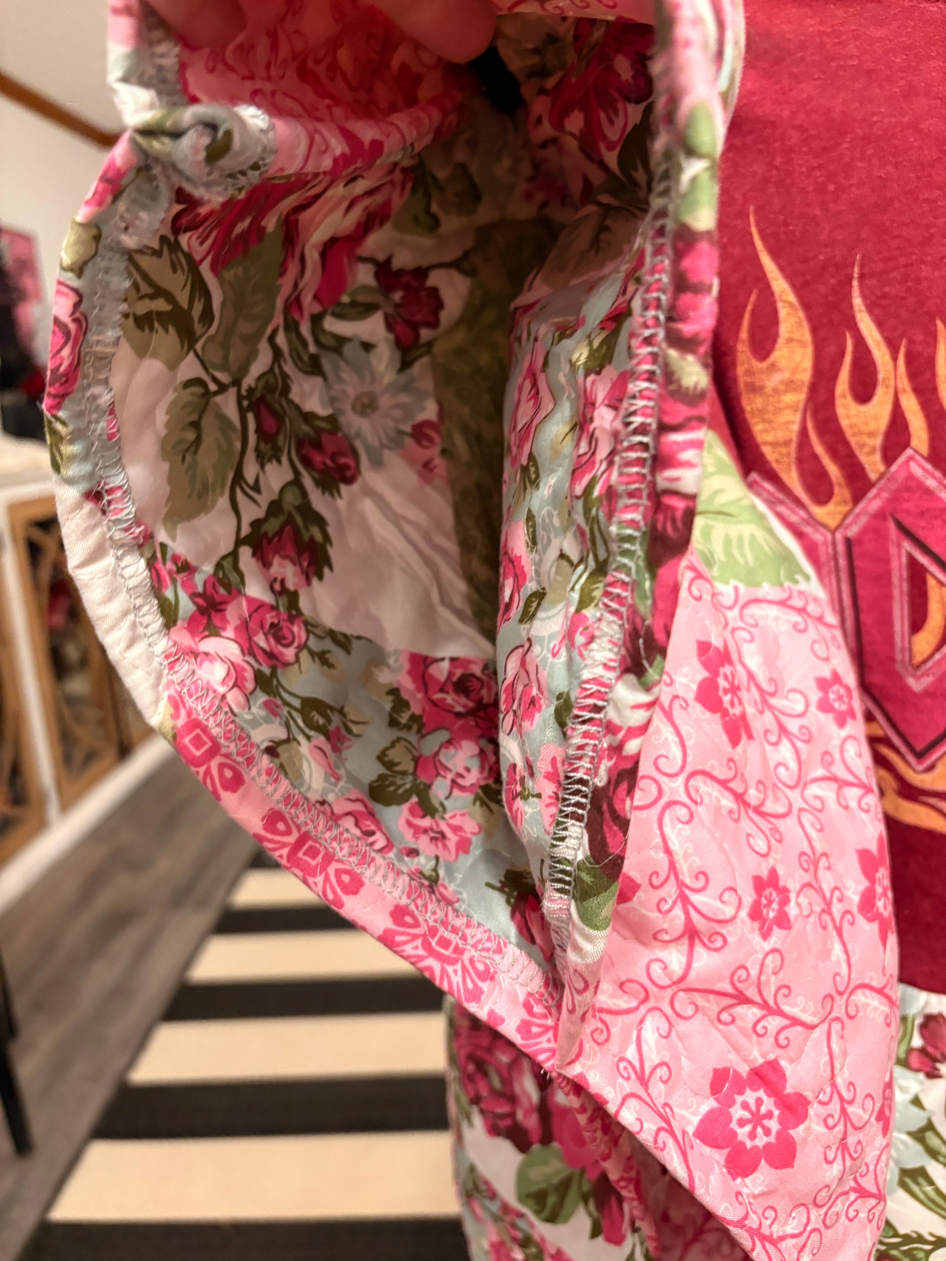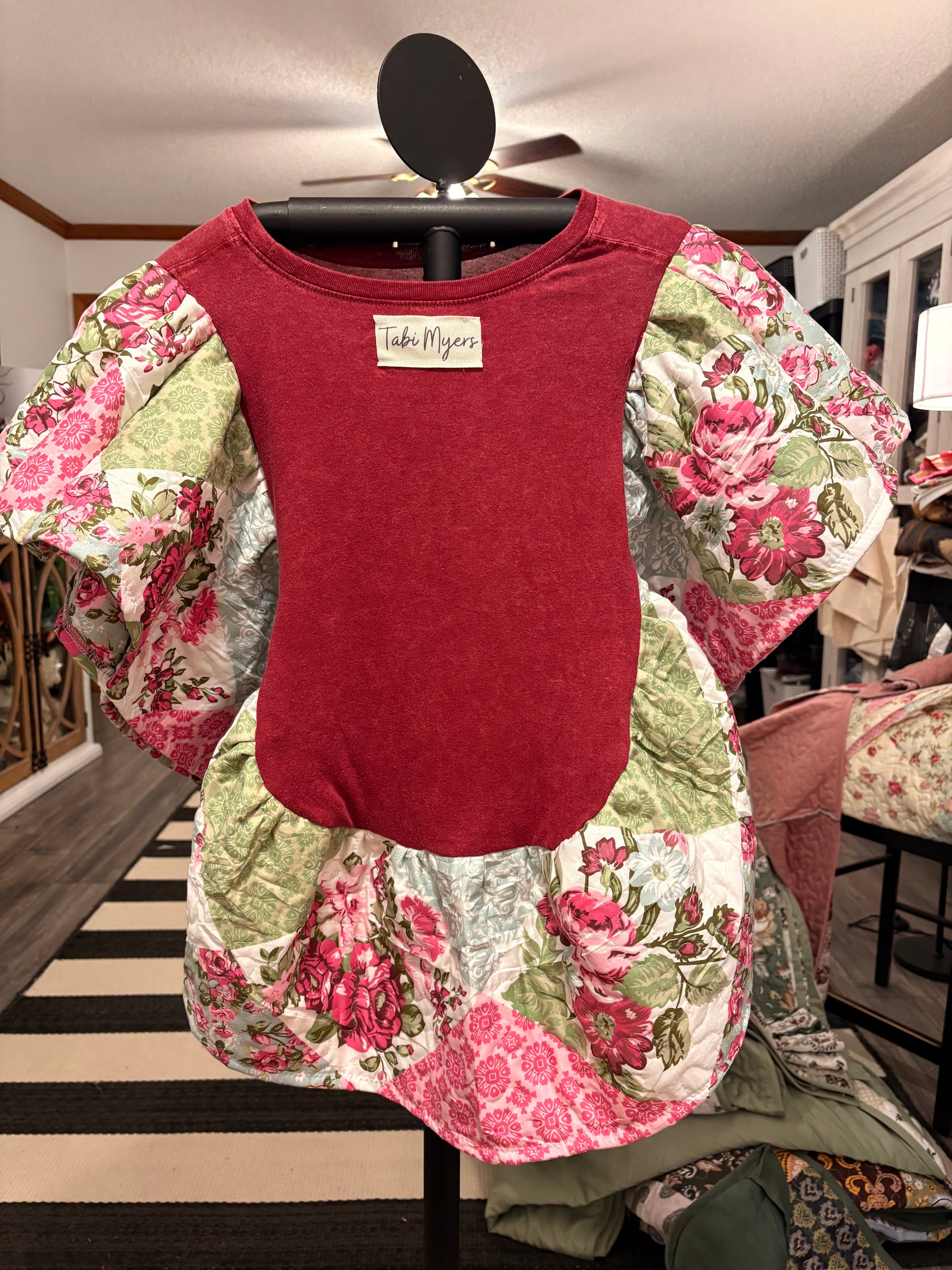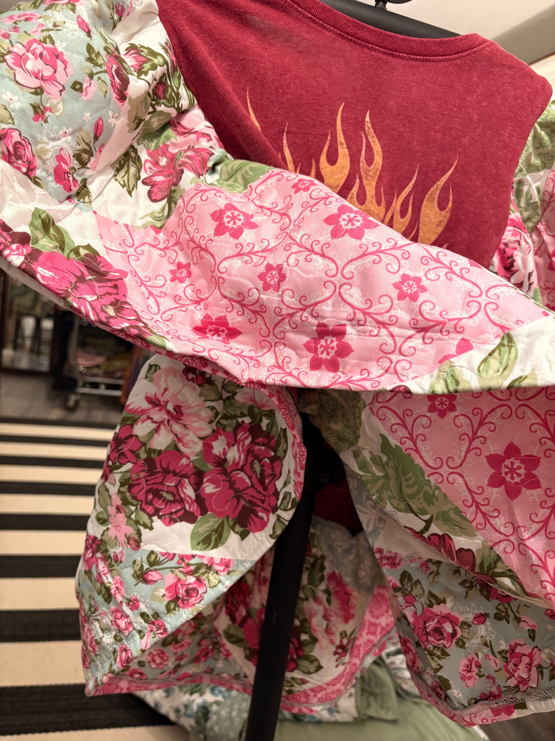 Original Tabi designed graphic tee and quilted fabric used to make this beautiful circle shaped ruffled poncho. Oversized and GORGEOUS poncho! Super cute and cozy!! Perfect for Winter, Spring and Fall. Tee used is an XS. ****Sides are open with small stitches on each to side for arms to go through…*****