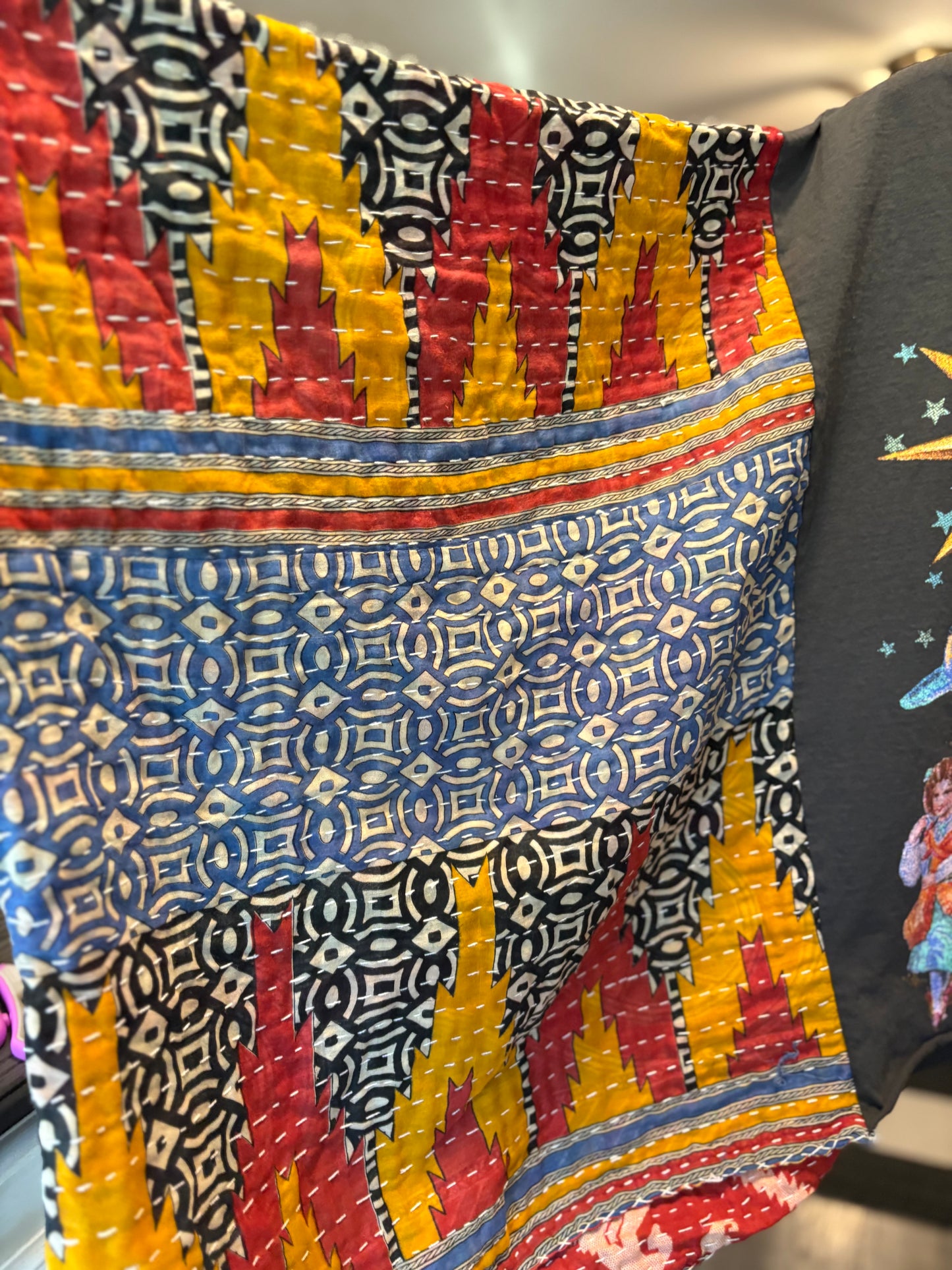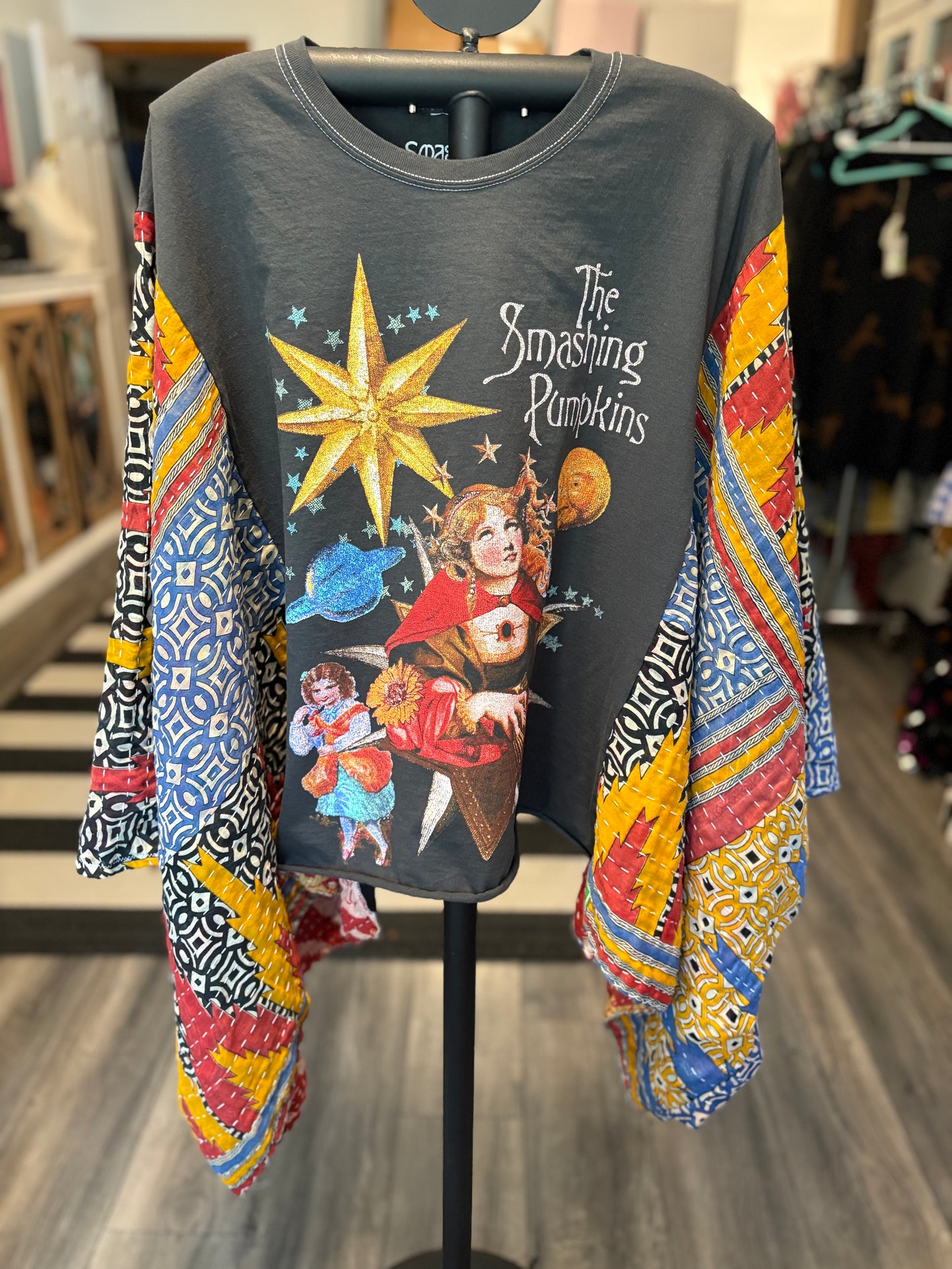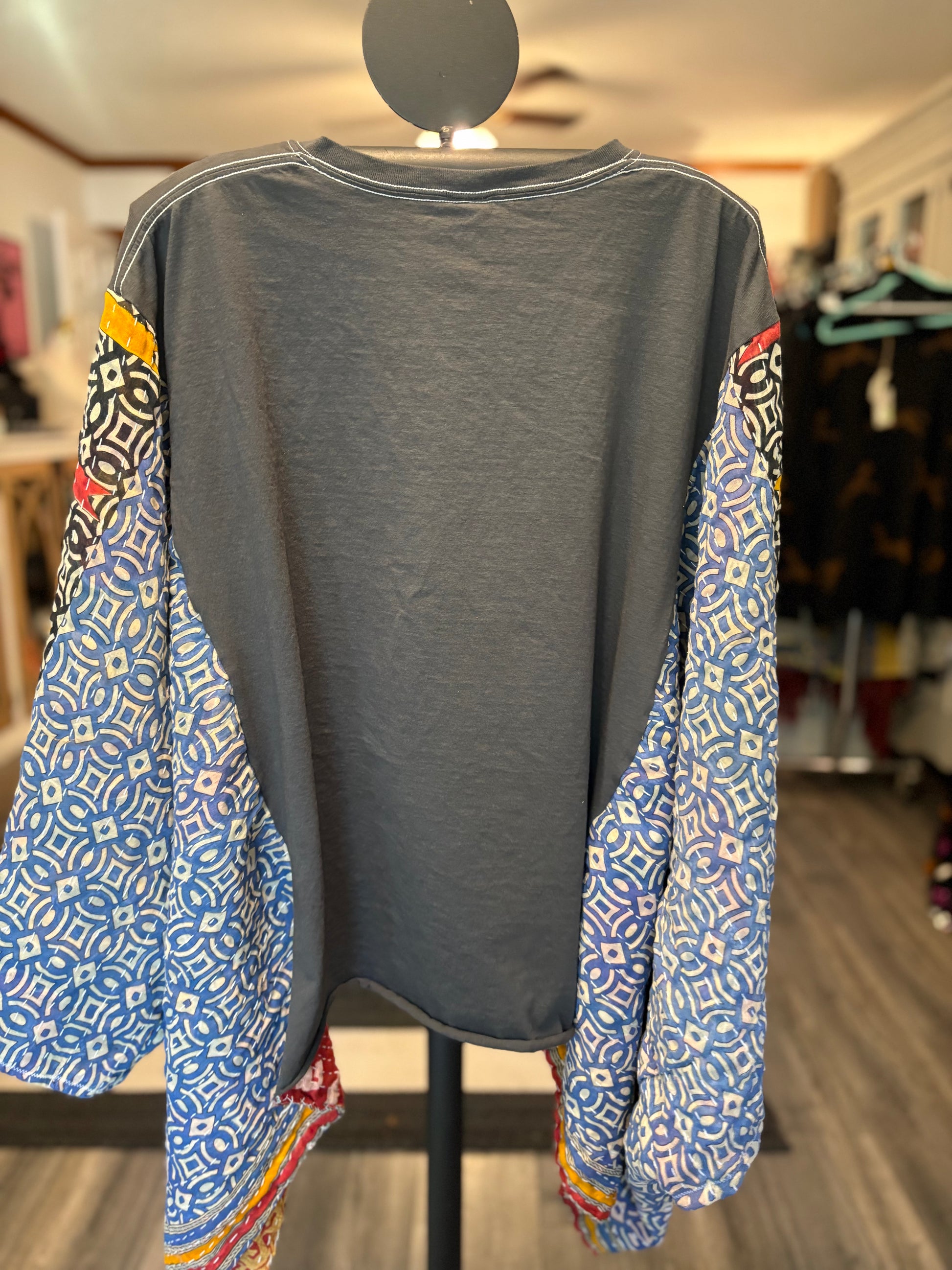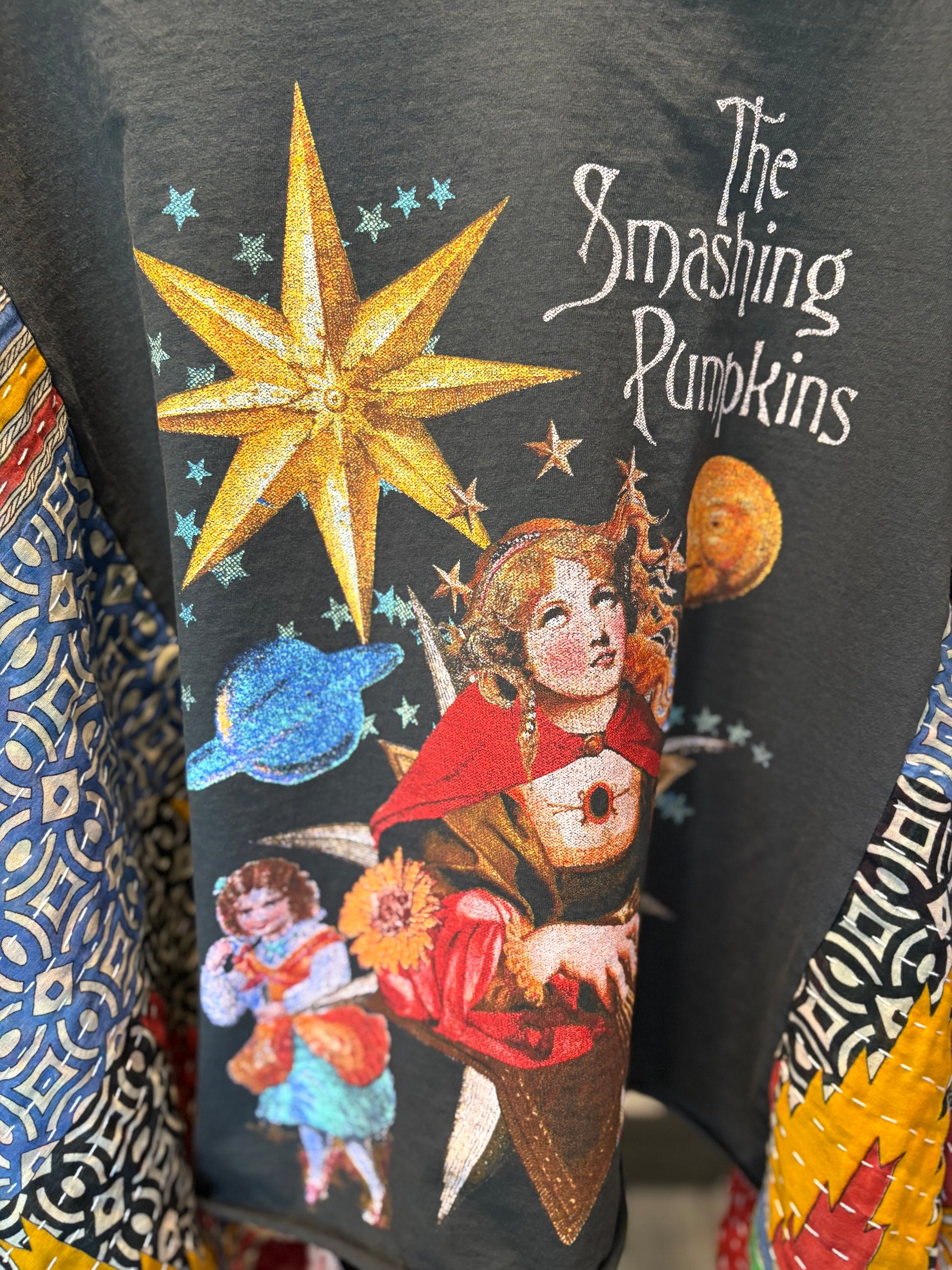 Beautiful vintage Kantha quilt and graphic tee paired to make this FABULOUS Upcycled tee. Vintage Kantha quilts have been well loved. They may have white strings (which can be cut) , slight holes, small stains,and may be weathered, rustic and tattered which all lends to the vintage beauty of the top. Perfectly imperfect!!