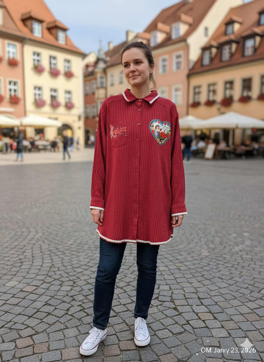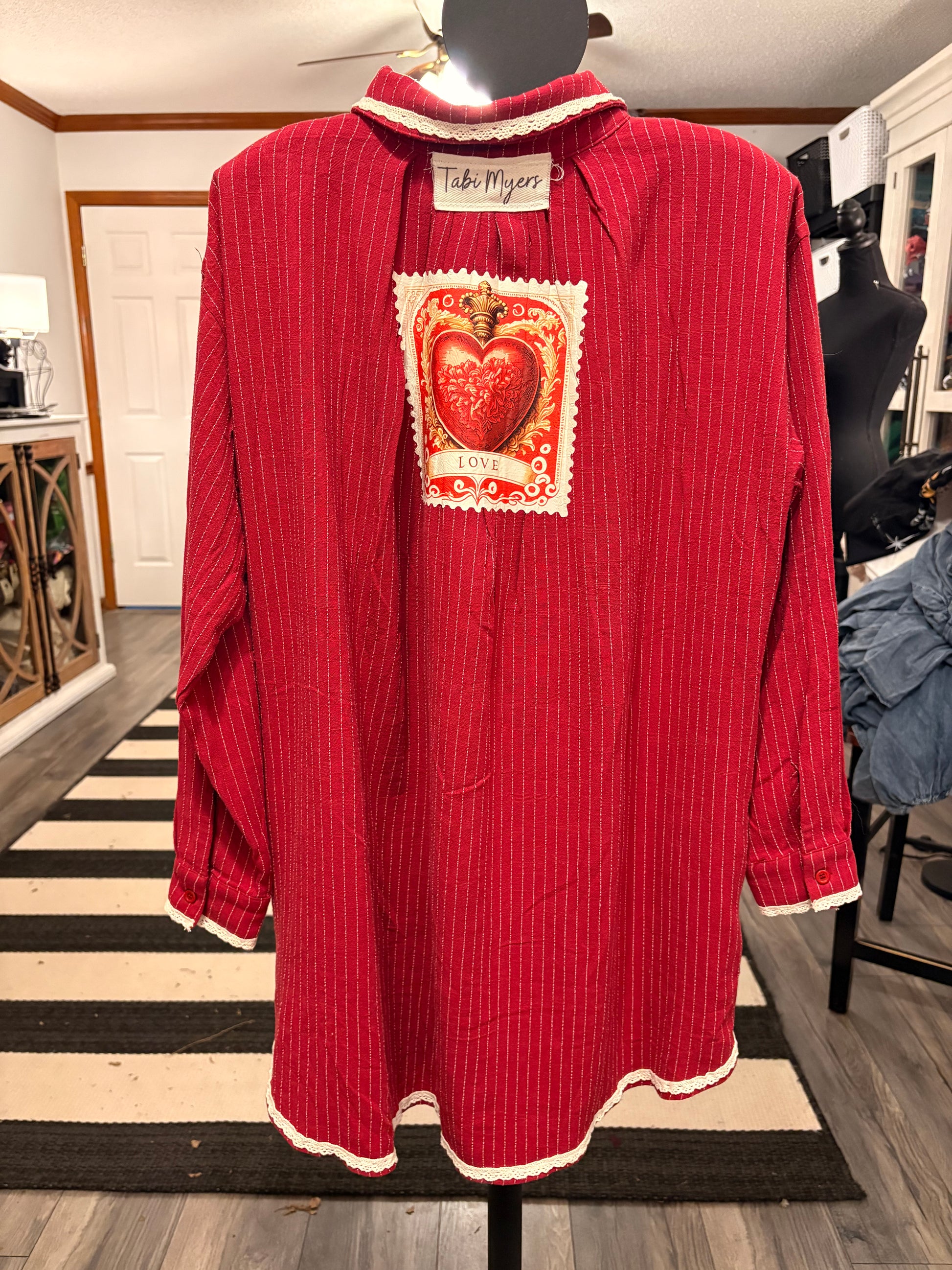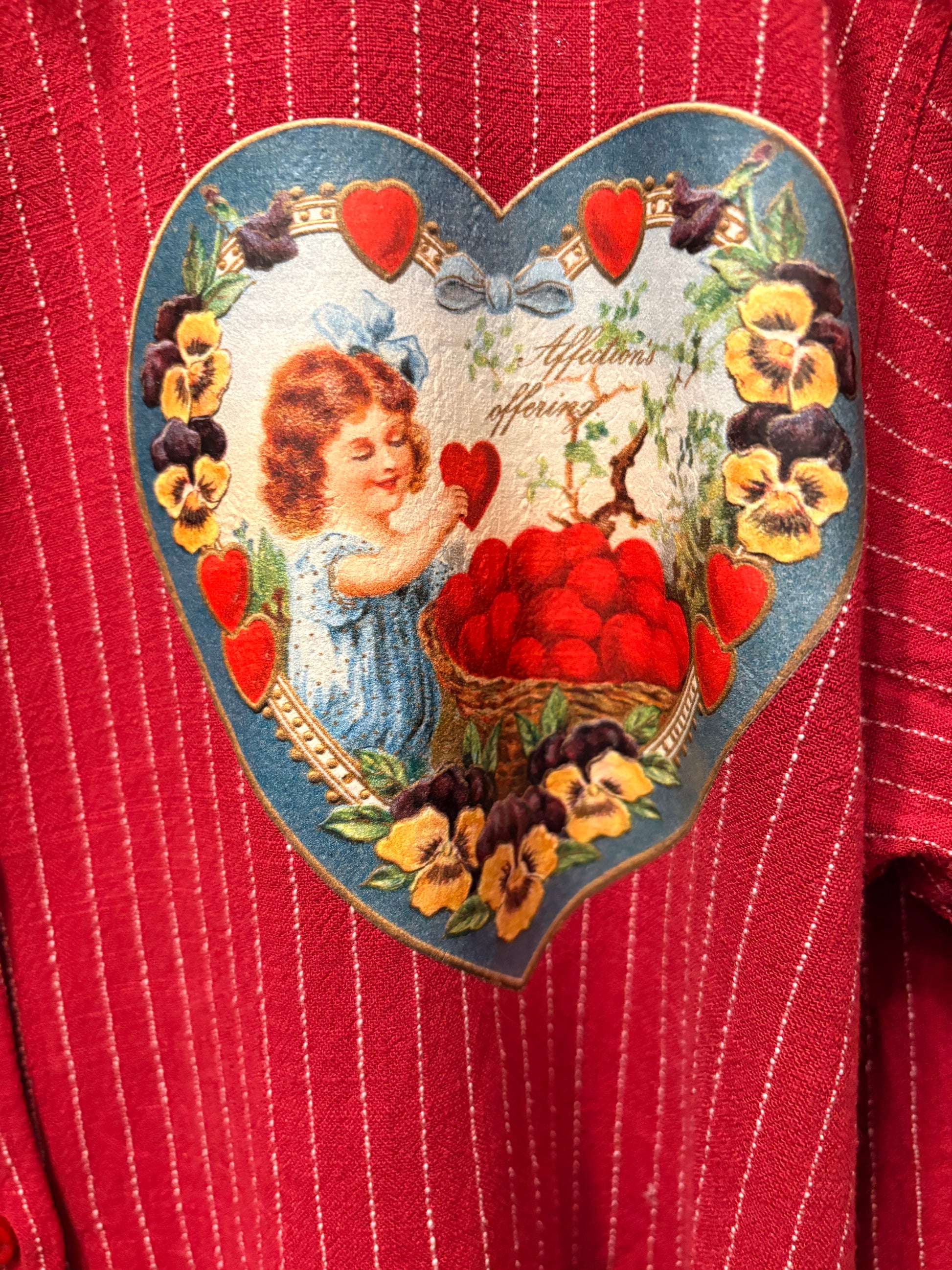Inspired by Junk Journals. Boutique brand button down with pockets. Vintage graphic images, and crochet trim. SEW many beautiful details ❤️