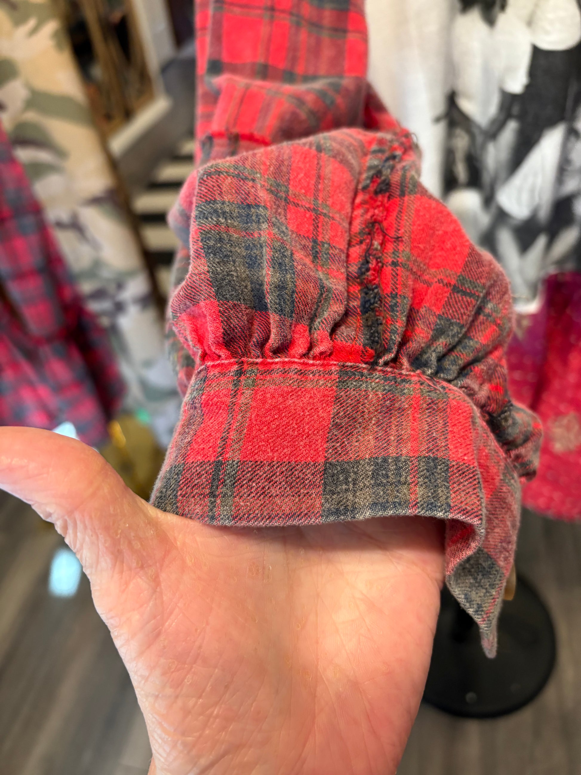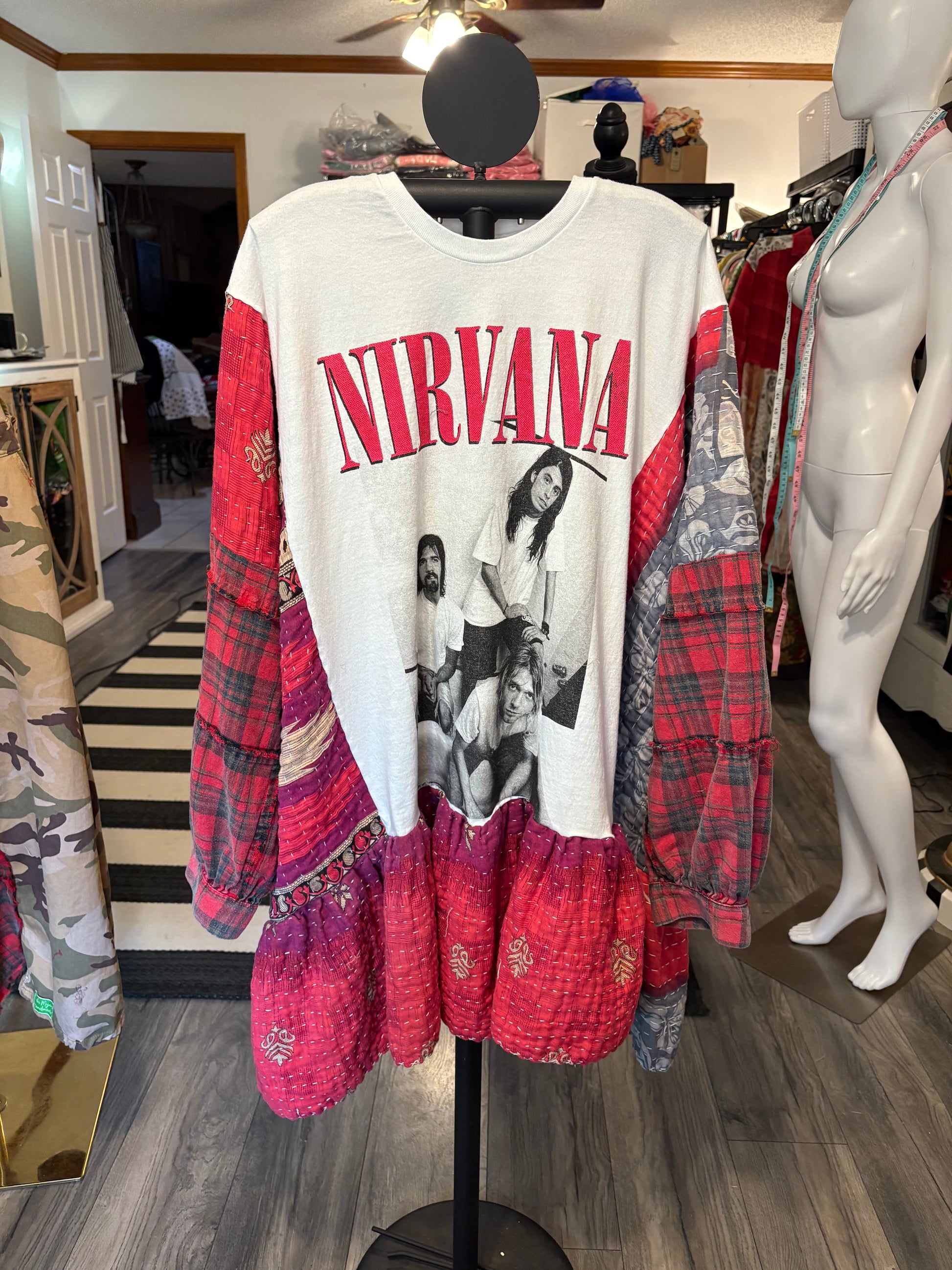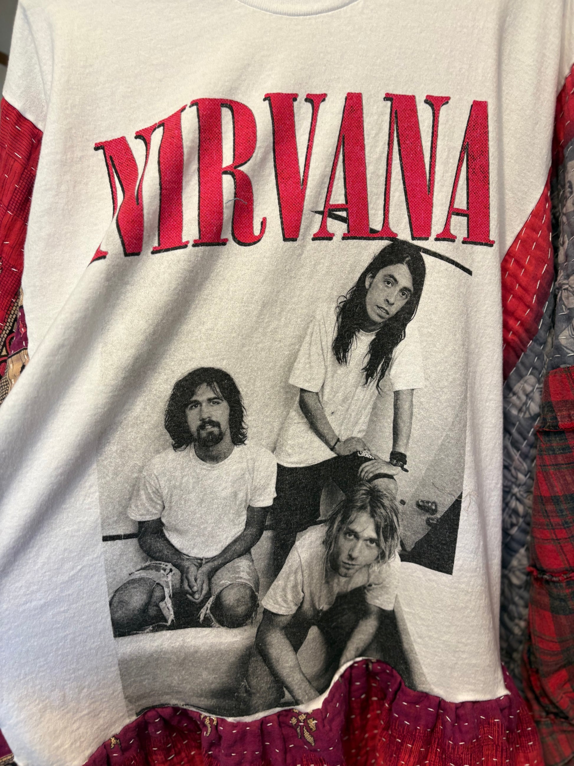 Upcycled graphic tee , flannel sleeves and vintage Kantha quilt used to create this gorgeous top! This top is part of the Love, Tabi Collection.. it is handmade, one of a kind and original design! It will be more oversized the smaller you are. Please check measurements before purchasing!!!!***** ONE SIZE FITS MOST Very OVERSIZED!!! Asymmetrical ruffle flowy and flirty hem!!!