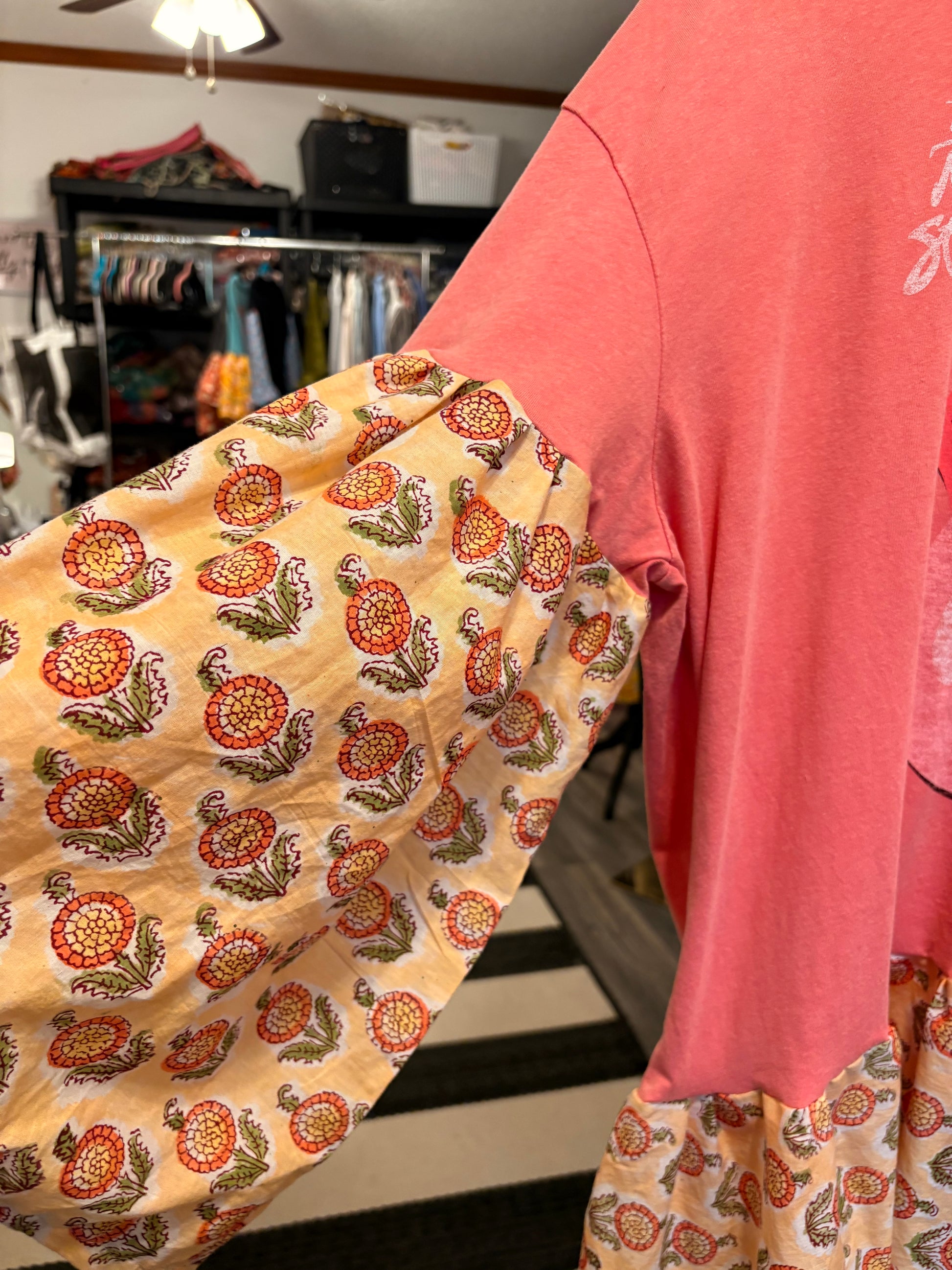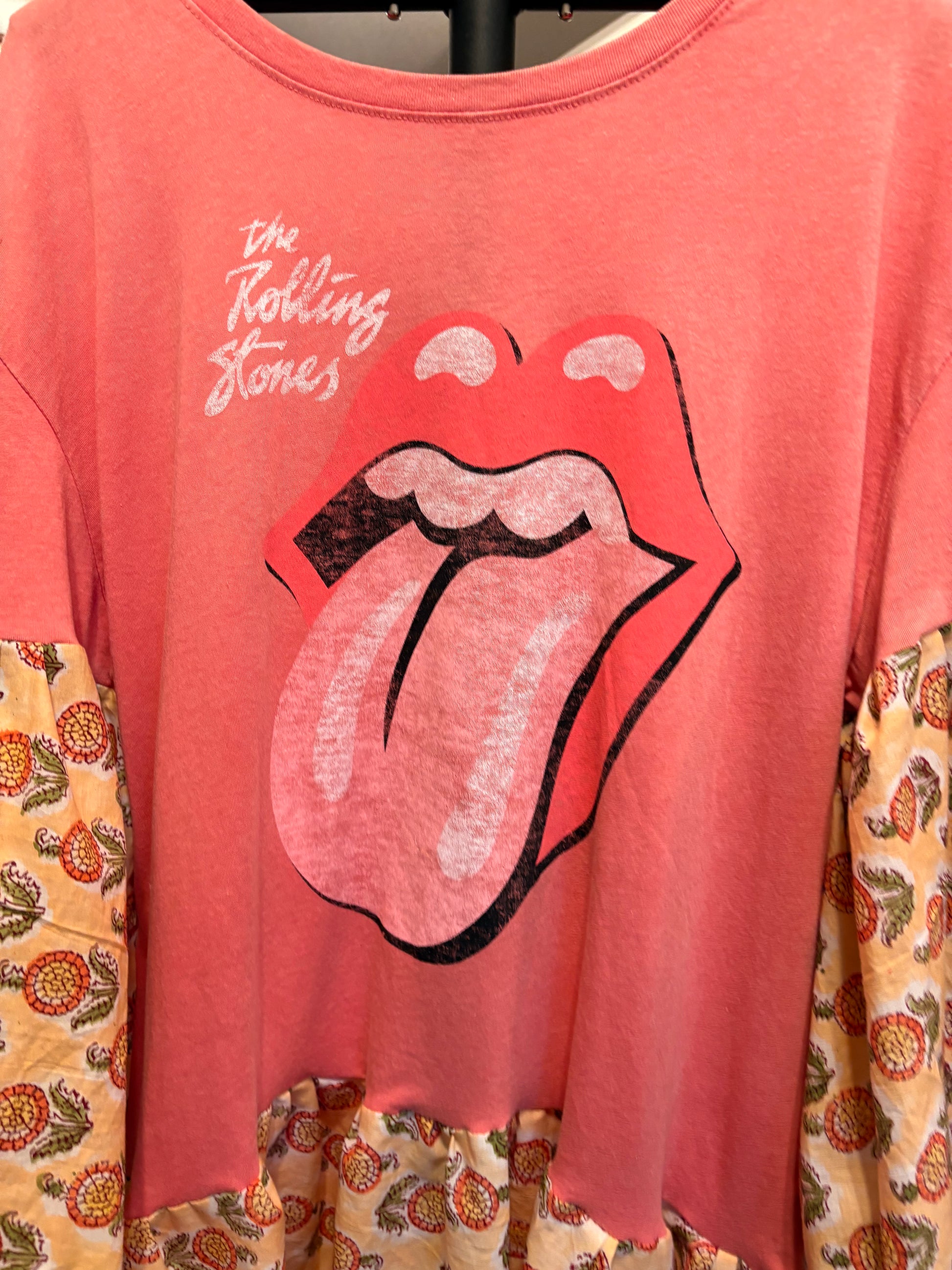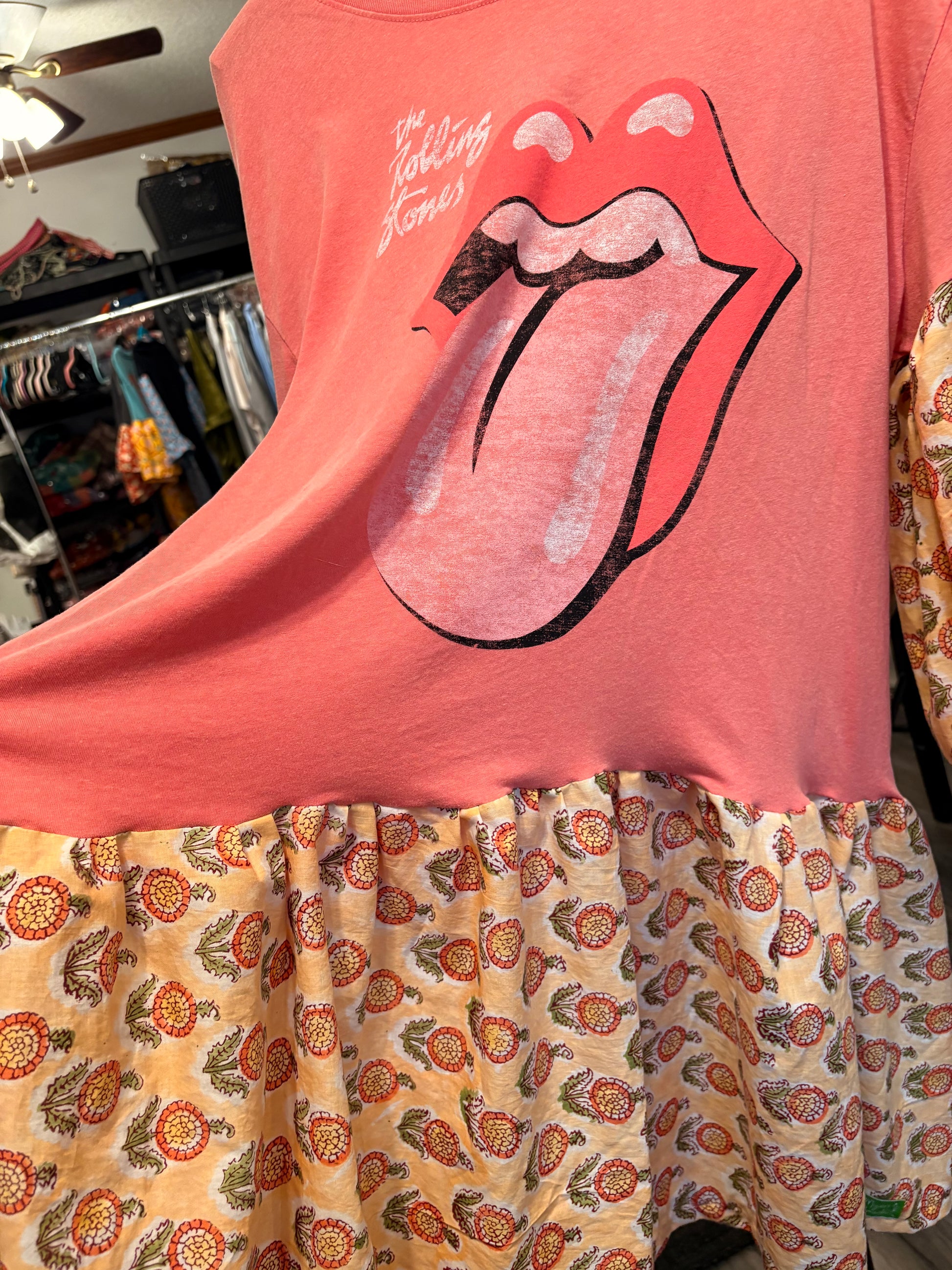 Upcycled rock graphic tee and cotton voile hand blocked fabric paired to make this FABULOUS ruffled dress!! SEW FABULOUS!!!! Has a very wide neckline!!